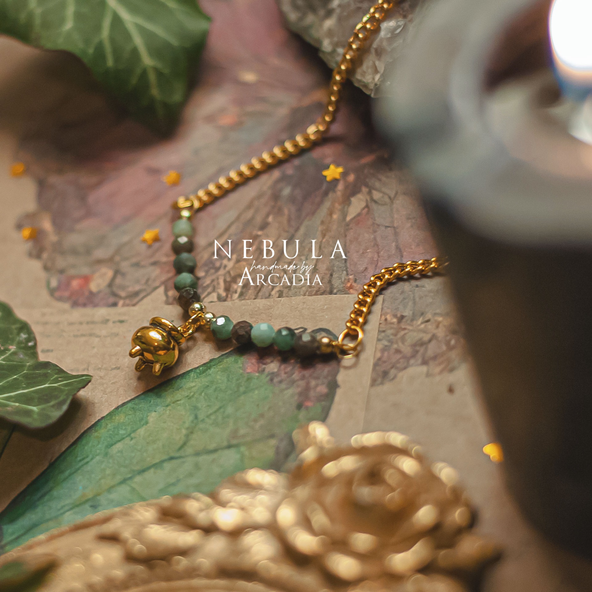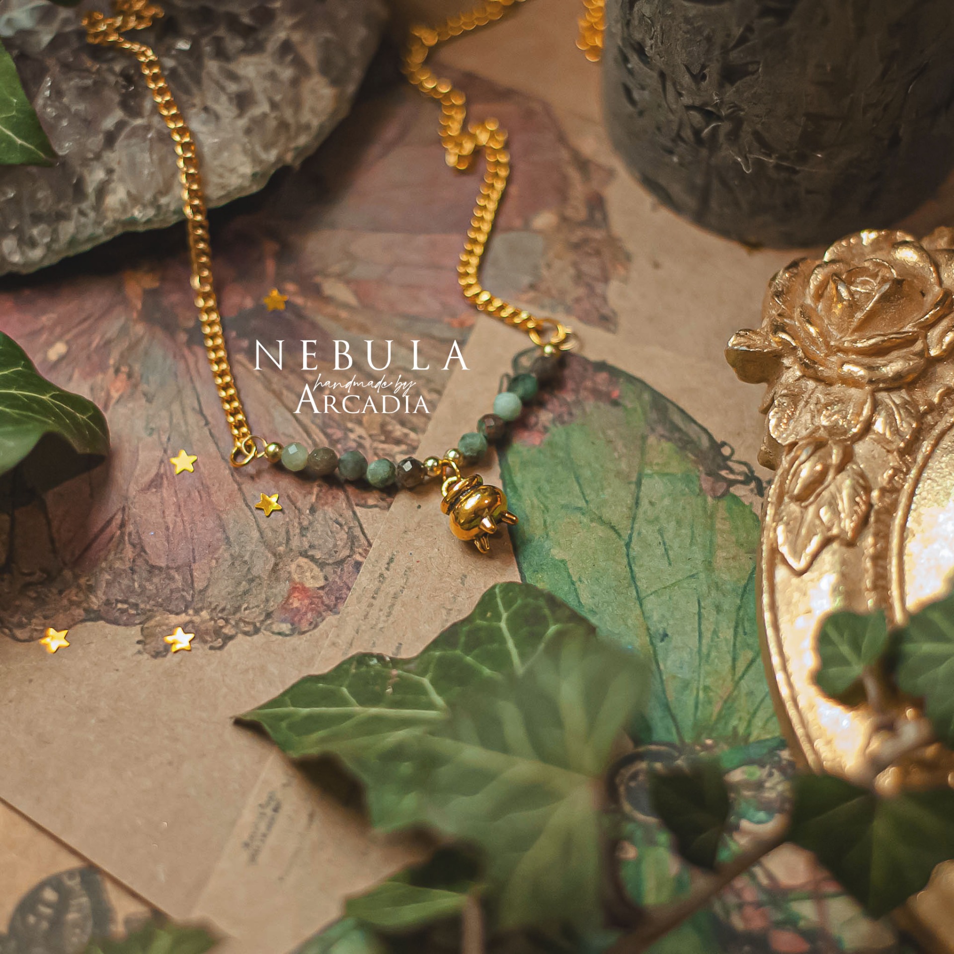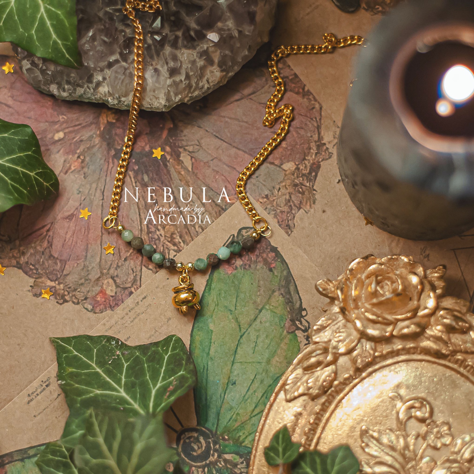 Náhrdelník s perličkami broušeného zelenkavého achátu a mosazným přívěskem čarodějnického kotlíku, nezbytným pomocníkem každé alchymistky i bylinkářky. Vyrobeno rukama a srdcem v alchymistické dílně na severu Čech.