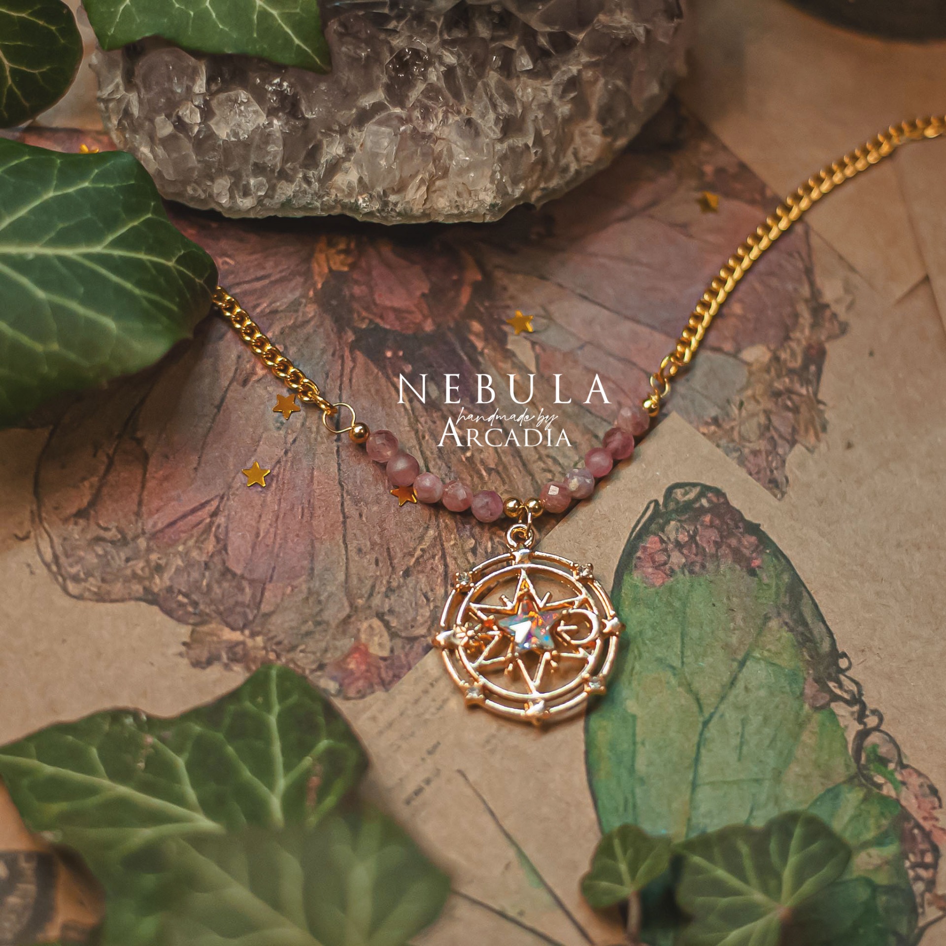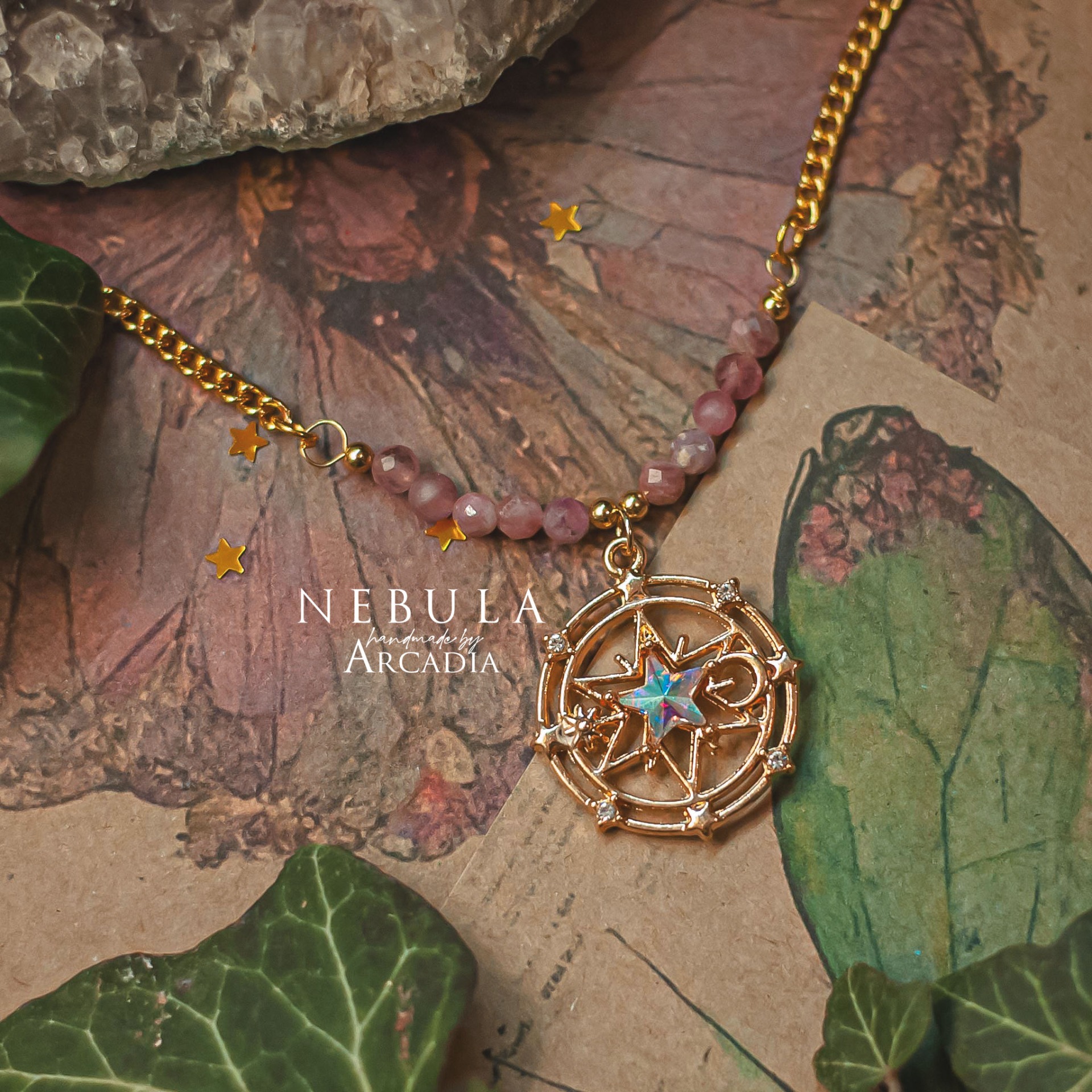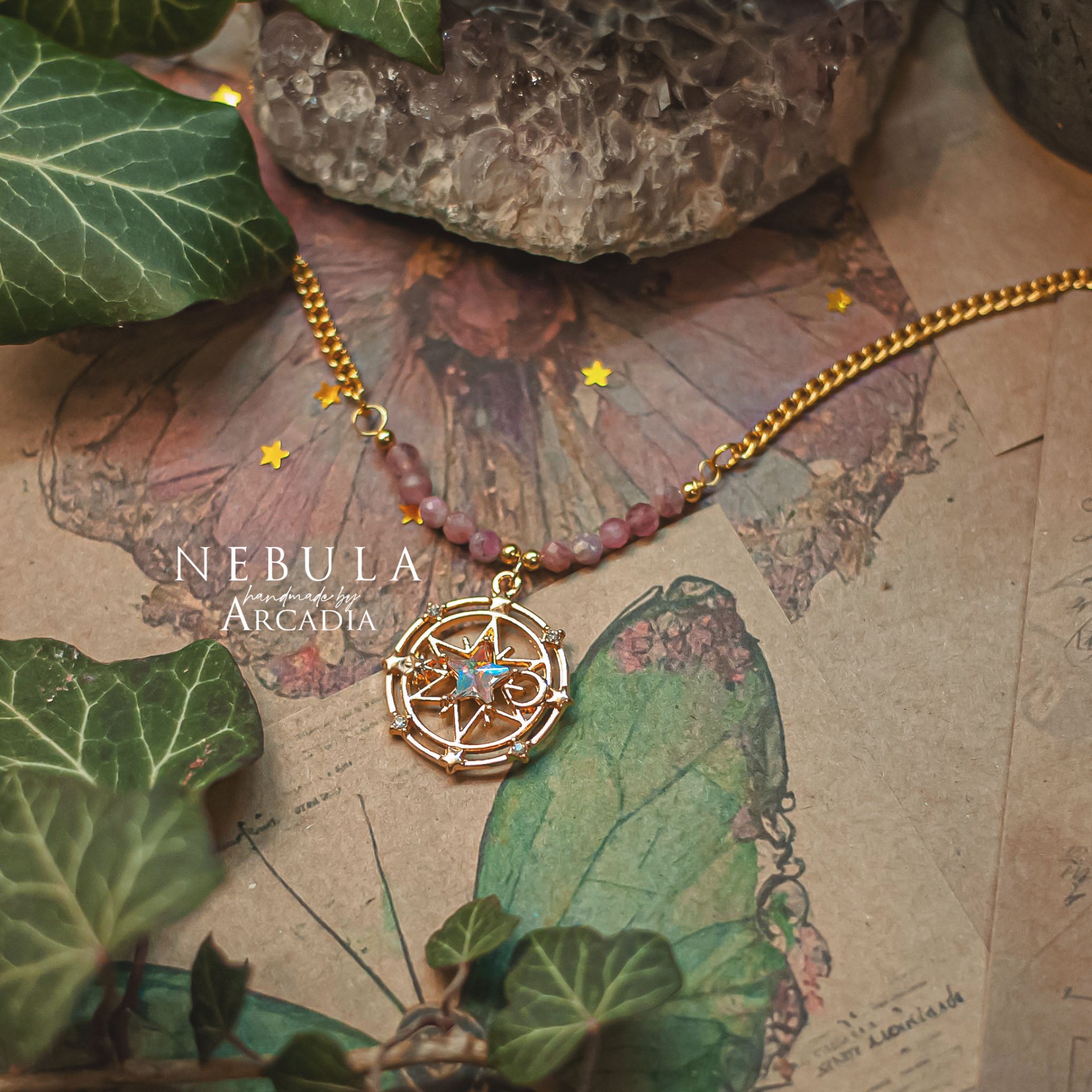 Náhrdelník s perličkami broušeného růžového turmalínu a mosazným přívěskem, reprezentující tarotovou kartu Kola štěstí. Karta kola štěstí symbolizuje životní i přírodní cykly, moc osudu a nevyhnutelné změny, kterými vás tento amulet provede bez úhony. Vyrobeno rukama a srdcem v alchymistické dílně na severu Čech.