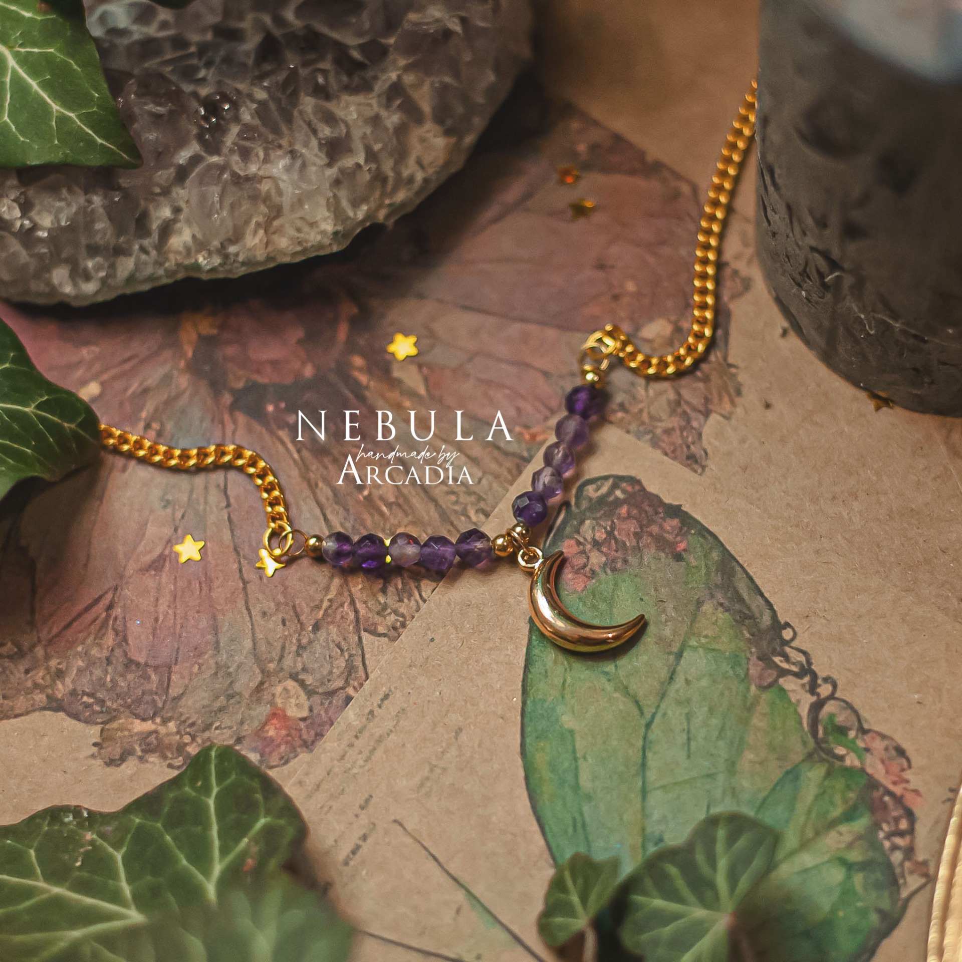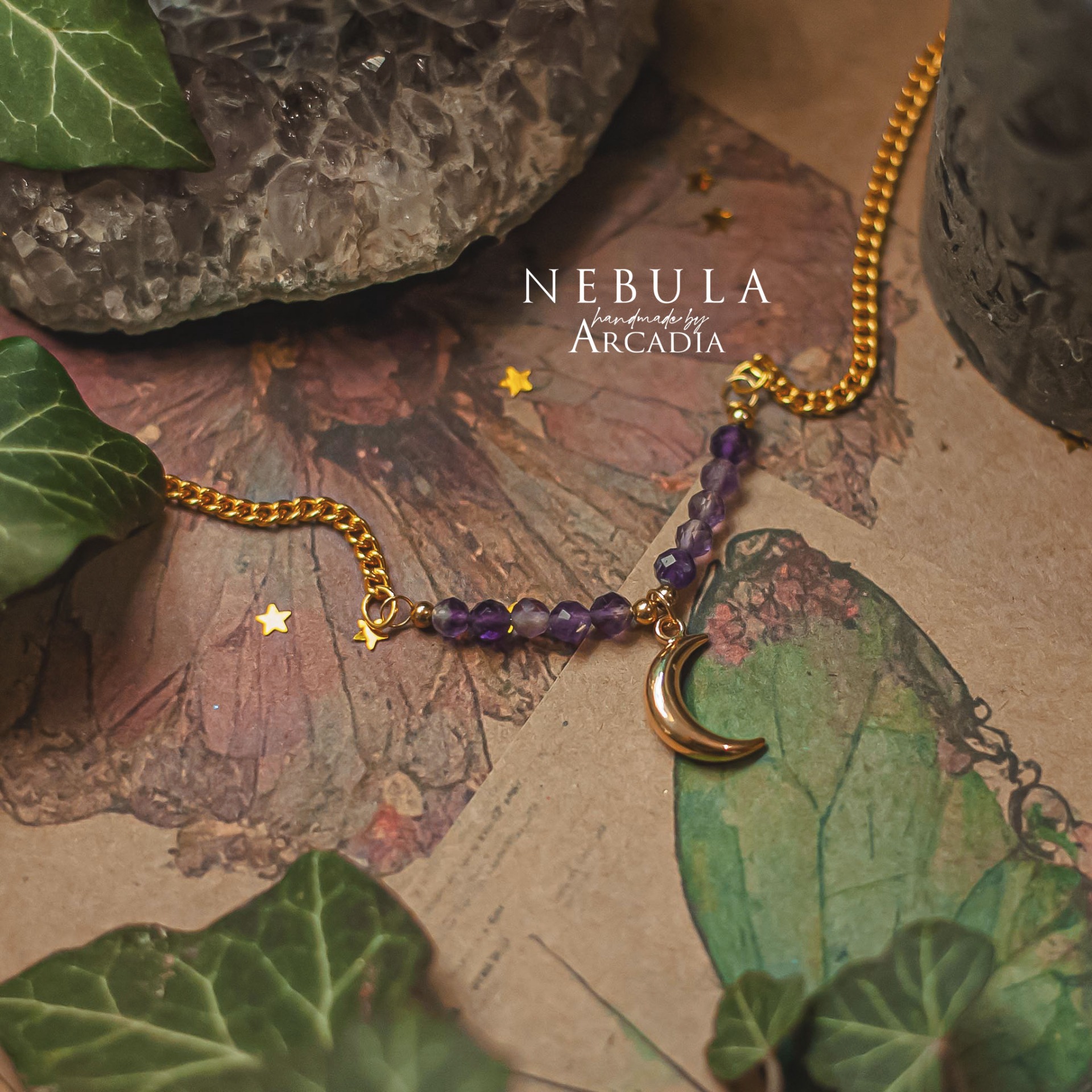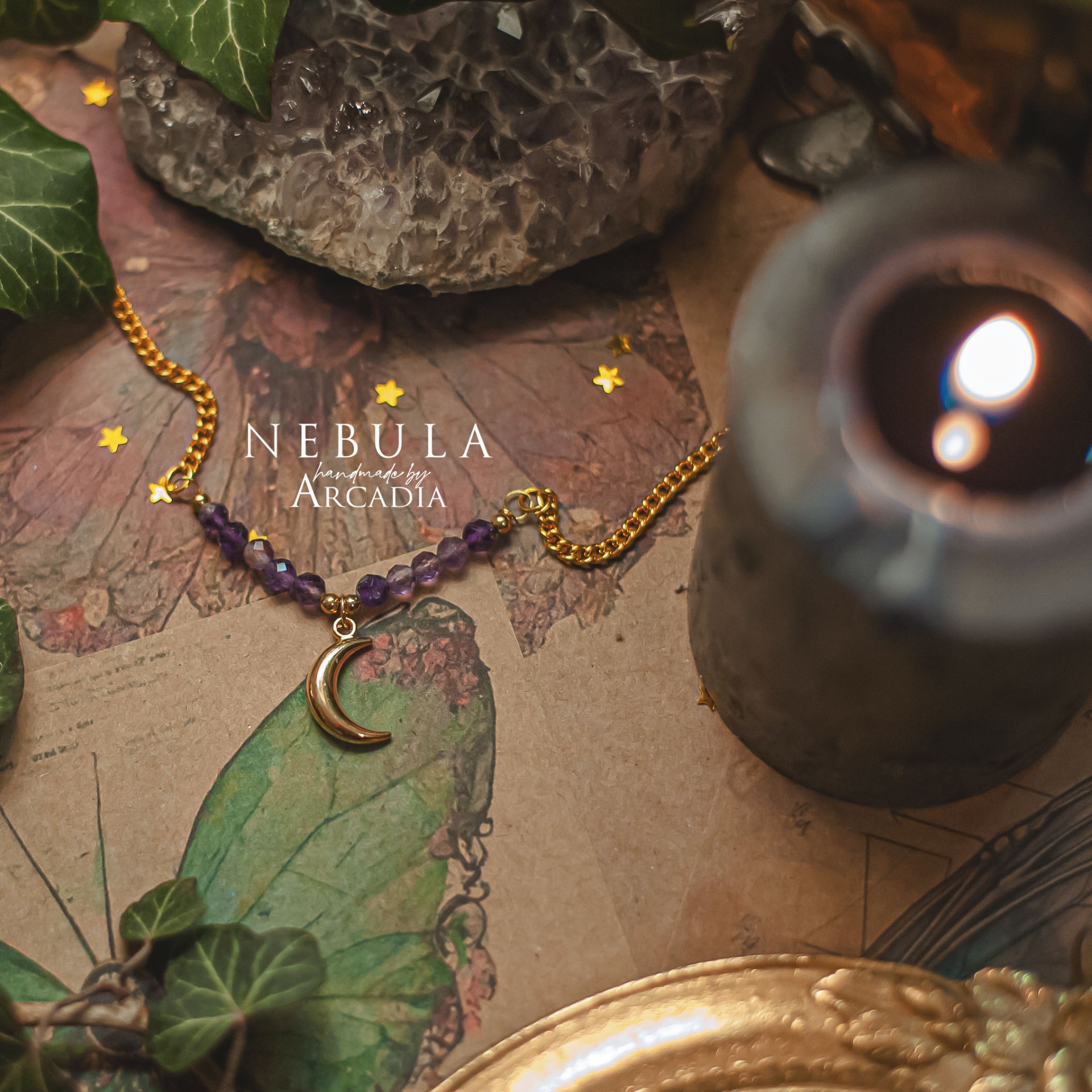 Náhrdelník s perličkami broušeného ametystu a mosazným přívěskem, reprezentující tarotovou kartu Měsíce. Karta Měsíce symbolizuje stínový svět odrazů, iluzí a skrytých pravd. Amulet vám pomůže prohlédnout přes zrcadla a kouř, nebo se do něj naopak zahalit, je-li to právě potřeba. Vyrobeno rukama a srdcem v alchymistické dílně na severu Čech.