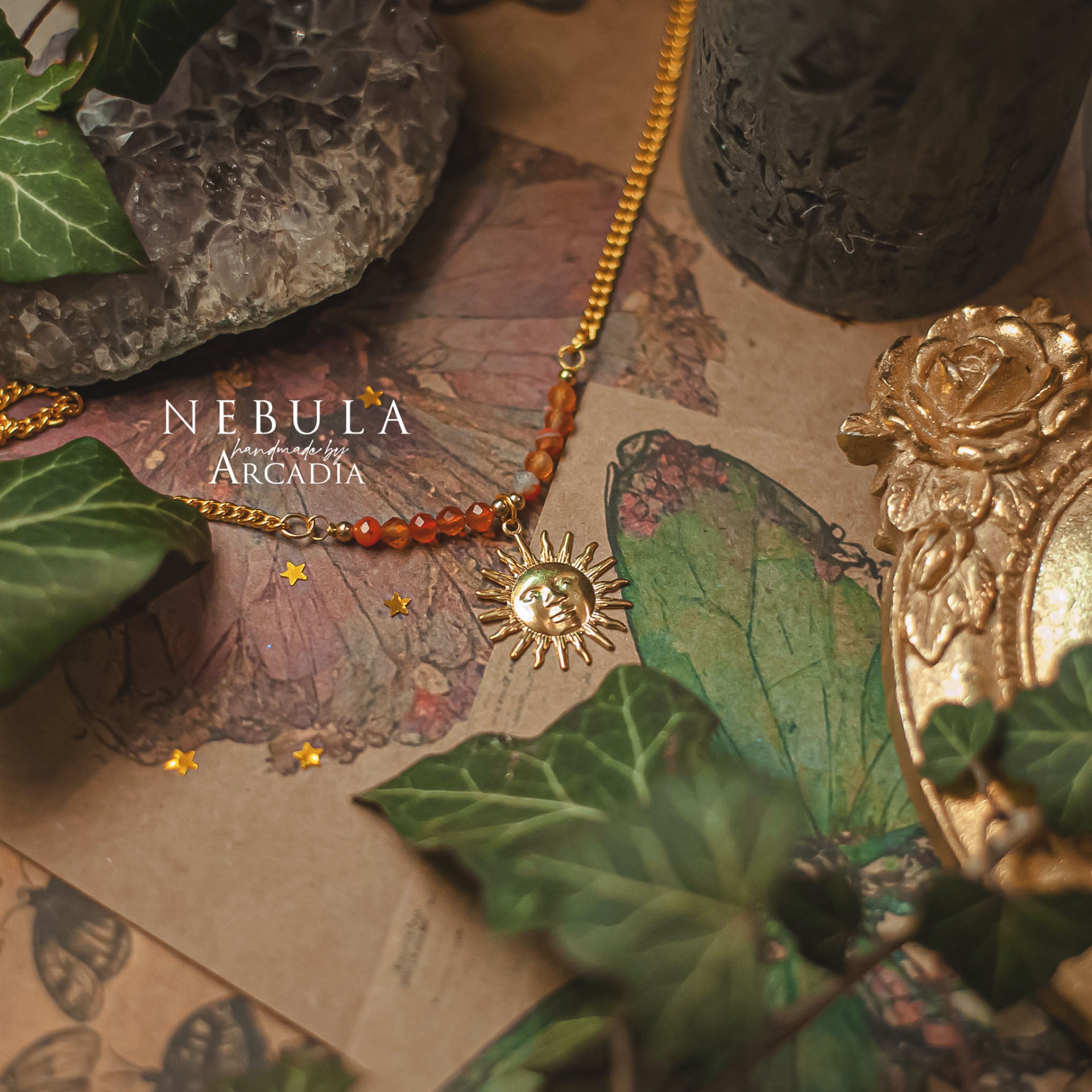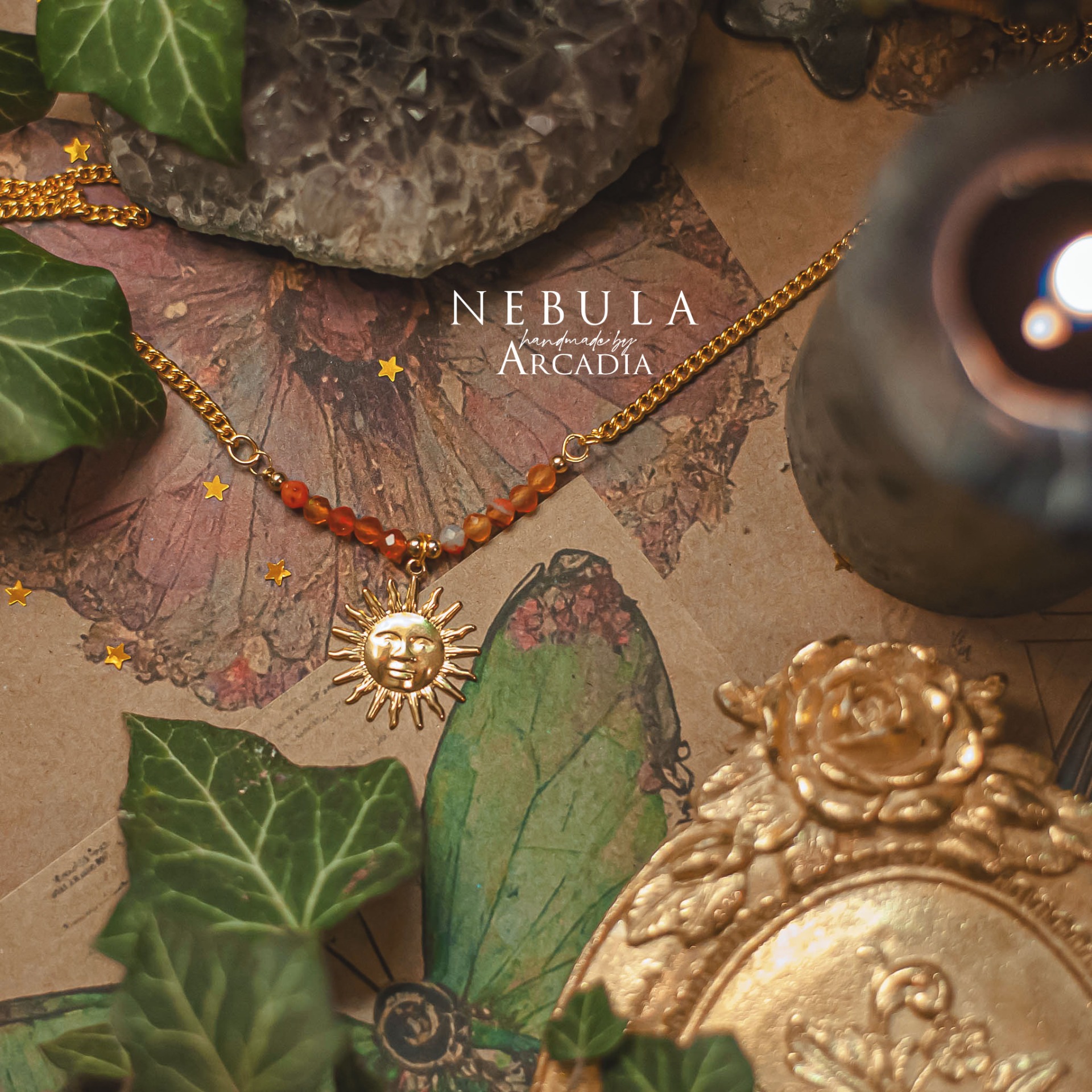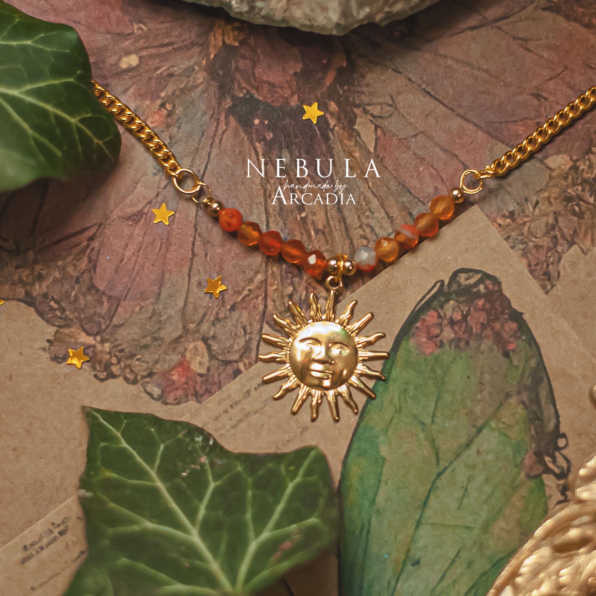 Náhrdelník s perličkami broušeného karneolu a mosazným přívěskem, reprezentující tarotovou kartu Slunce. Karta Slunce s sebou přináší hojnost, radost, úspěch a příval životní energie. Sluneční amulet je tak ideálním průvodcem pro zimní měsíce či jiná období temna. Vyrobeno rukama a srdcem v alchymistické dílně na severu Čech.