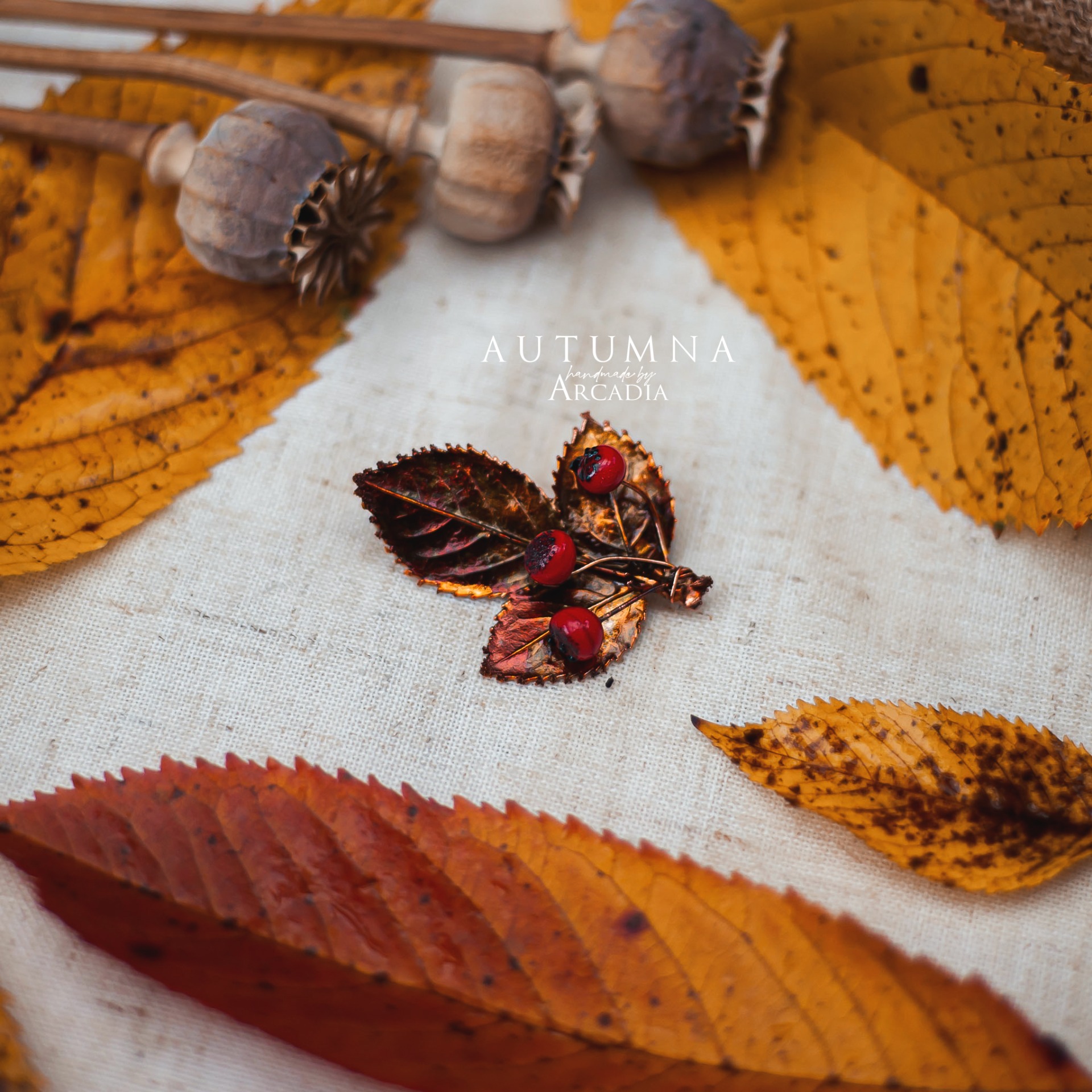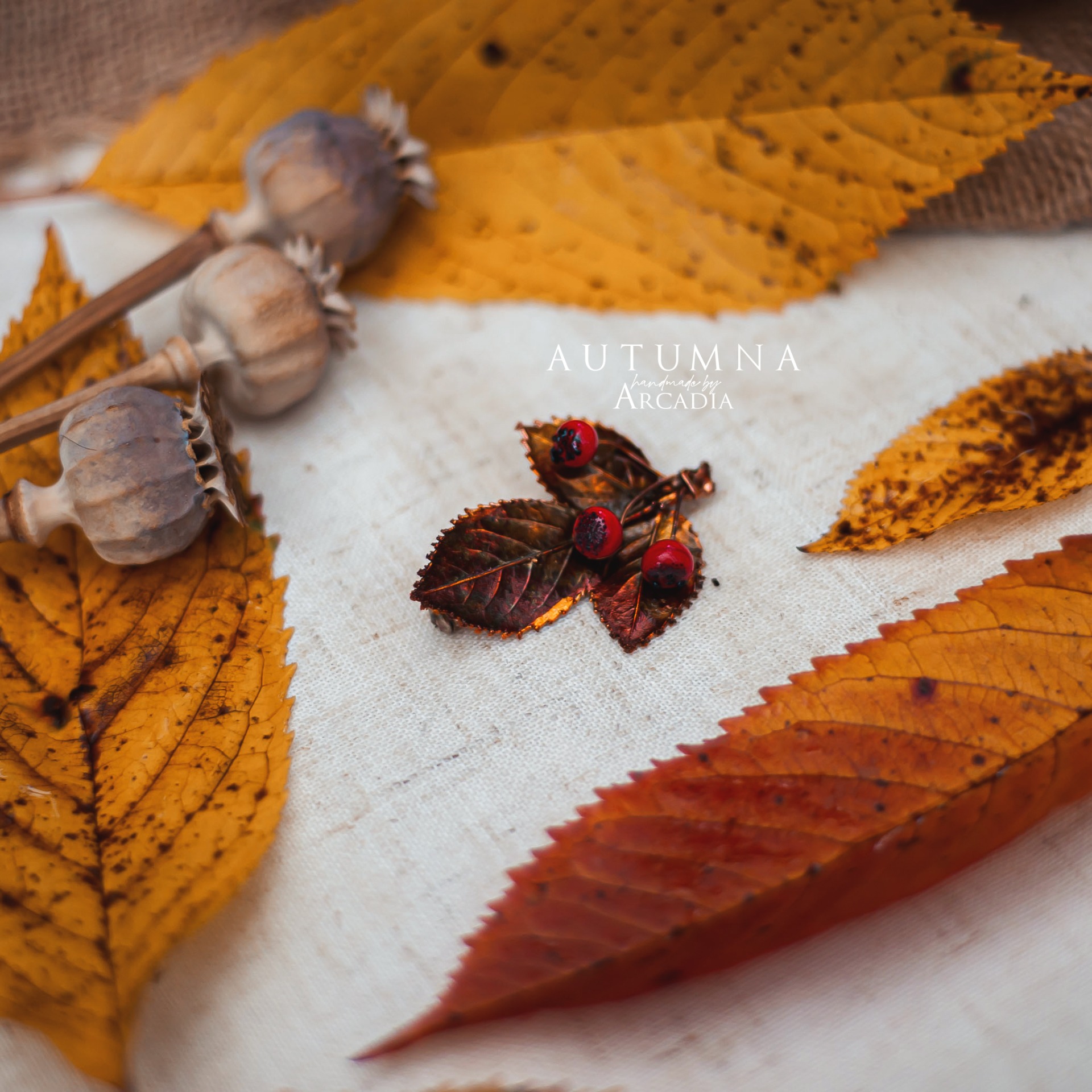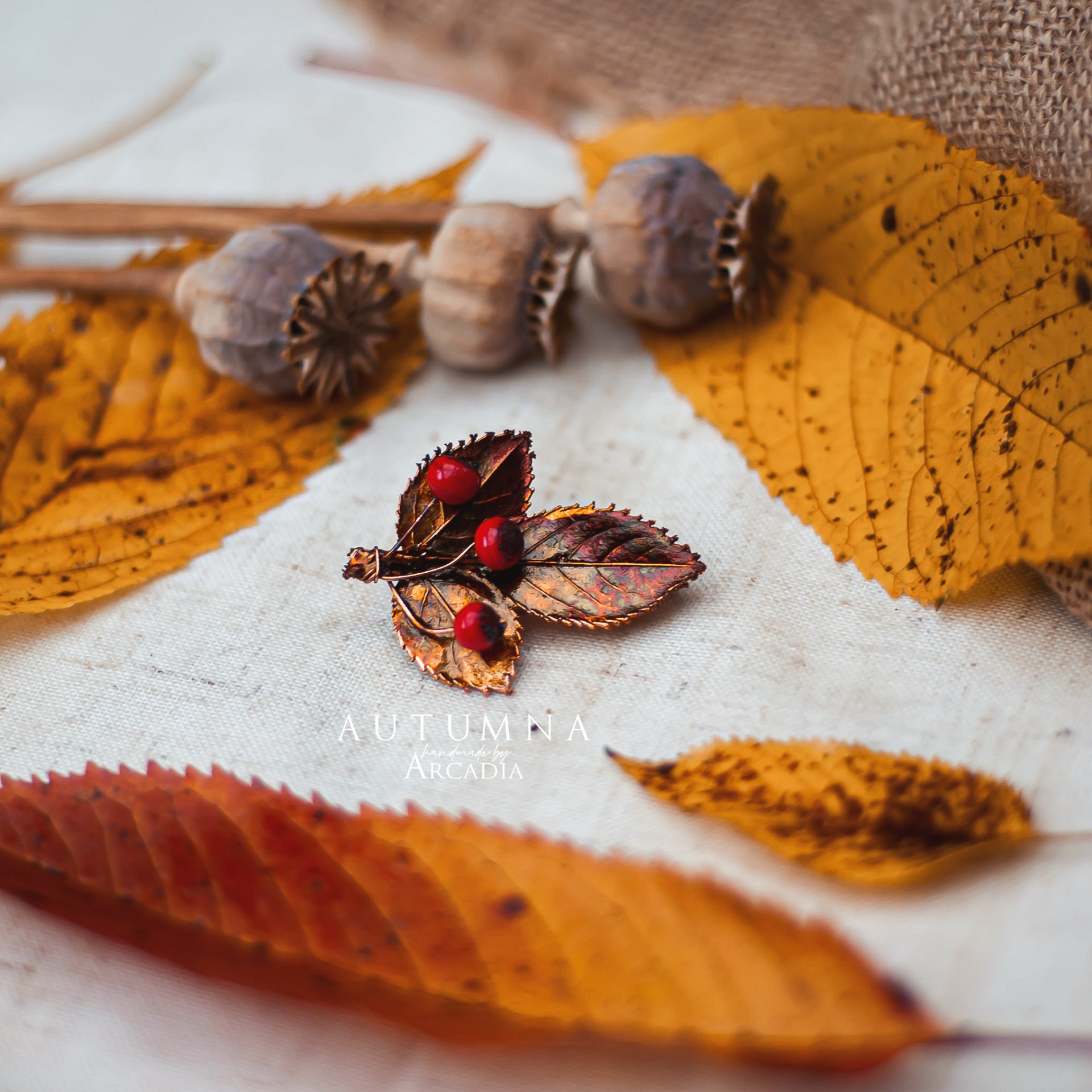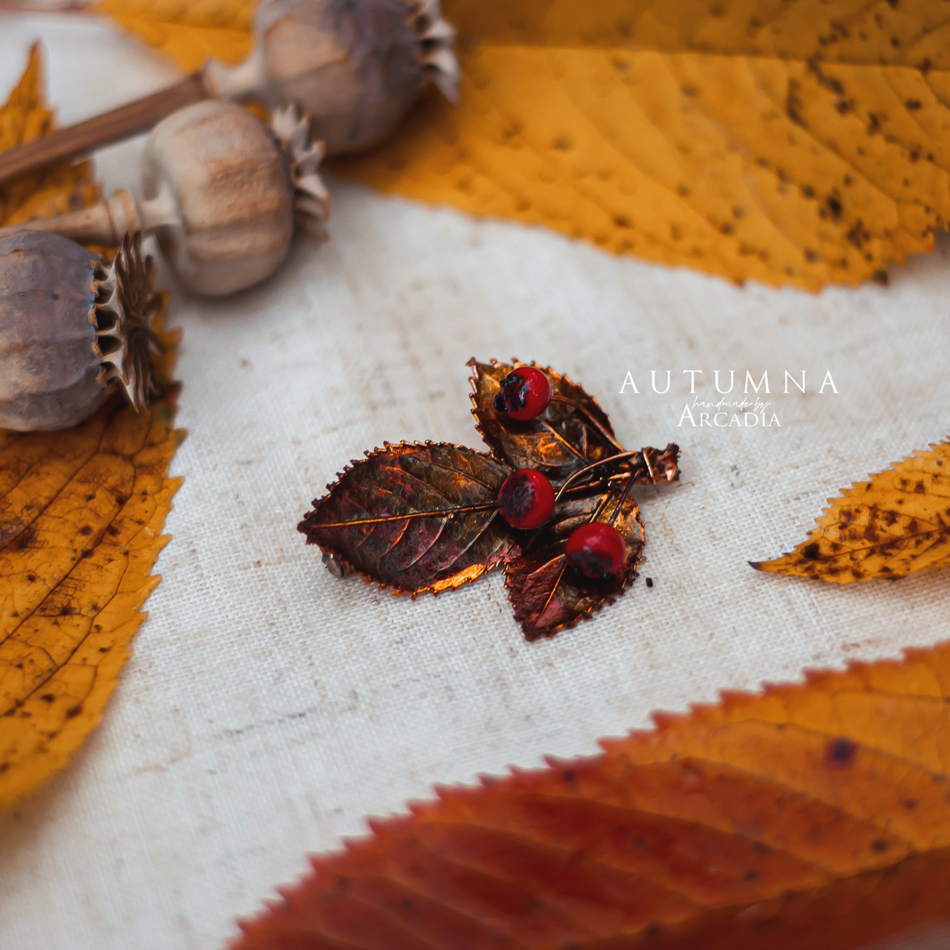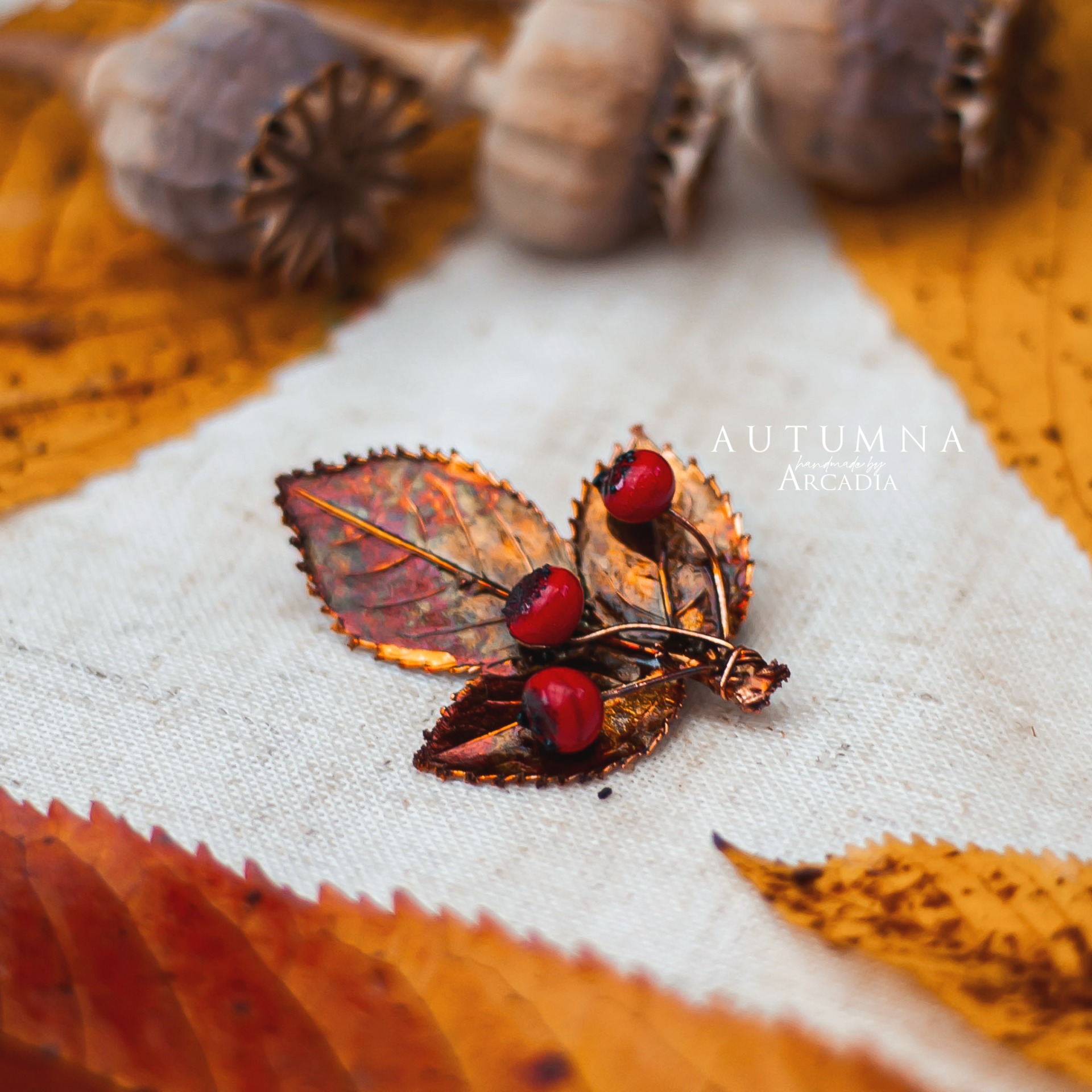 Brož ze skutečného pokoveného lístku s bobulkami z českého ručně vinutého skla. Vyrobeno rukama a srdcem v alchymistické dílně na severu Čech.