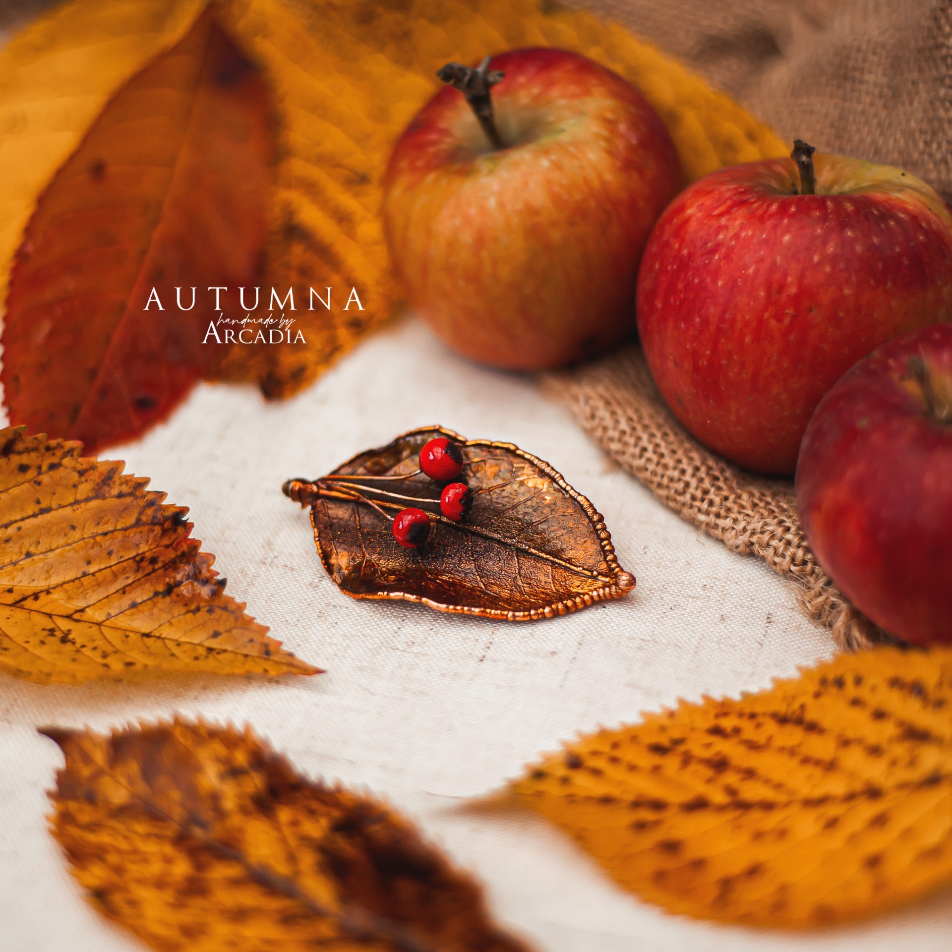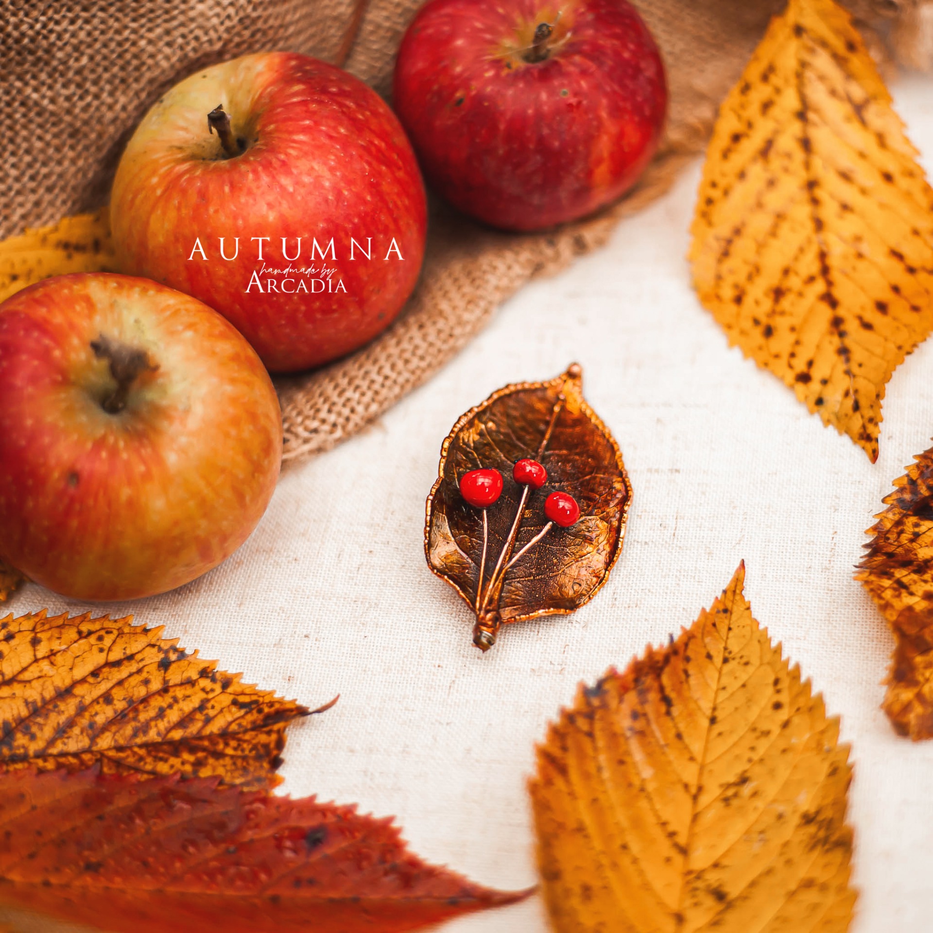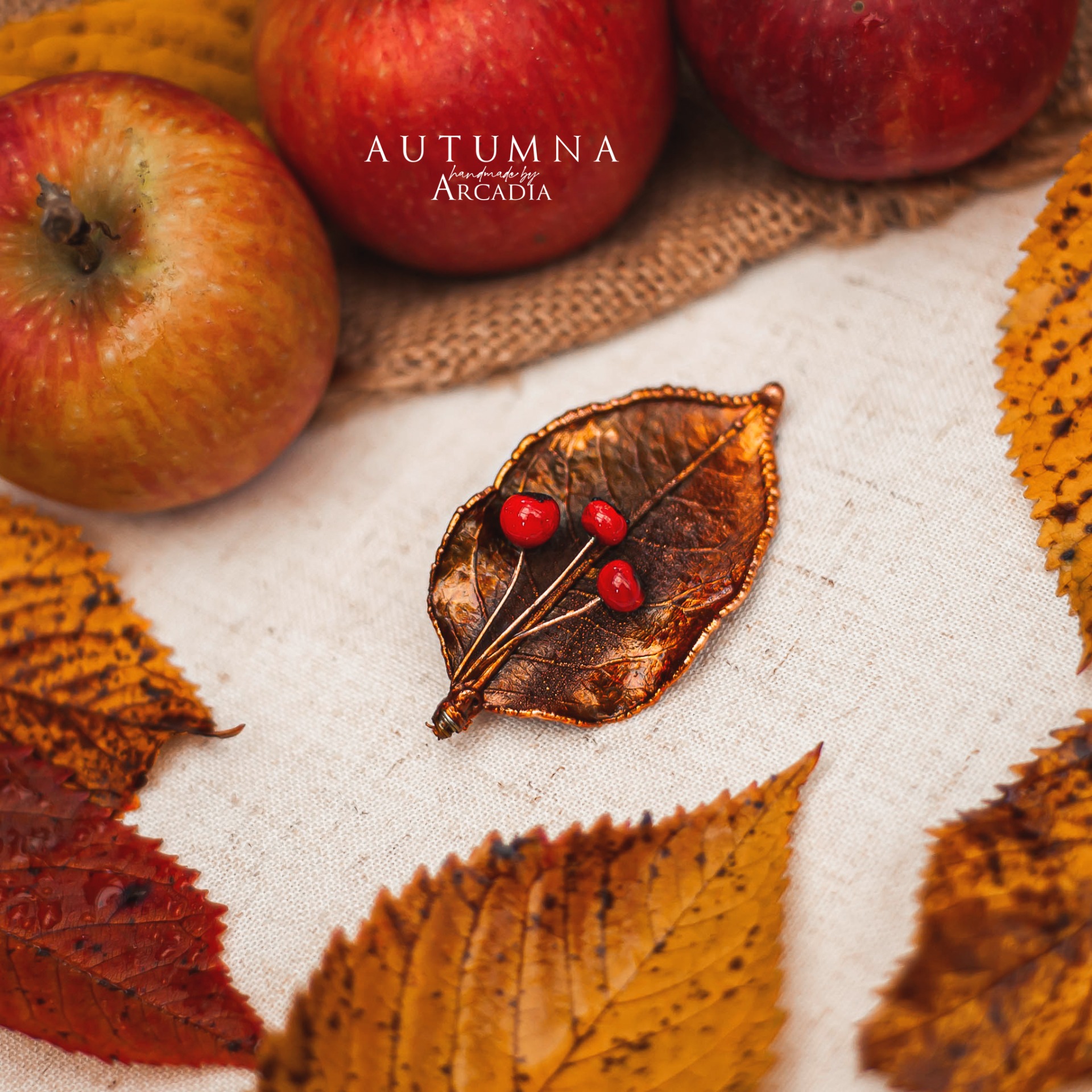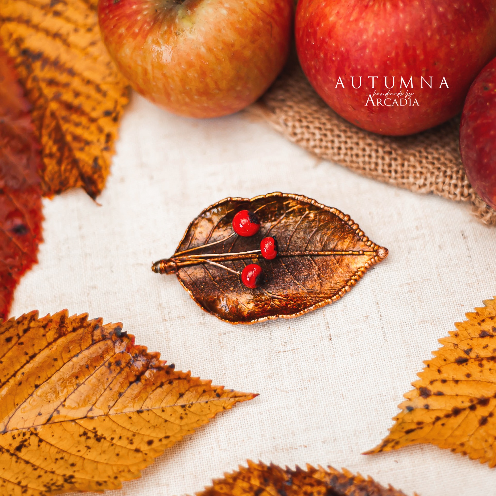 Brož se skutečným pokoveným lístkem ve zlatavých tónech zdobeným bobulkami z ručně vinutého českého skla. Vyrobeno rukama a srdcem v alchymistické dílně na severu Čech.