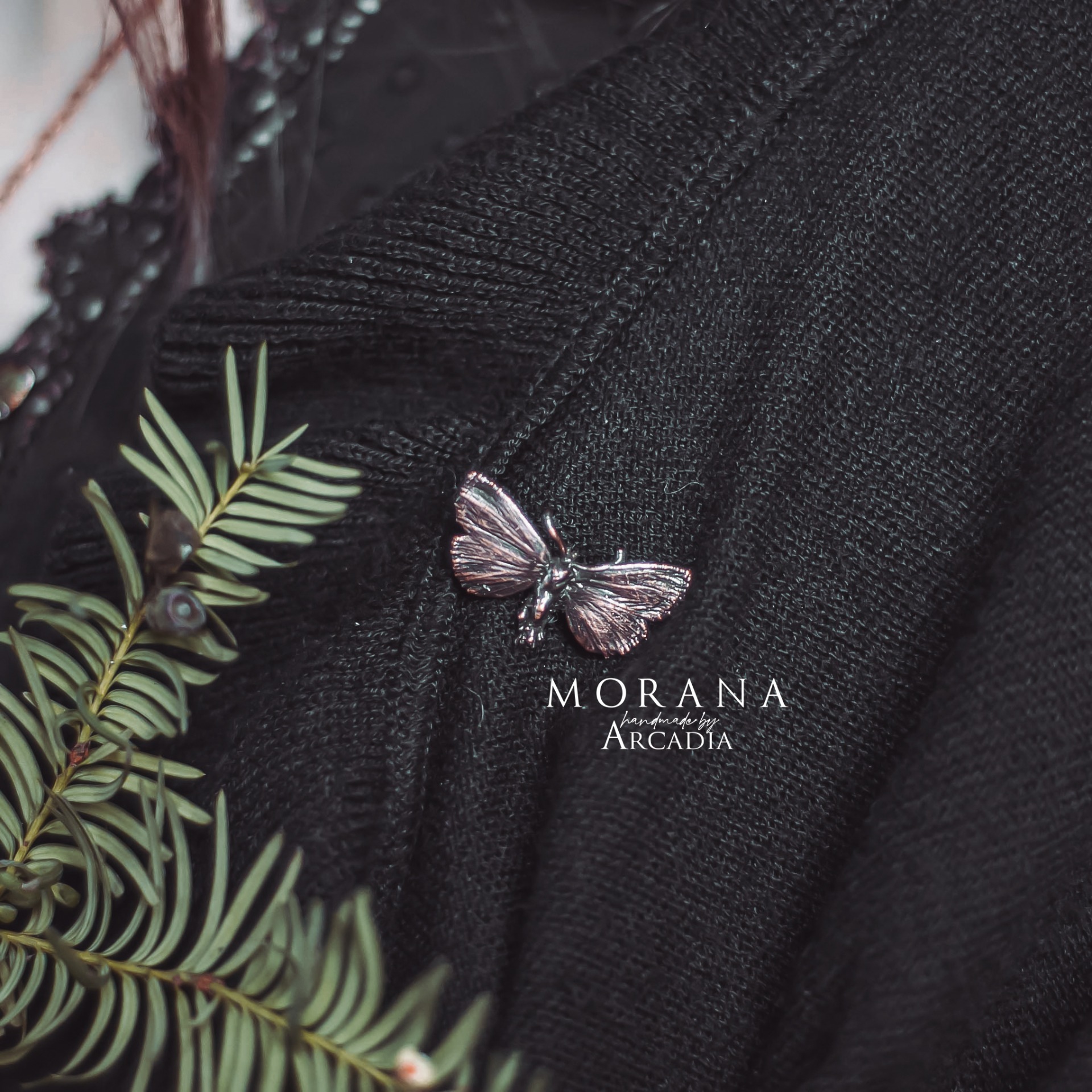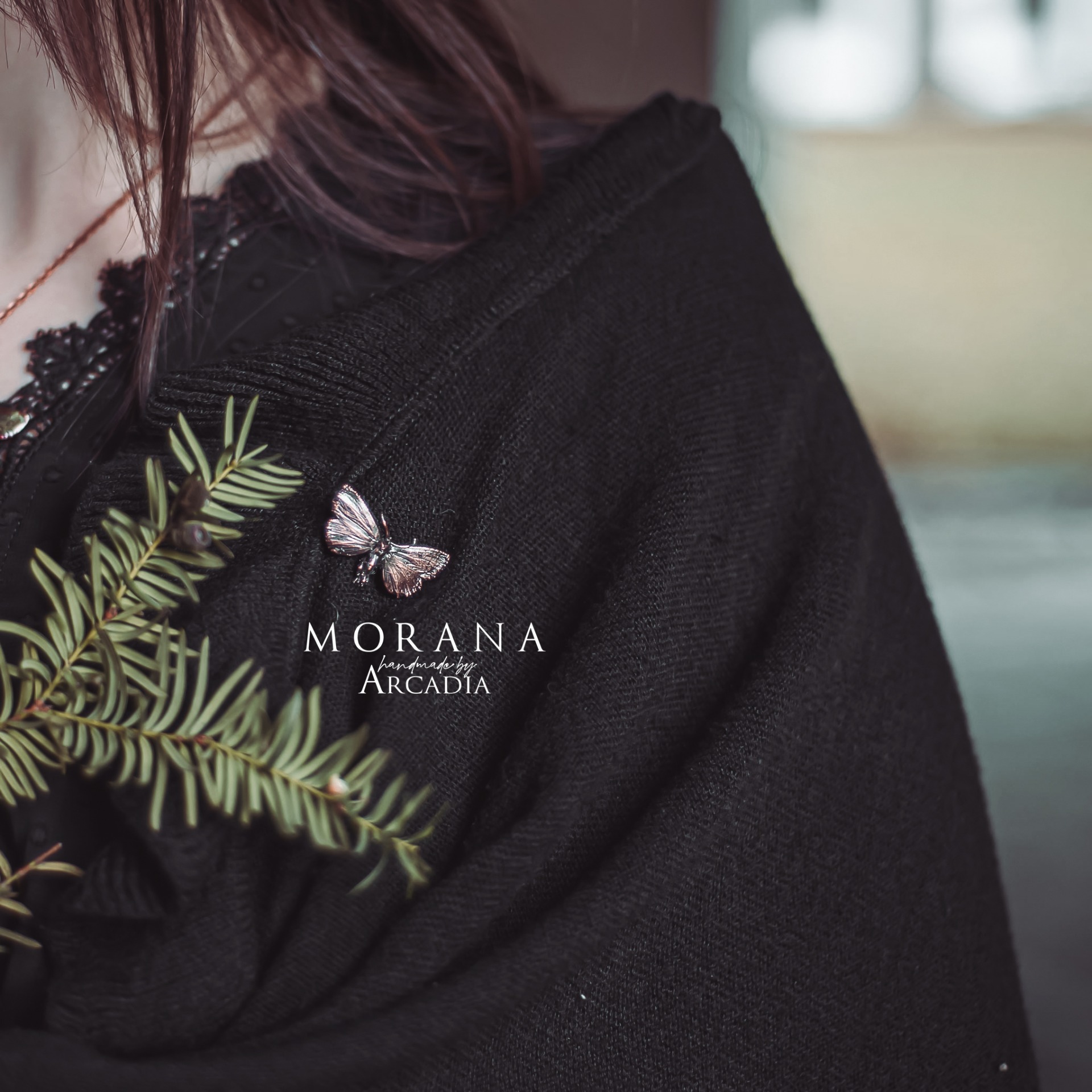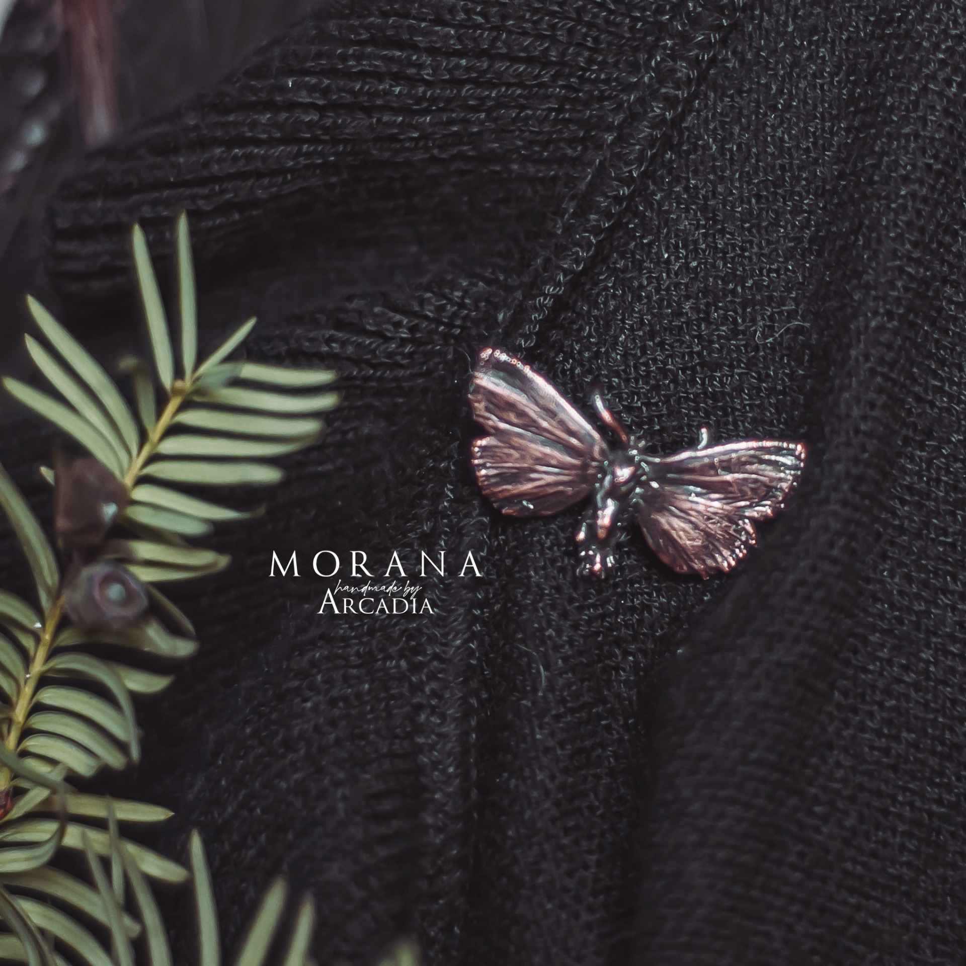 Brož se skutečnou pokovenou můrkou ve staroměděné vintage patině. Odznakový mechanismus. Vyrobeno rukama a srdcem v alchymistické dílně na severu Čech.
