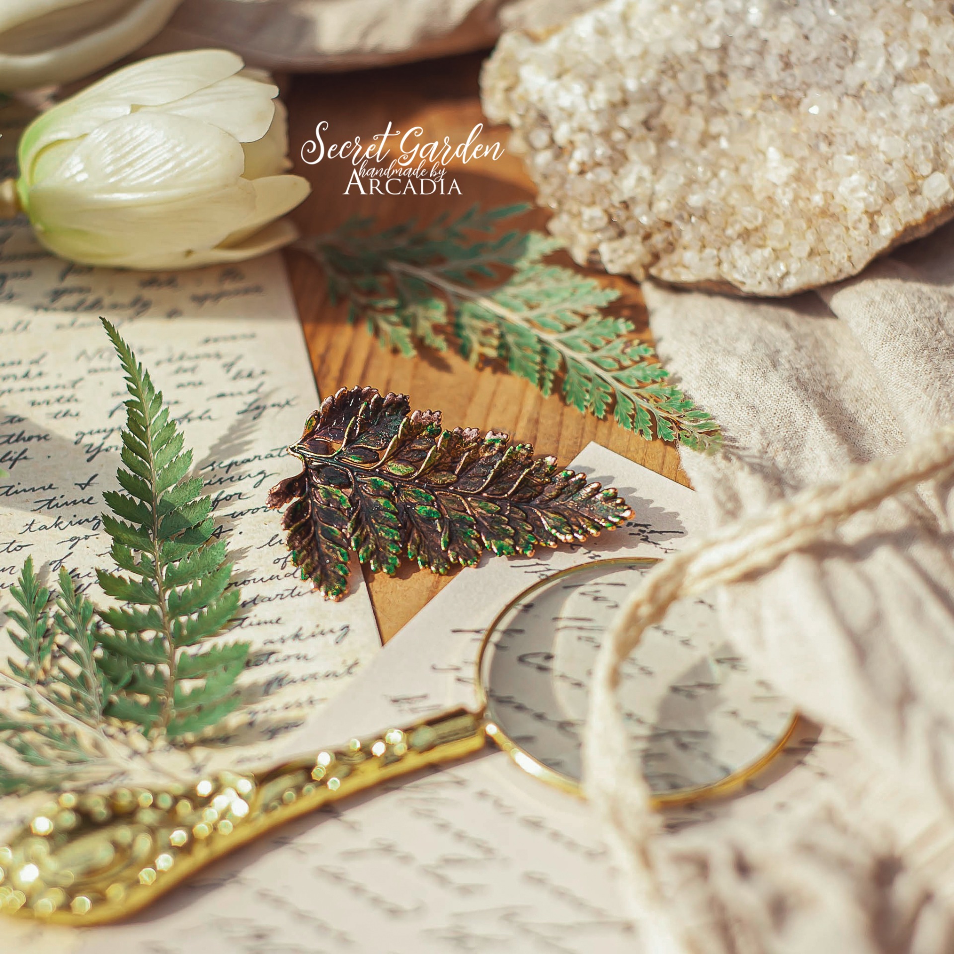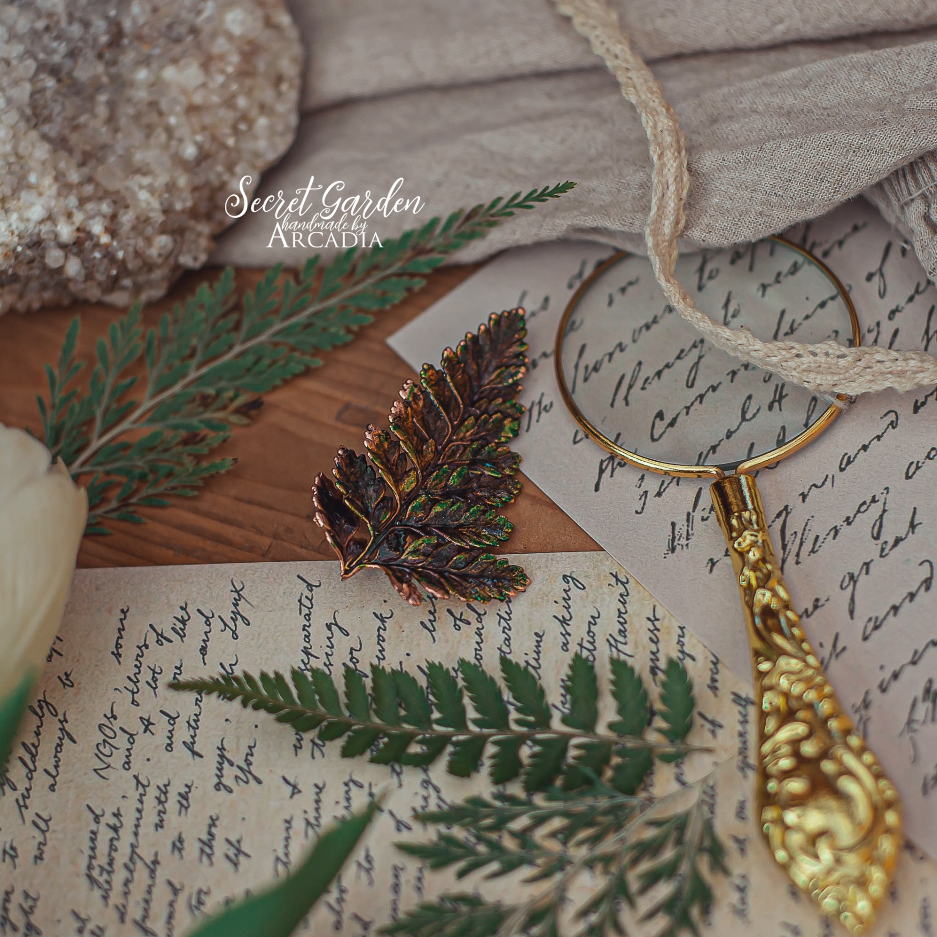 Brož ze skutečné pokovené kapradiny v olejově zelené. Vyrobeno rukama a srdcem v alchymistické dílně na severu Čech.