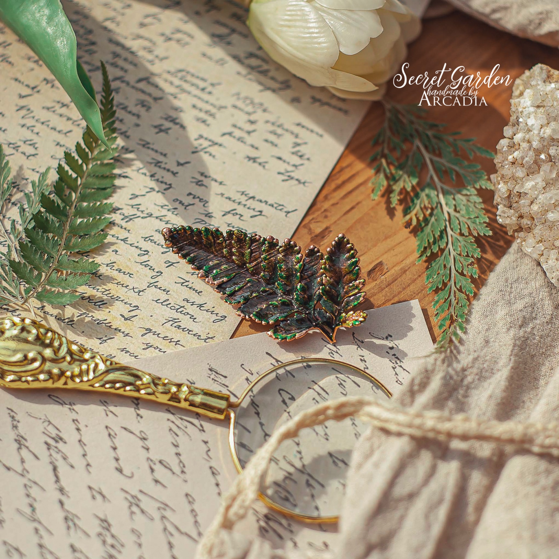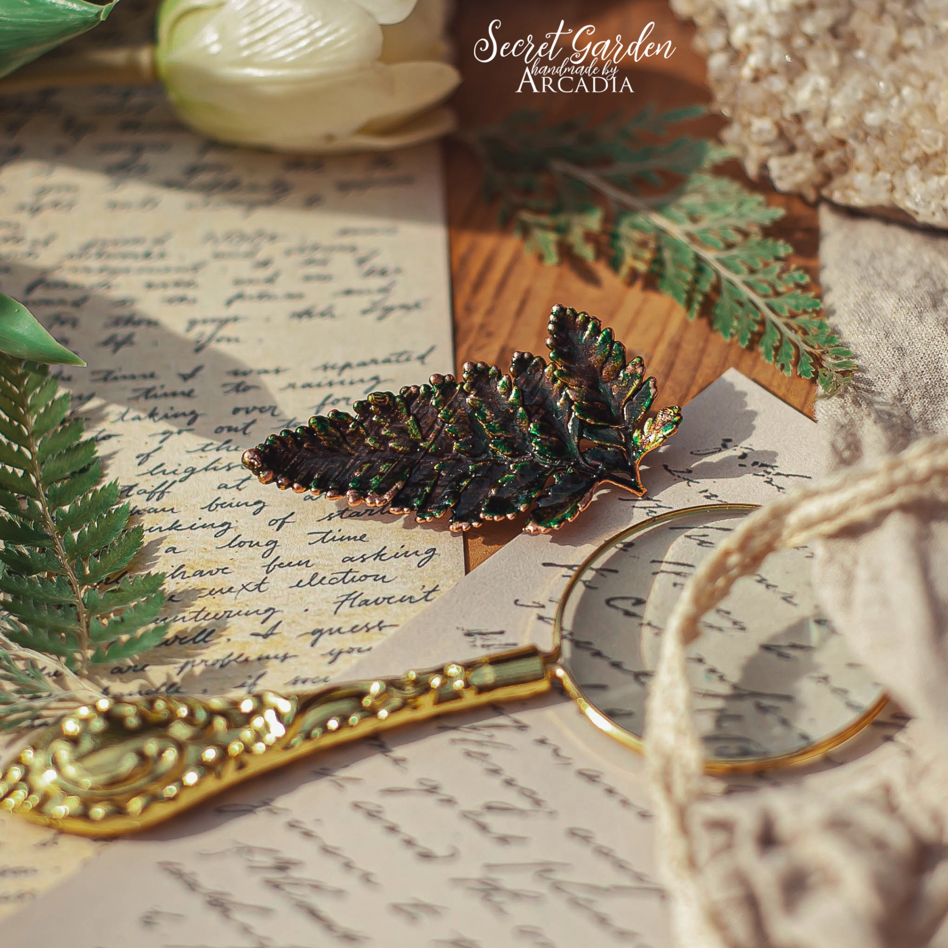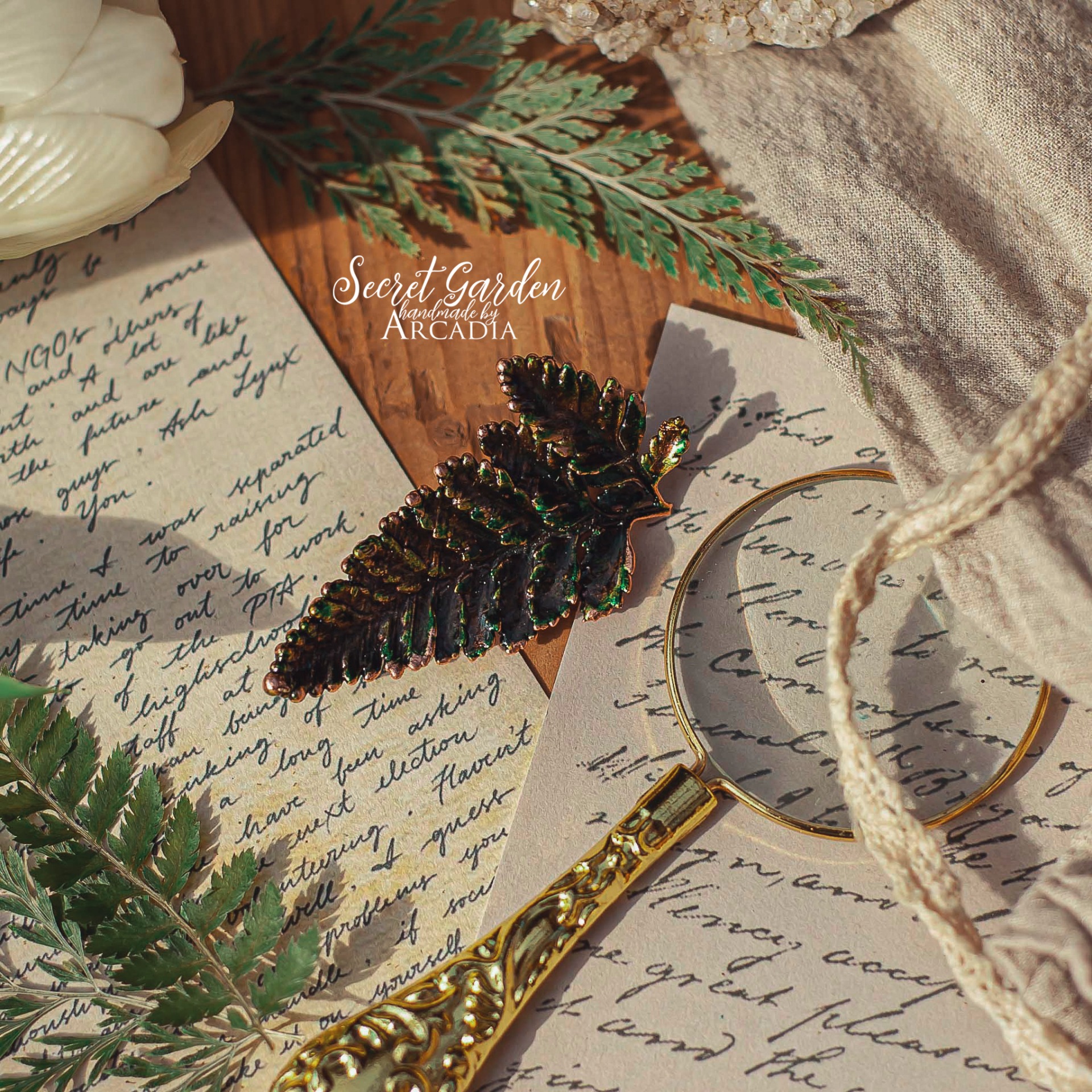 Brož ze skutečné pokovené kapradiny v olejově zelené. Vyrobeno rukama a srdcem v alchymistické dílně na severu Čech.