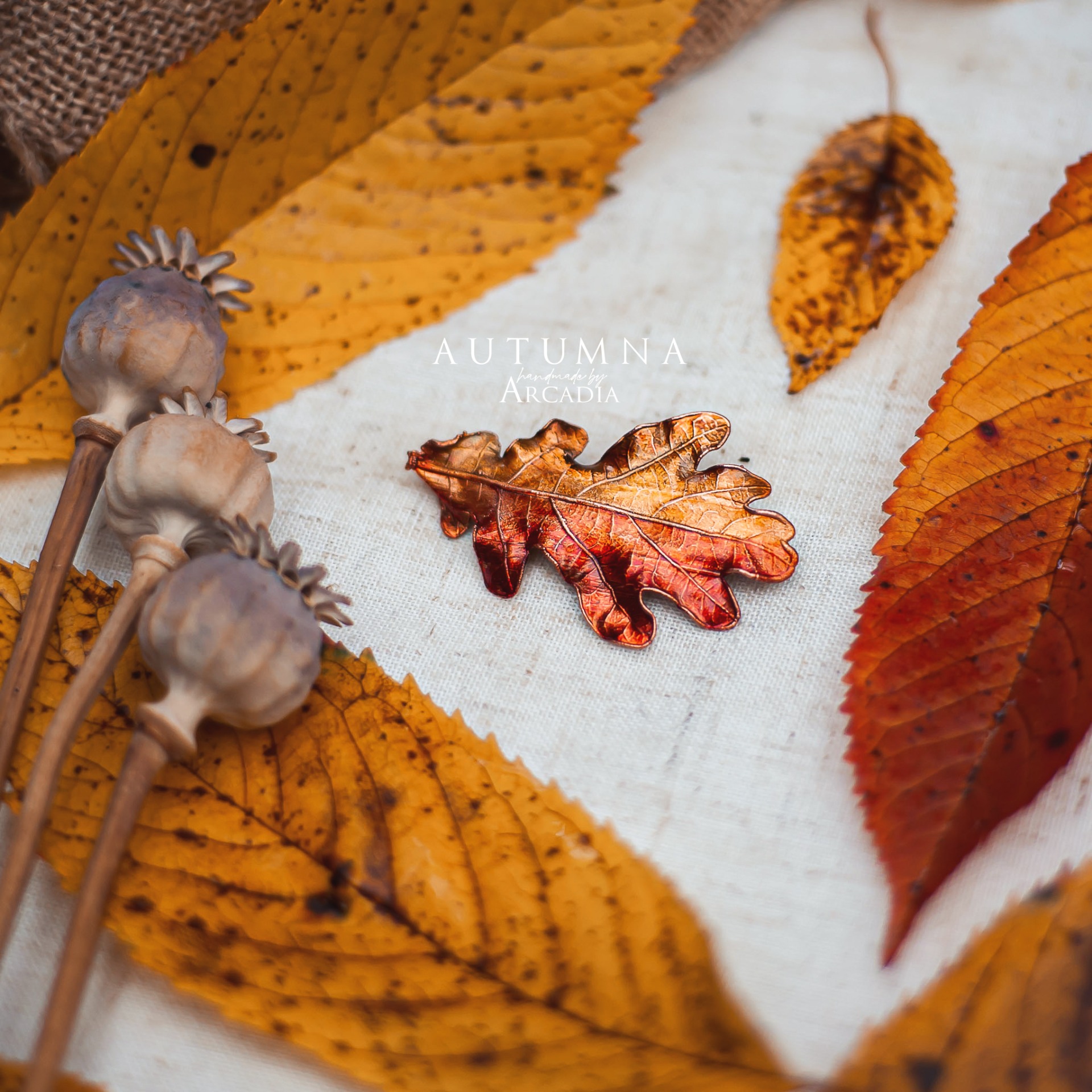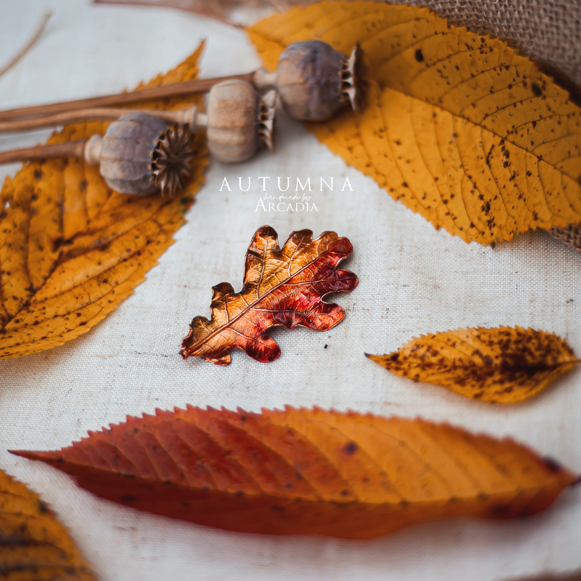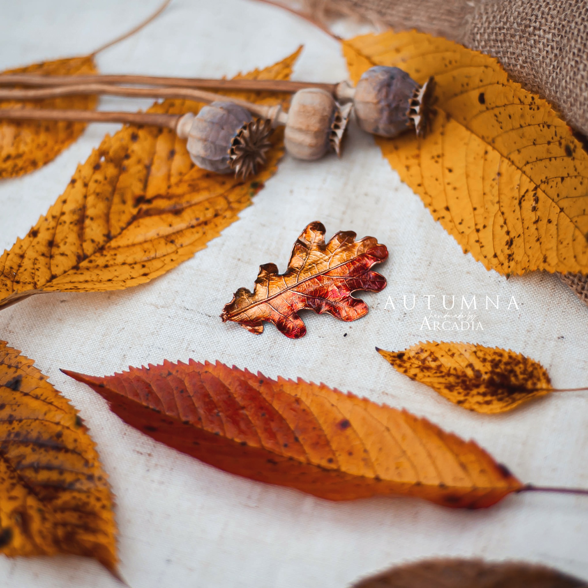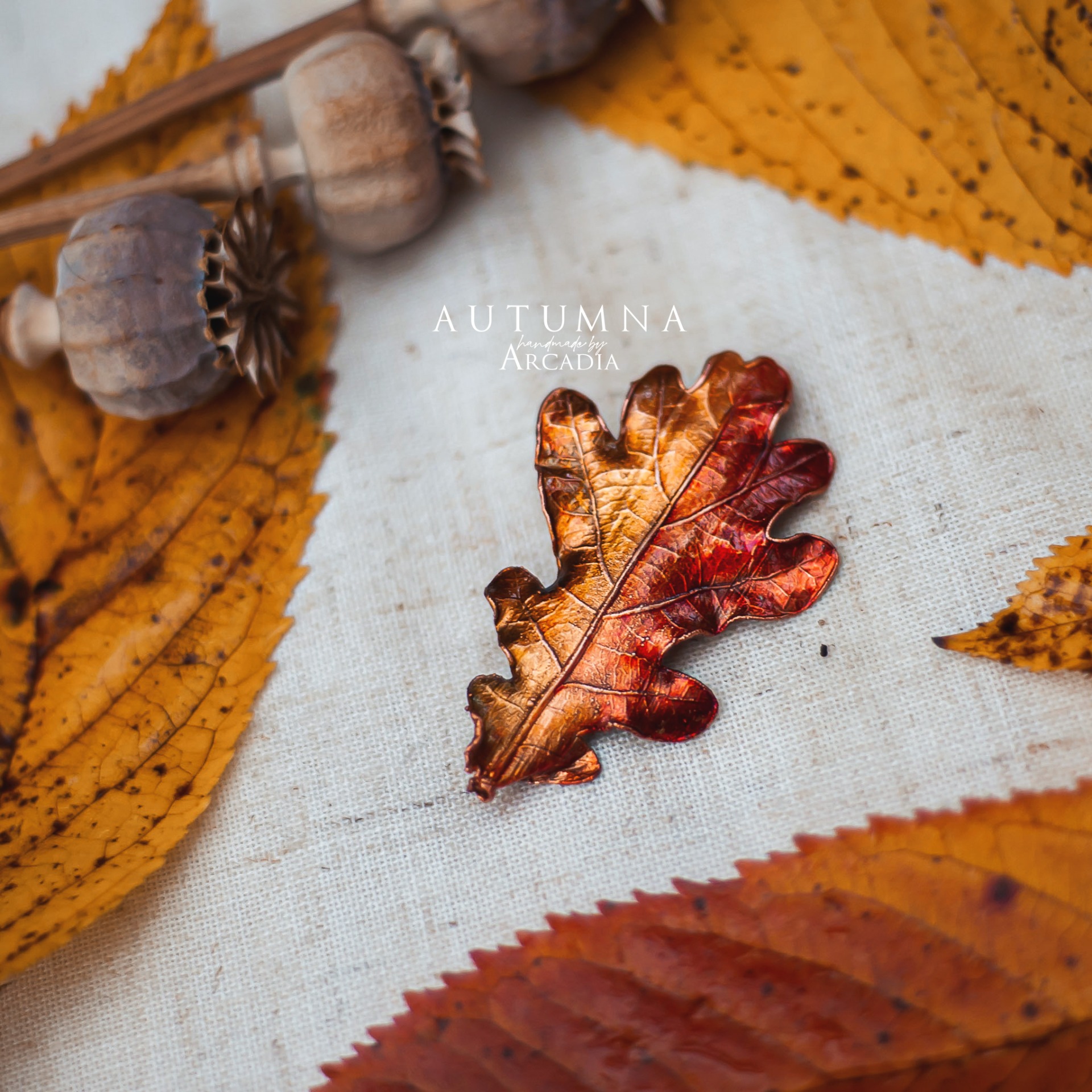 Brož ze skutečného pokoveného lístku dubu v podzimních ohnivých odstínech. Vyrobeno rukama a srdcem v alchymistické dílně na severu Čech.