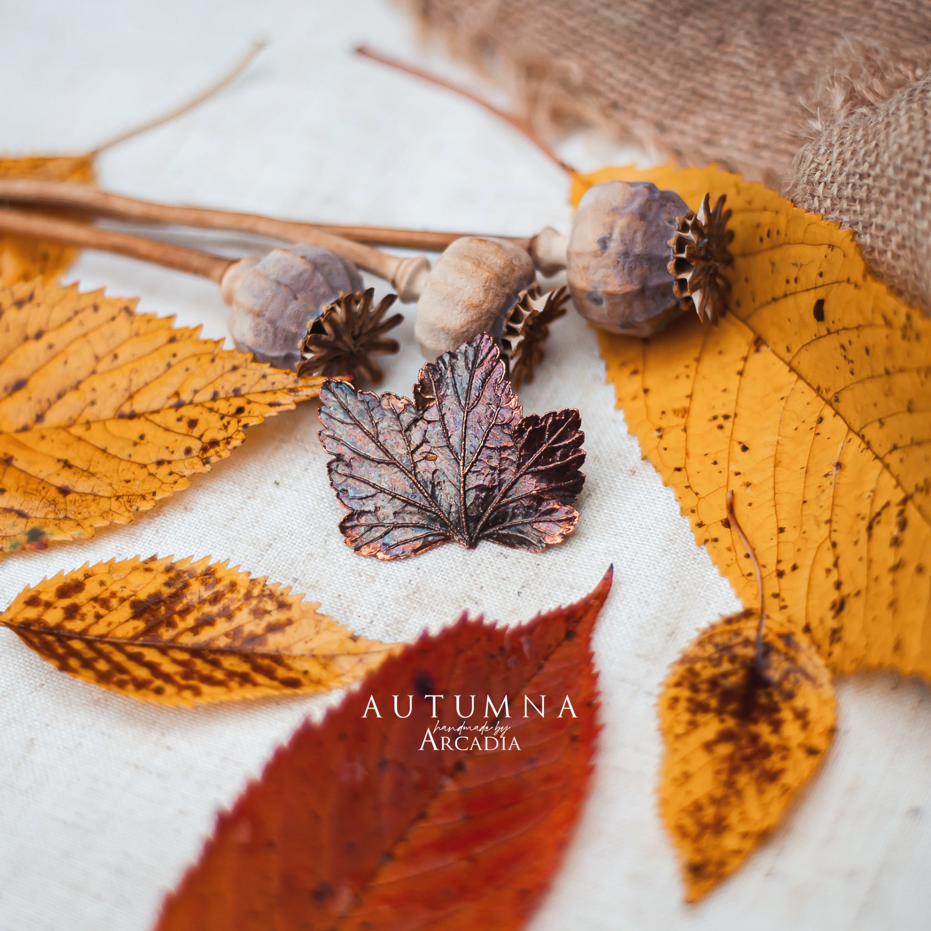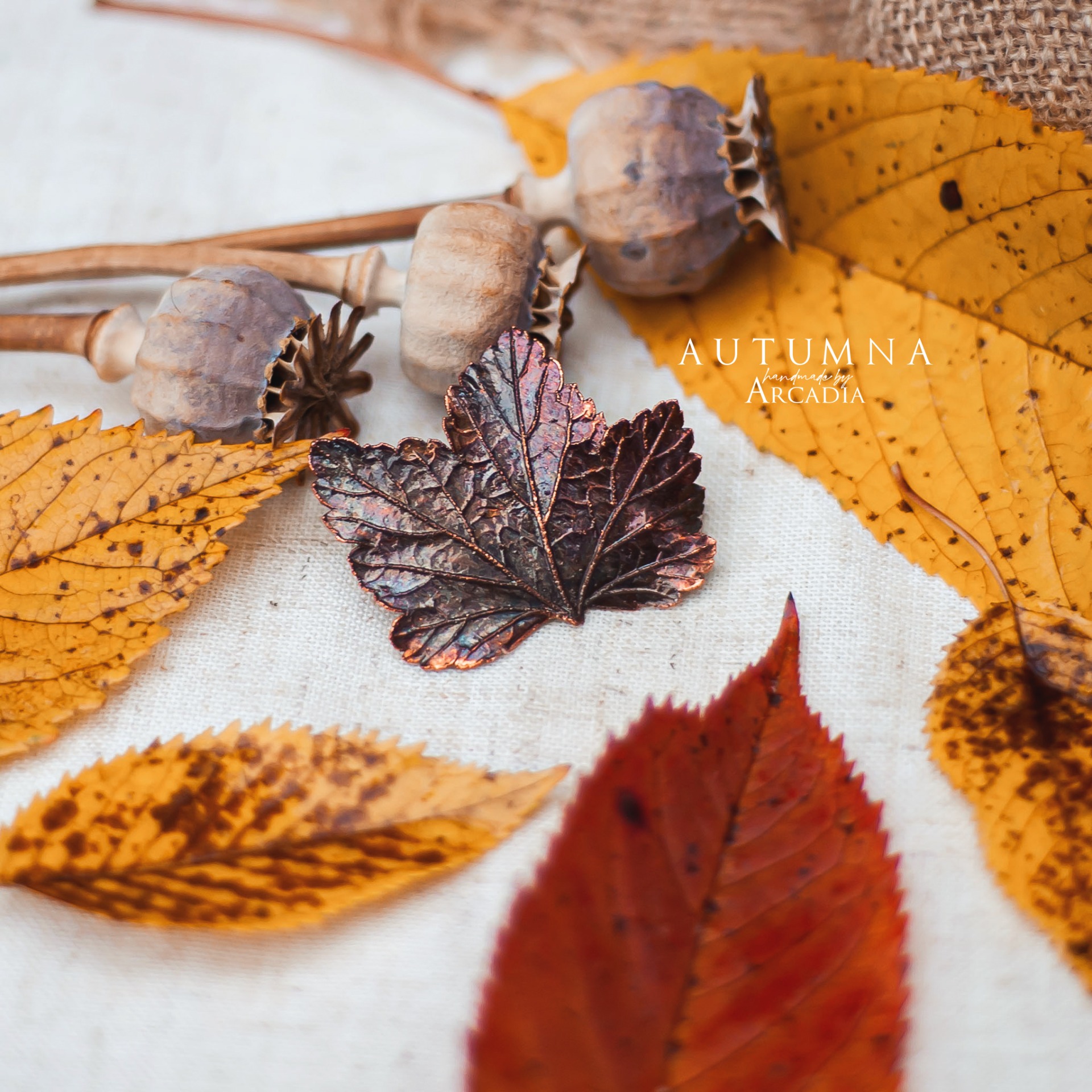 Brož ze skutečného pokoveného lístku rybízu v olejově duhové patině. Vyrobeno rukama a srdcem v alchymistické dílně na severu Čech.
