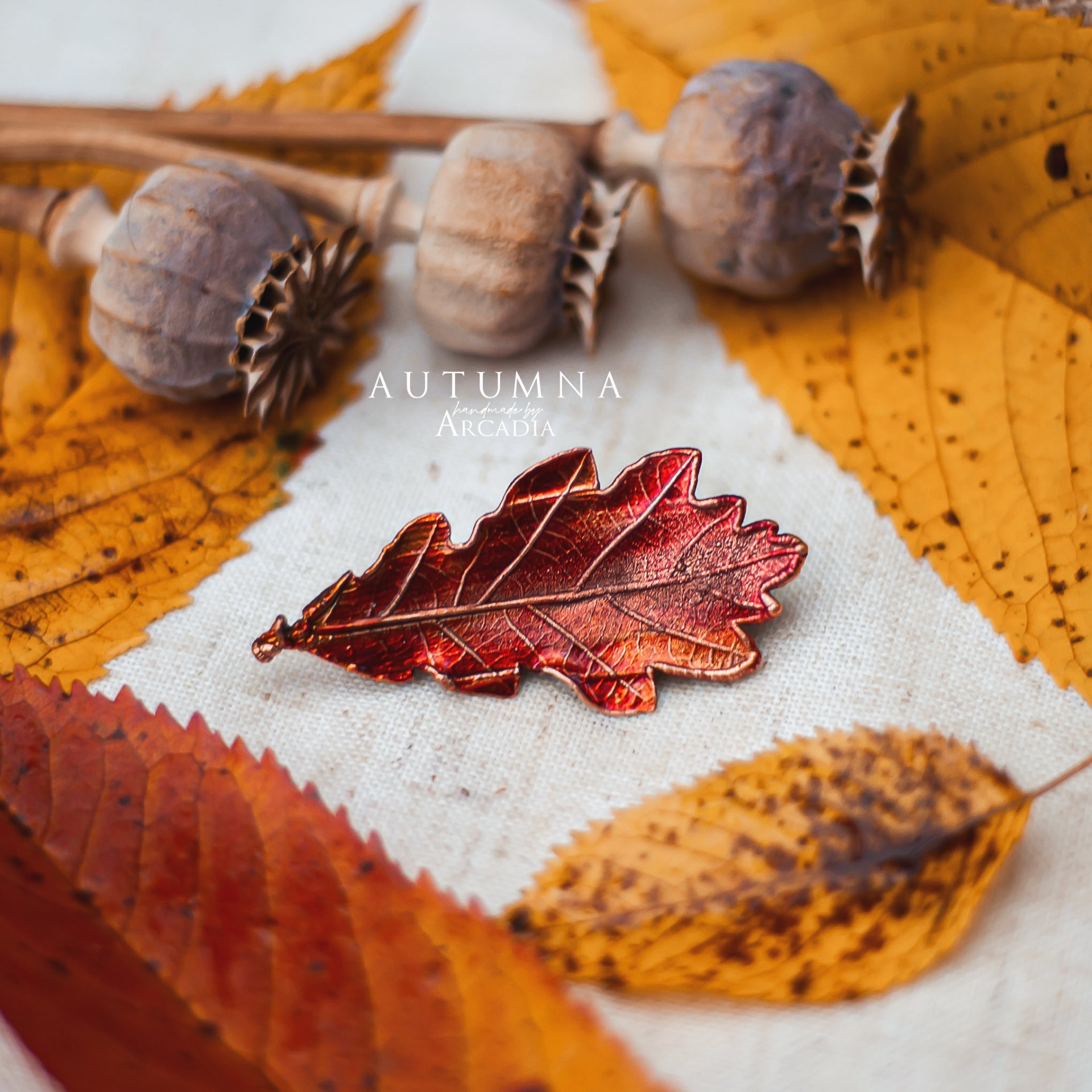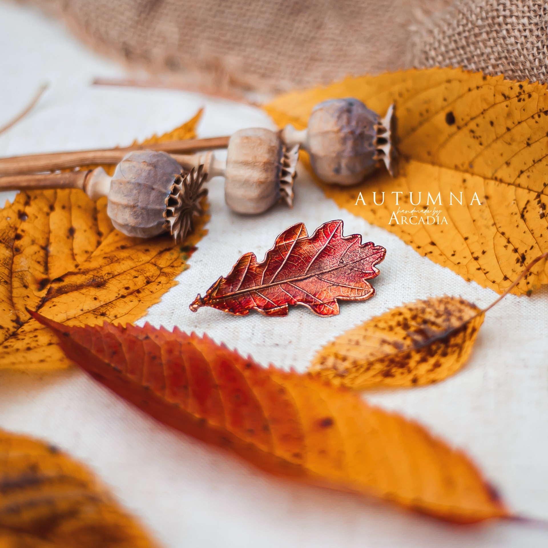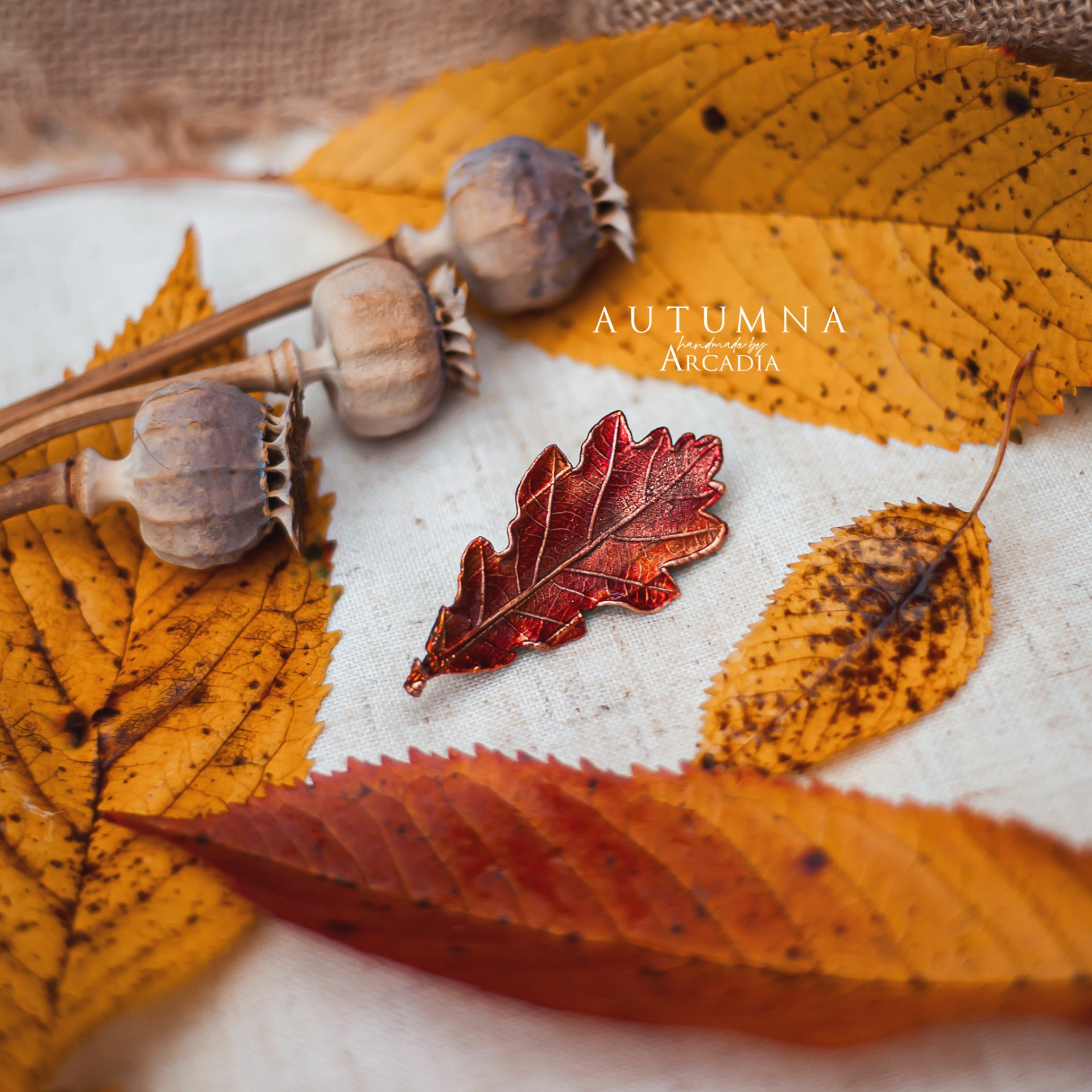 Brož ze skutečného pokoveného lístku dubu v ohnivě rudých podzimních odstínech. Vyrobeno rukama a srdcem v alchymistické dílně na severu Čech.