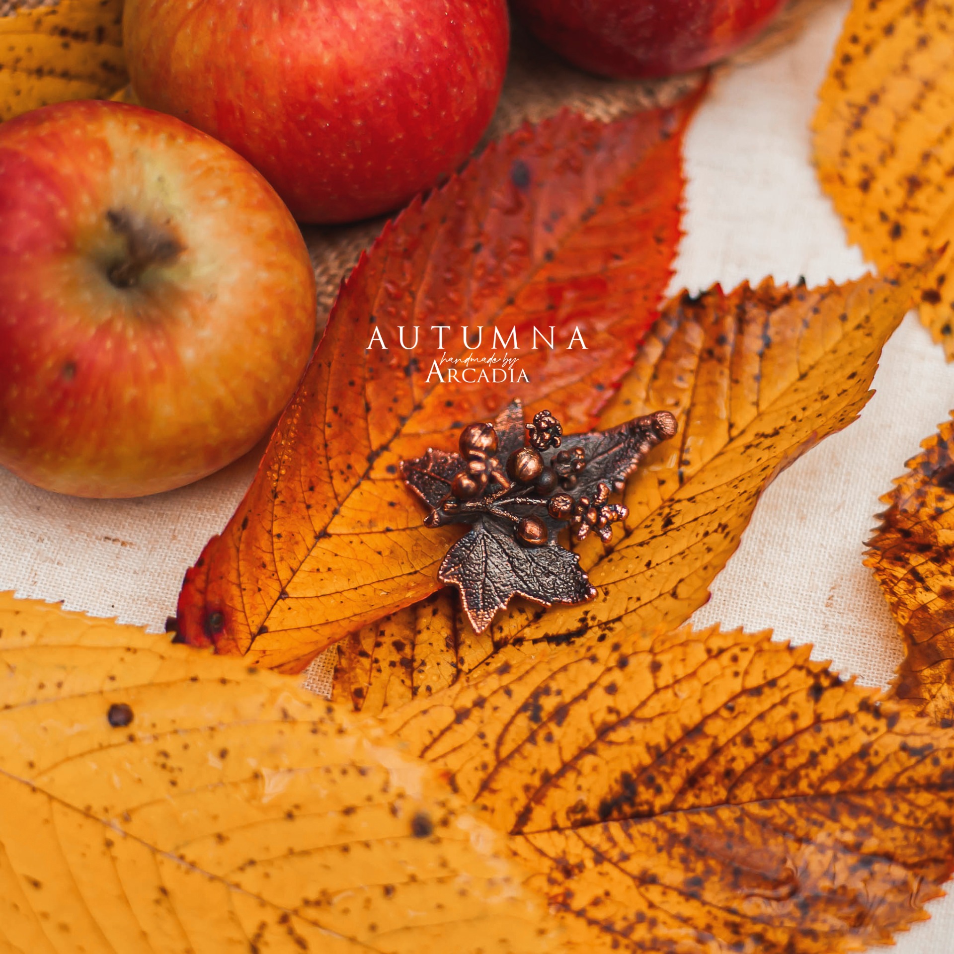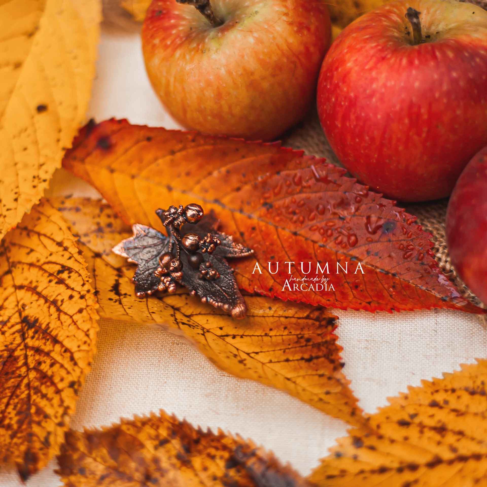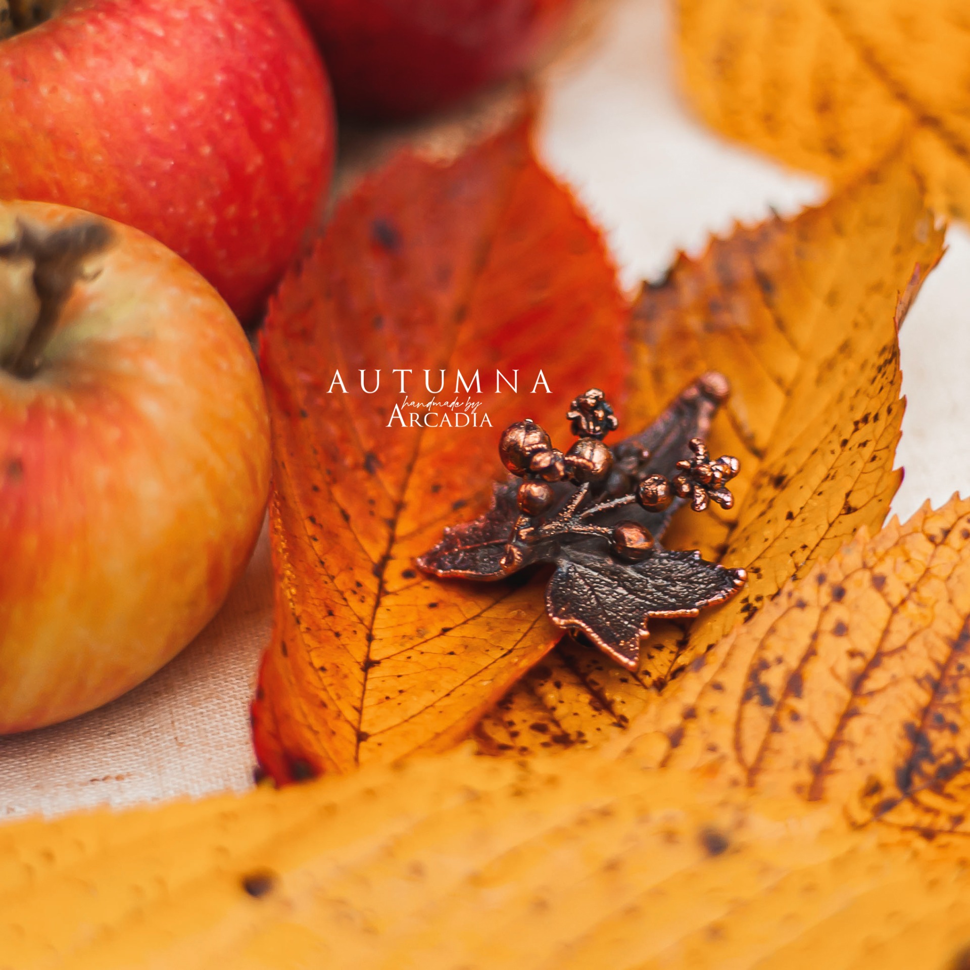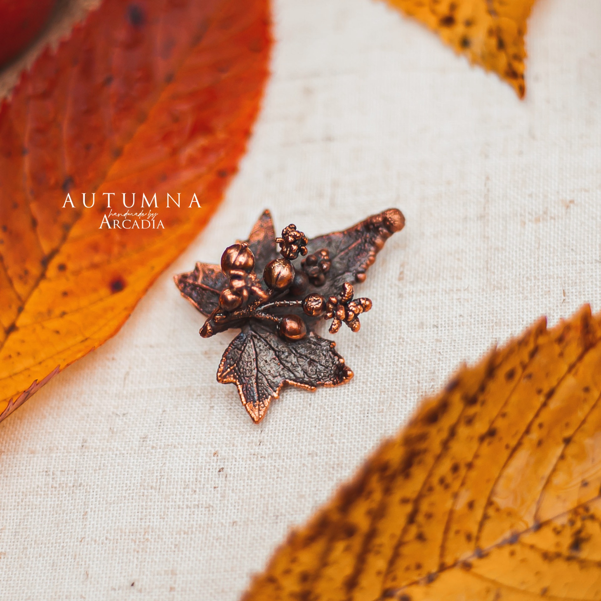 Brož se skutečným pokoveným lístkem, květů a plodů posedu bílého v rustikální antické patině. Vyrobeno rukama a srdcem v alchymistické dílně na severu Čech.