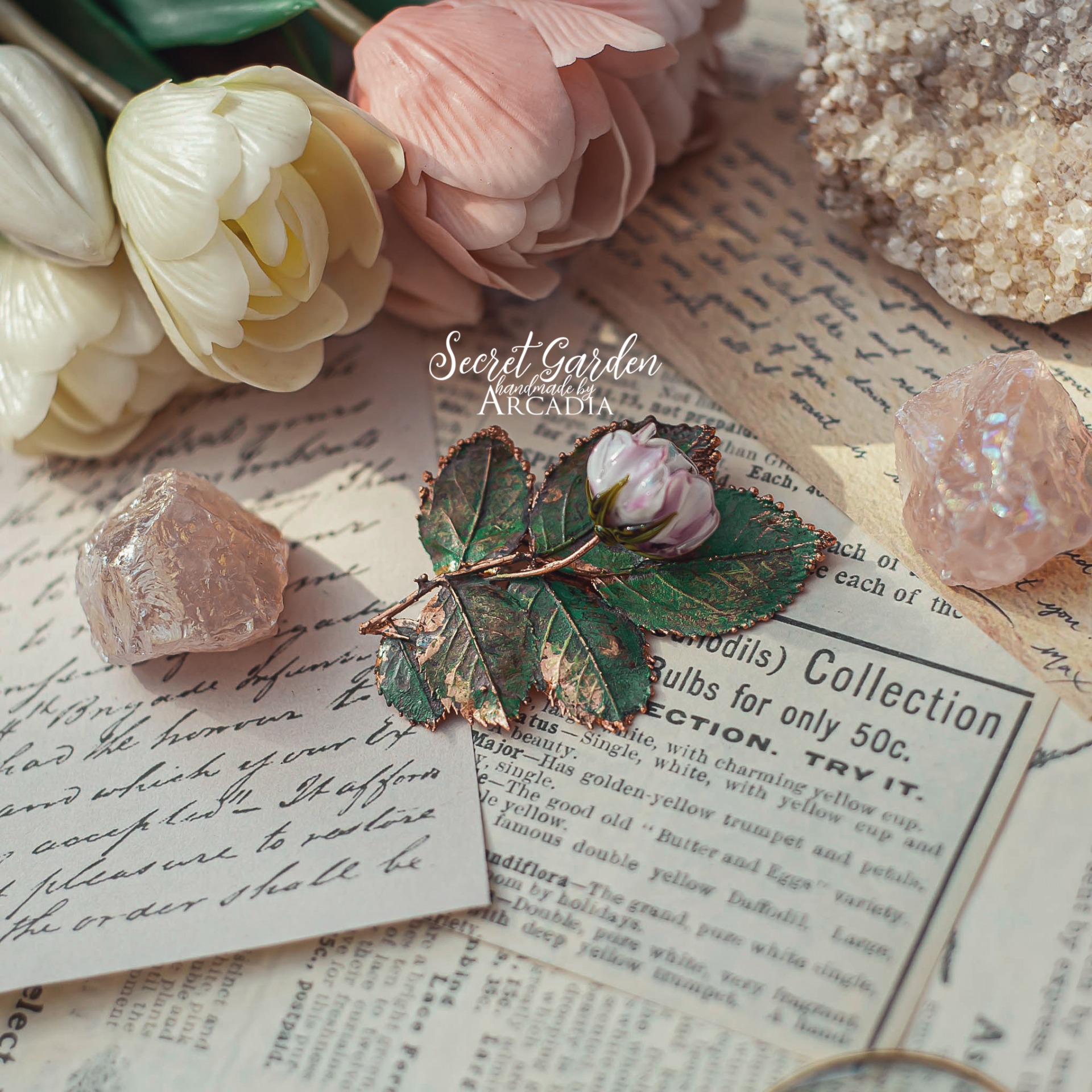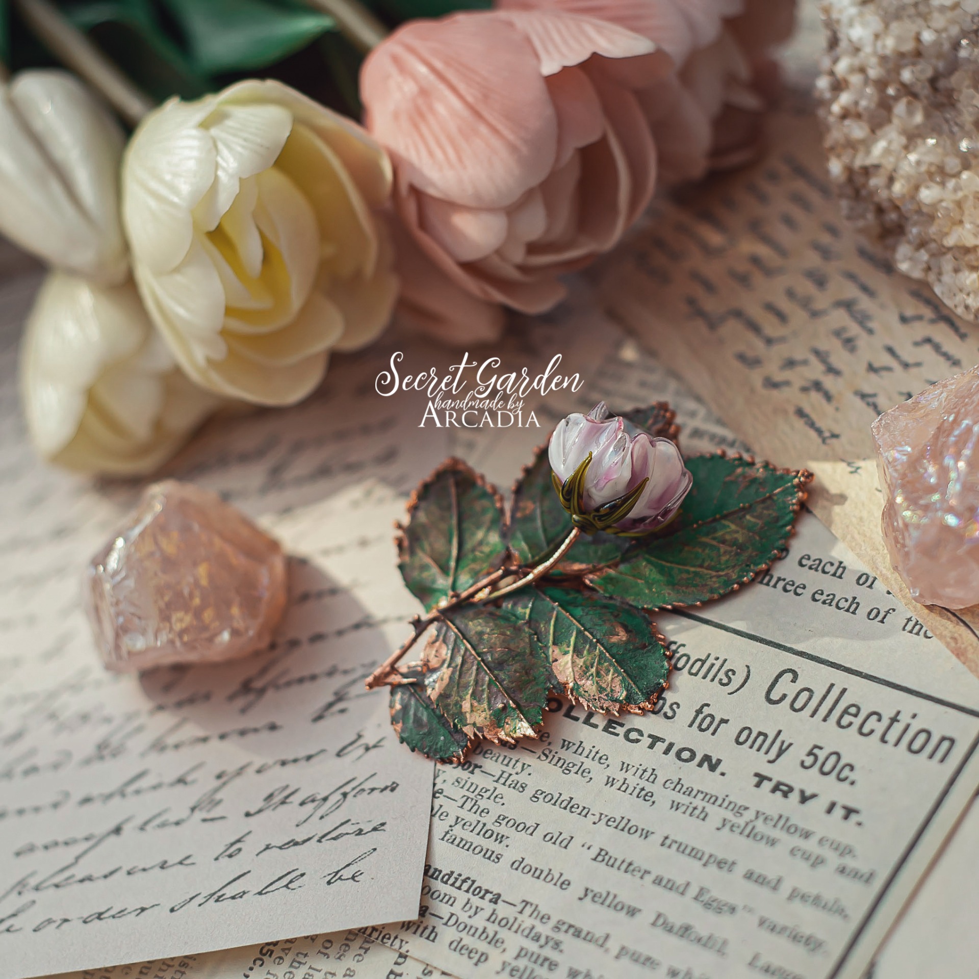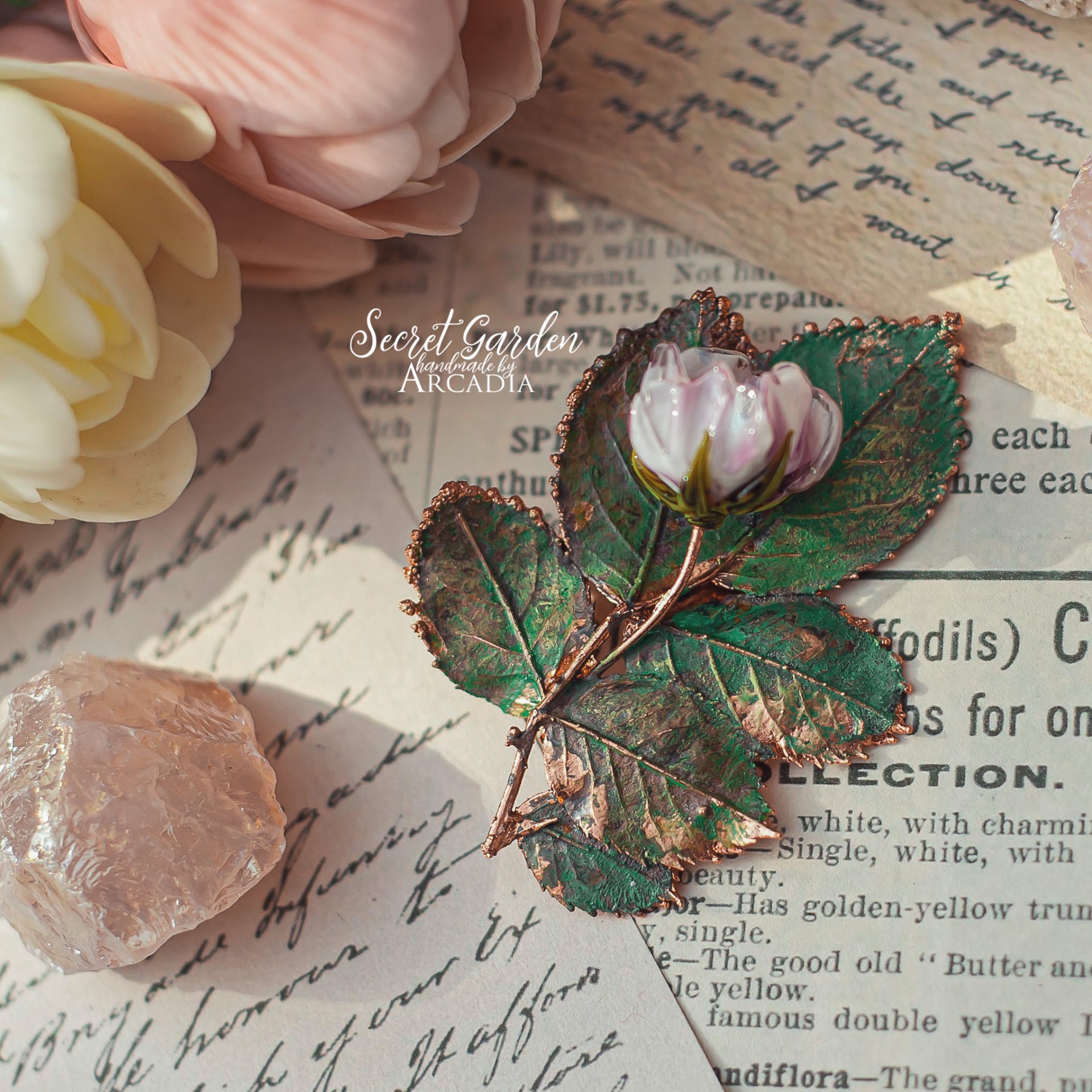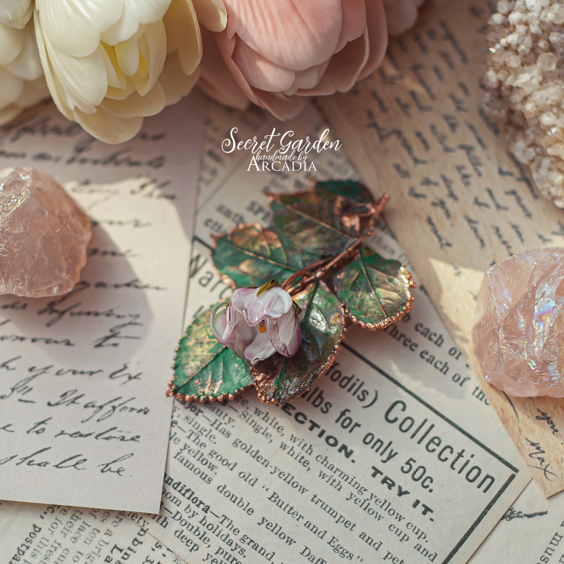 Brož ze skutečné pokovené větvičky šípkové růže v jemné vintage zelené, ozdobená kvítkem z ručně vinutého českého skla. Vyrobeno rukama a srdcem v alchymistické dílně na severu Čech.