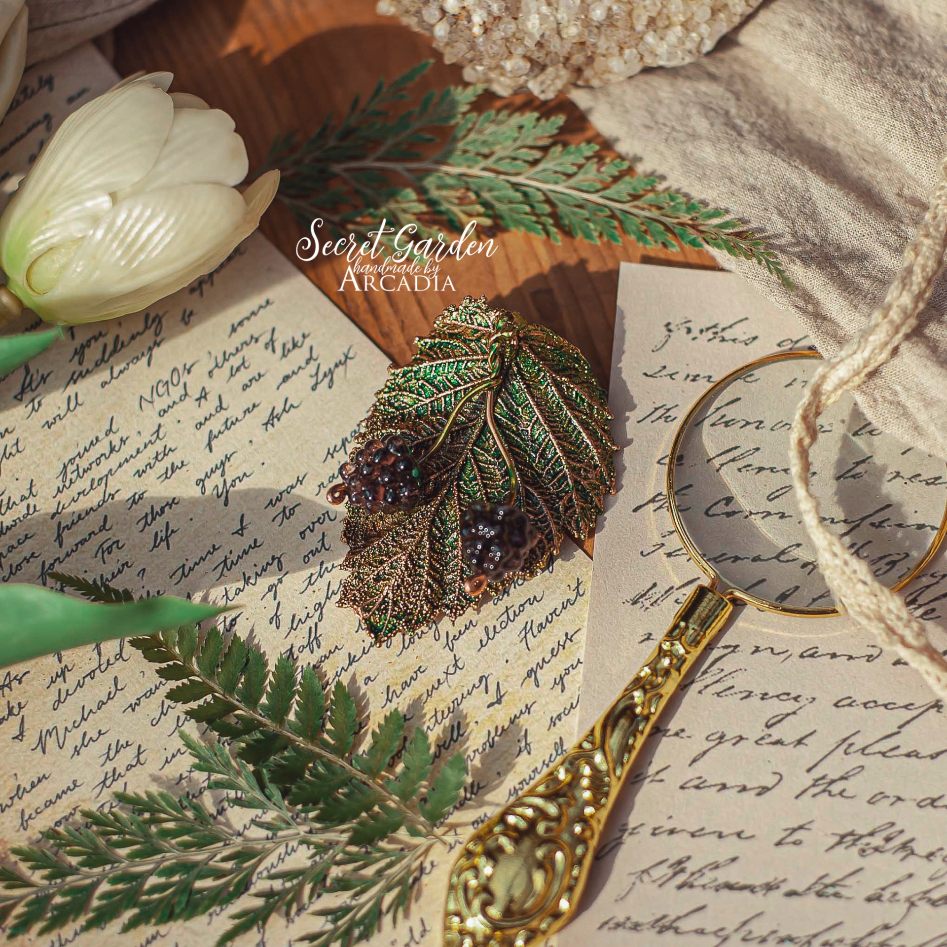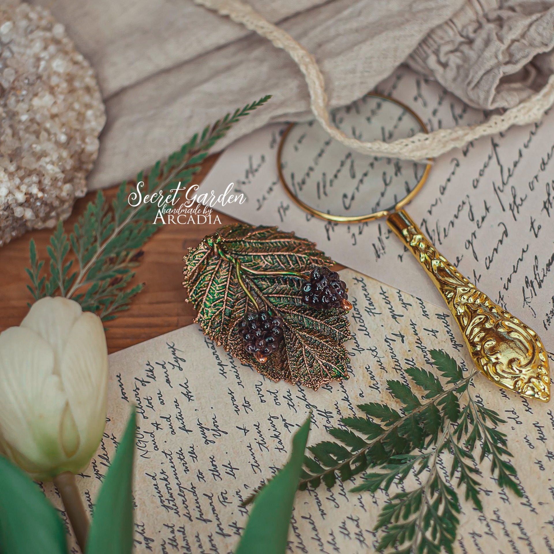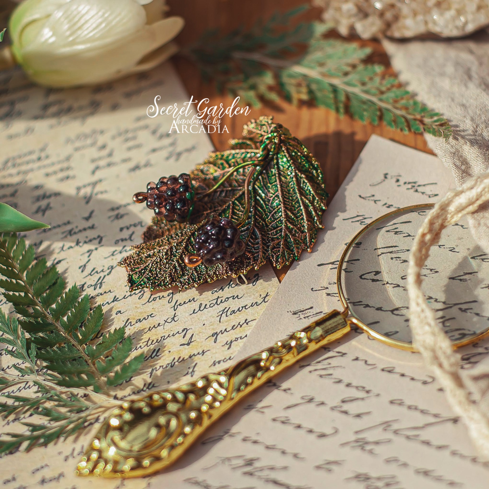 Brož ze skutečného pokoveného lístku ostružiníklu a skleněnými vinutkami. Vyrobeno rukama a srdcem v alchymistické dílně na severu Čech.