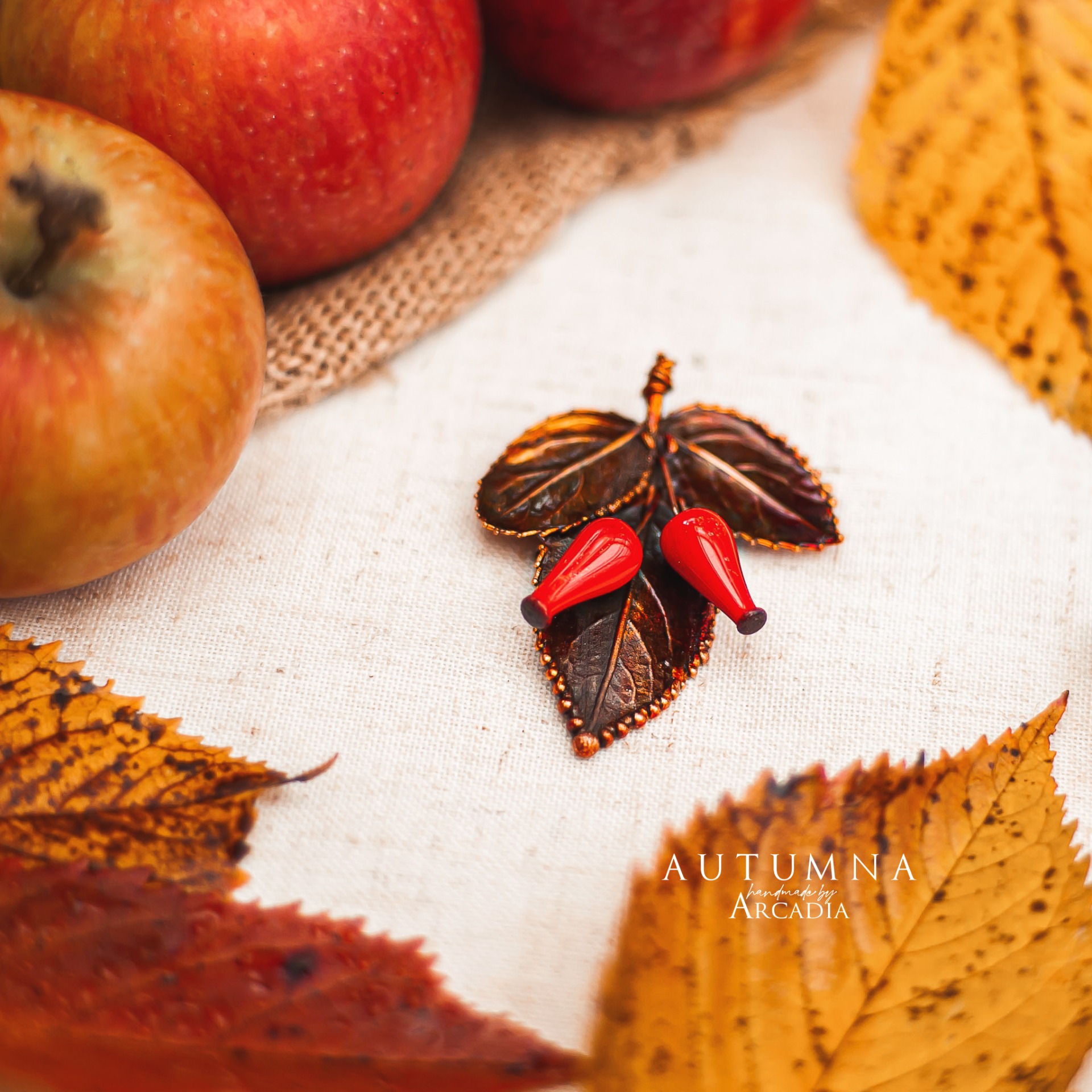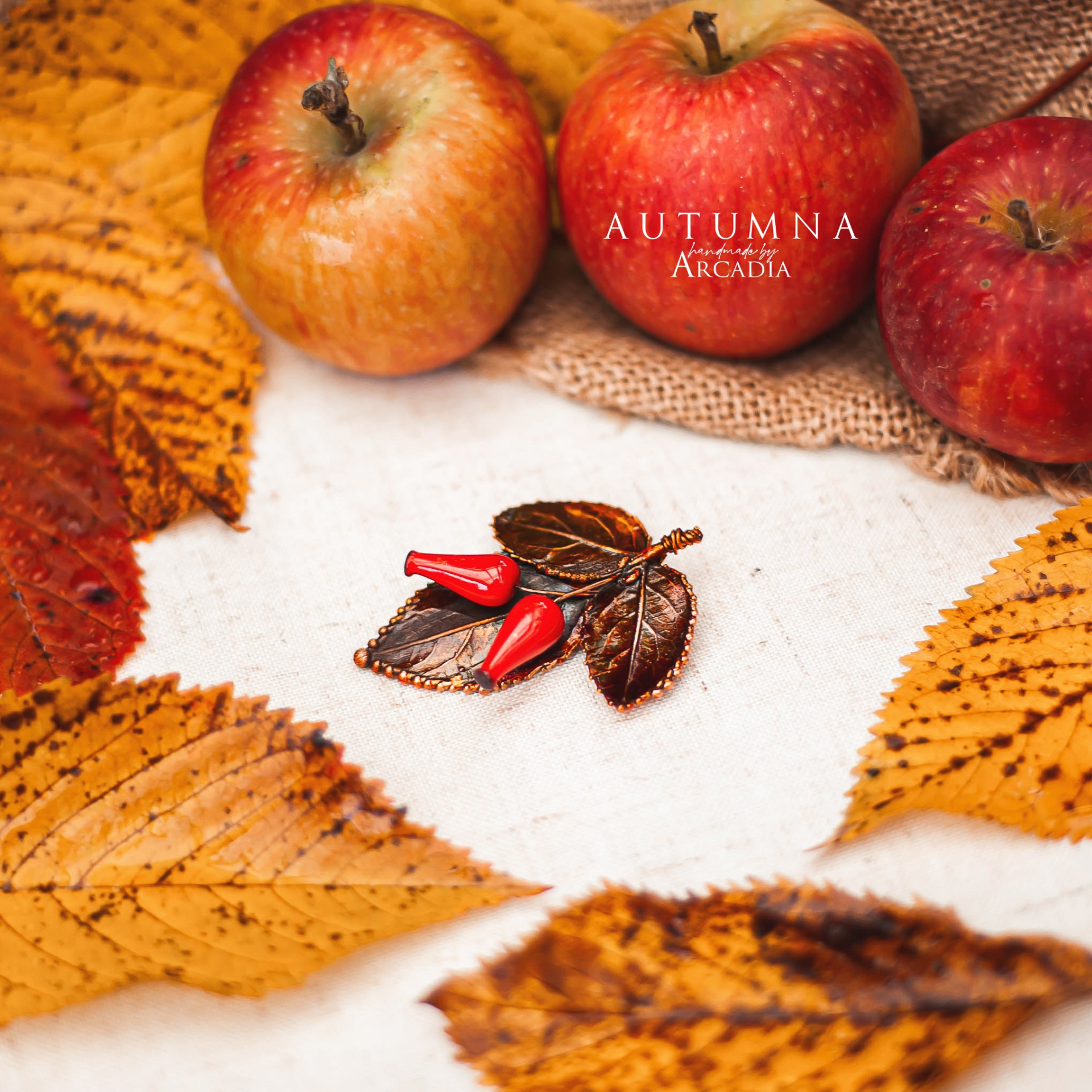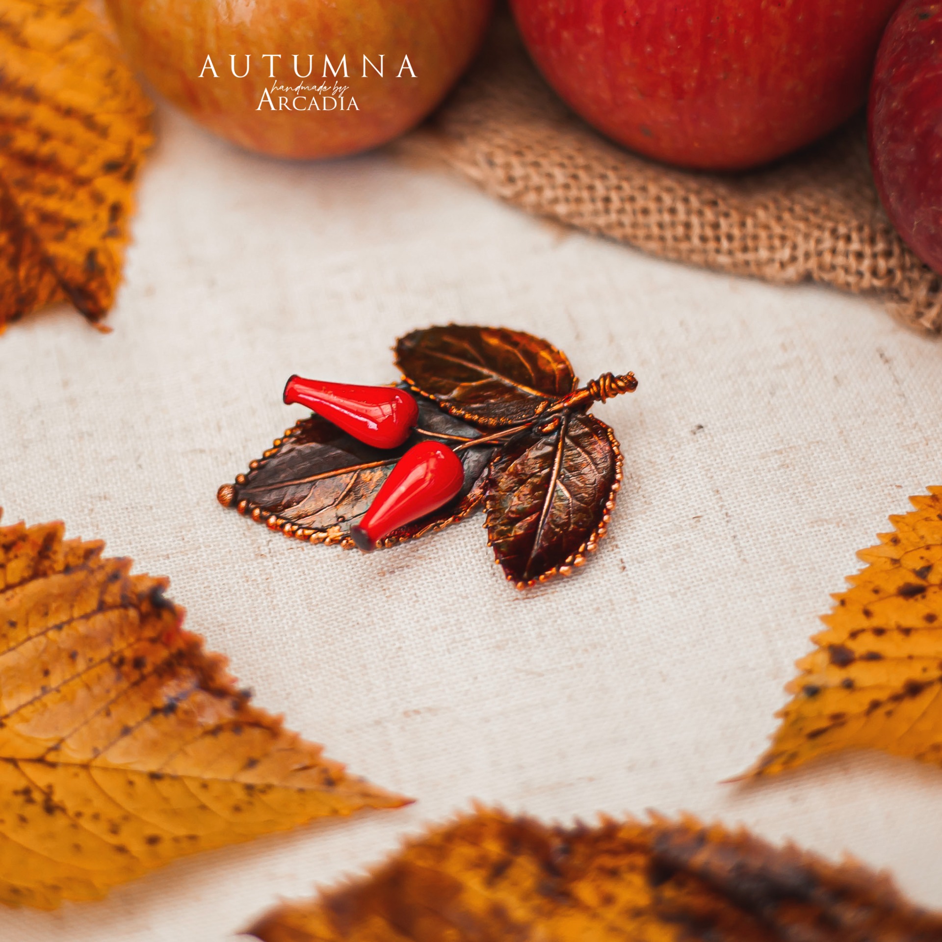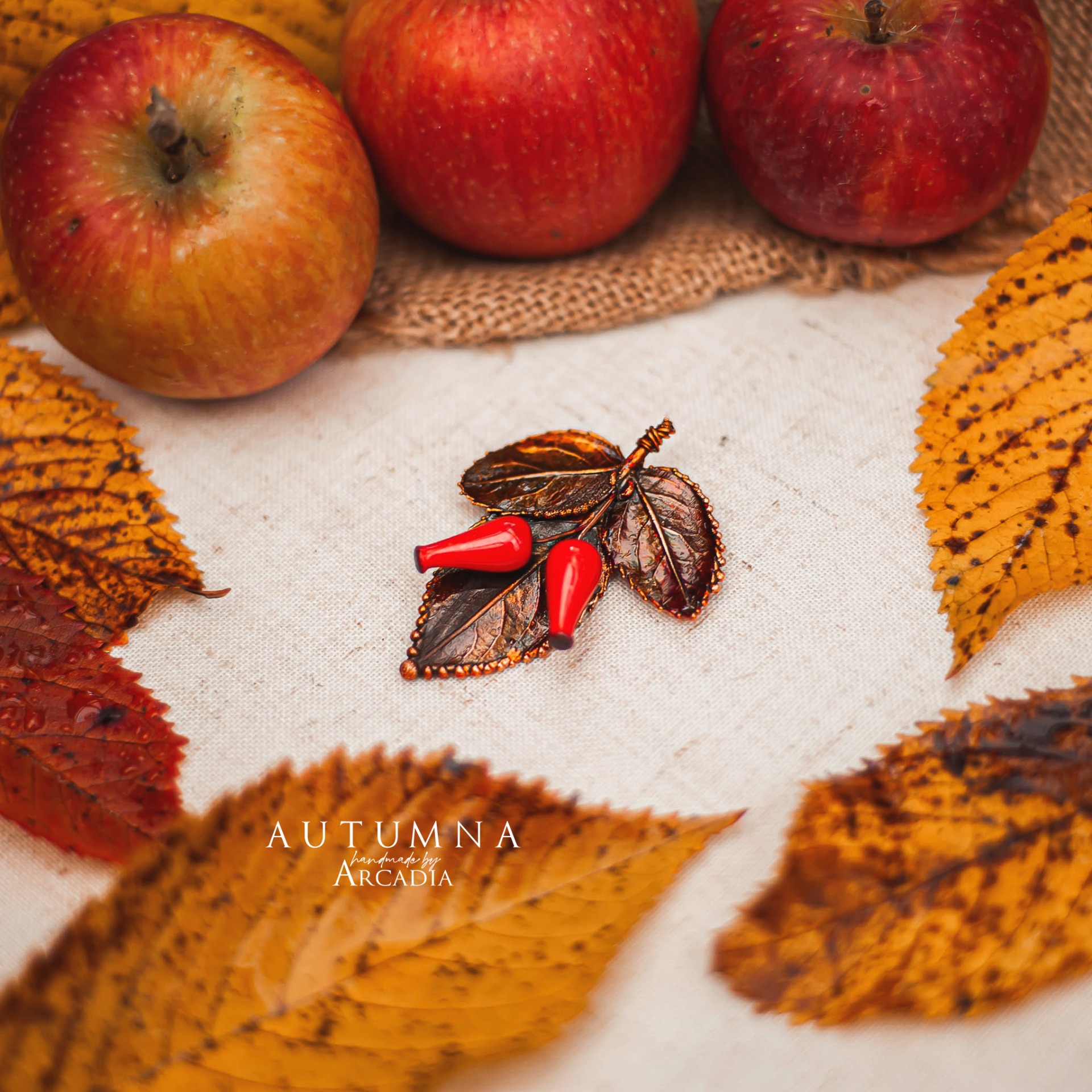 Brož se skutečnými pokovenými lístečky z šípkového keře, ozdobená dvojicí šípků z českého vinutého skla. Vyrobeno rukama a srdcem v alchymistické dílně na severu Čech.