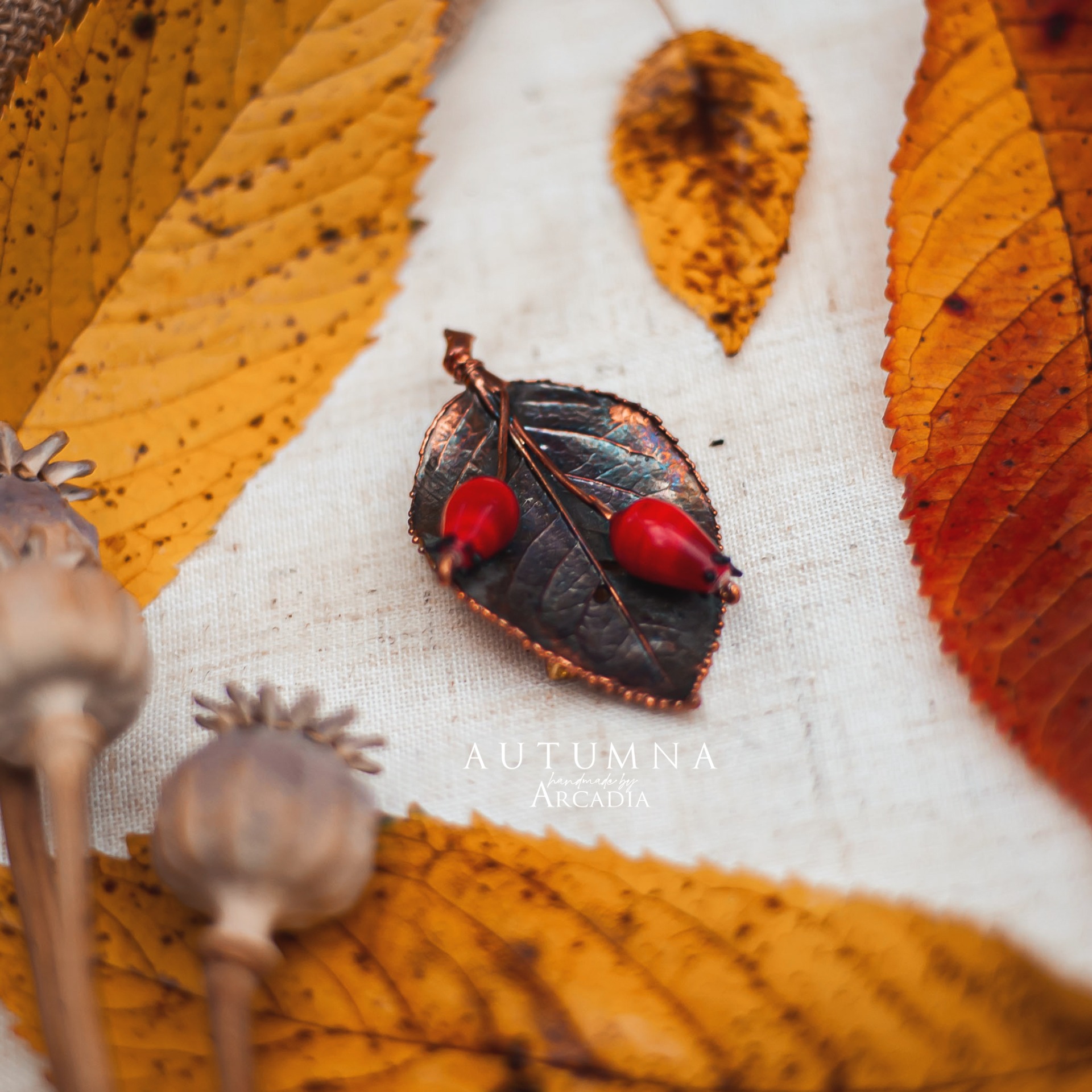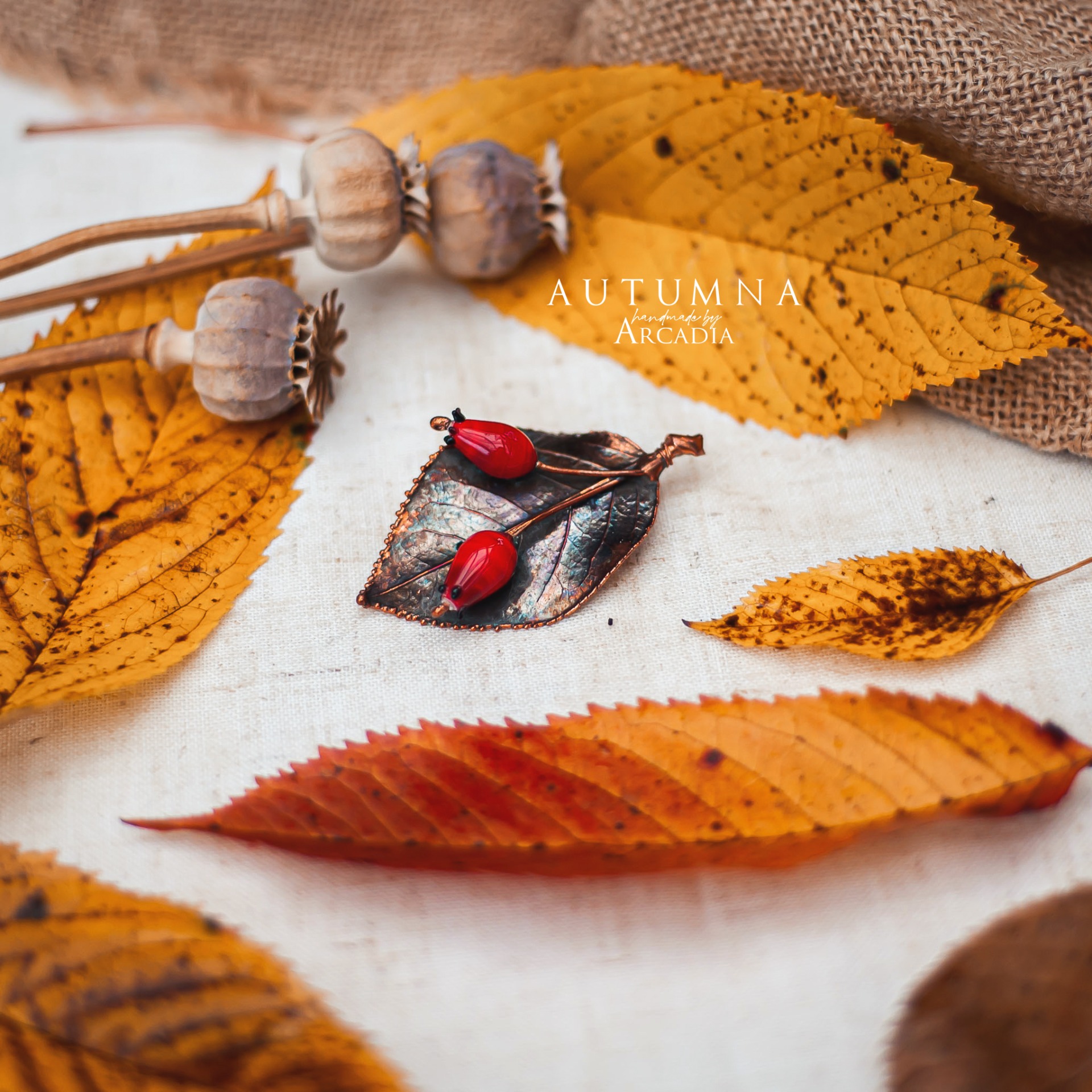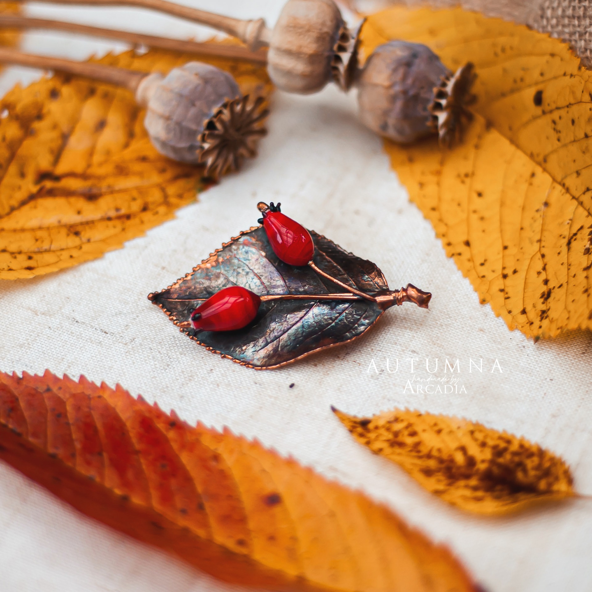 Brož ze skutečného pokoveného lístku šípkového keře s dvojicí sklěněných šípků z českého ručně vinutého skla. Vyrobeno rukama a srdcem v alchymistické dílně na severu Čech.
