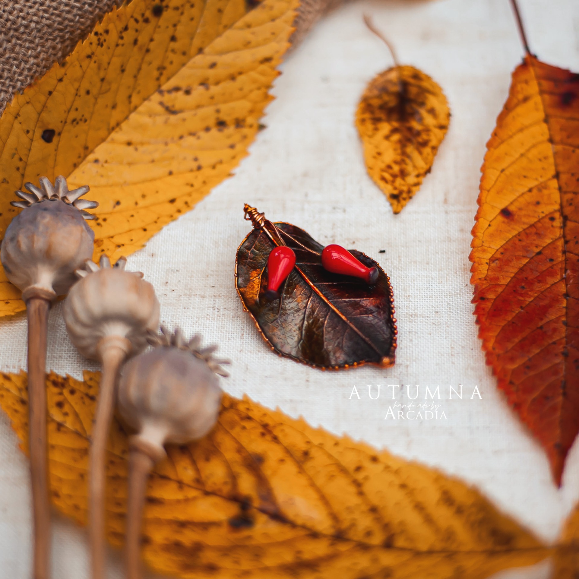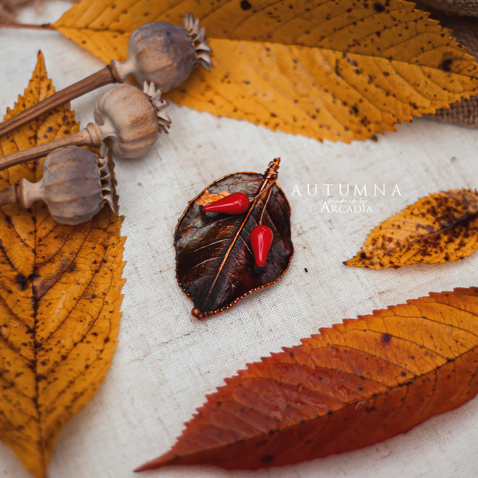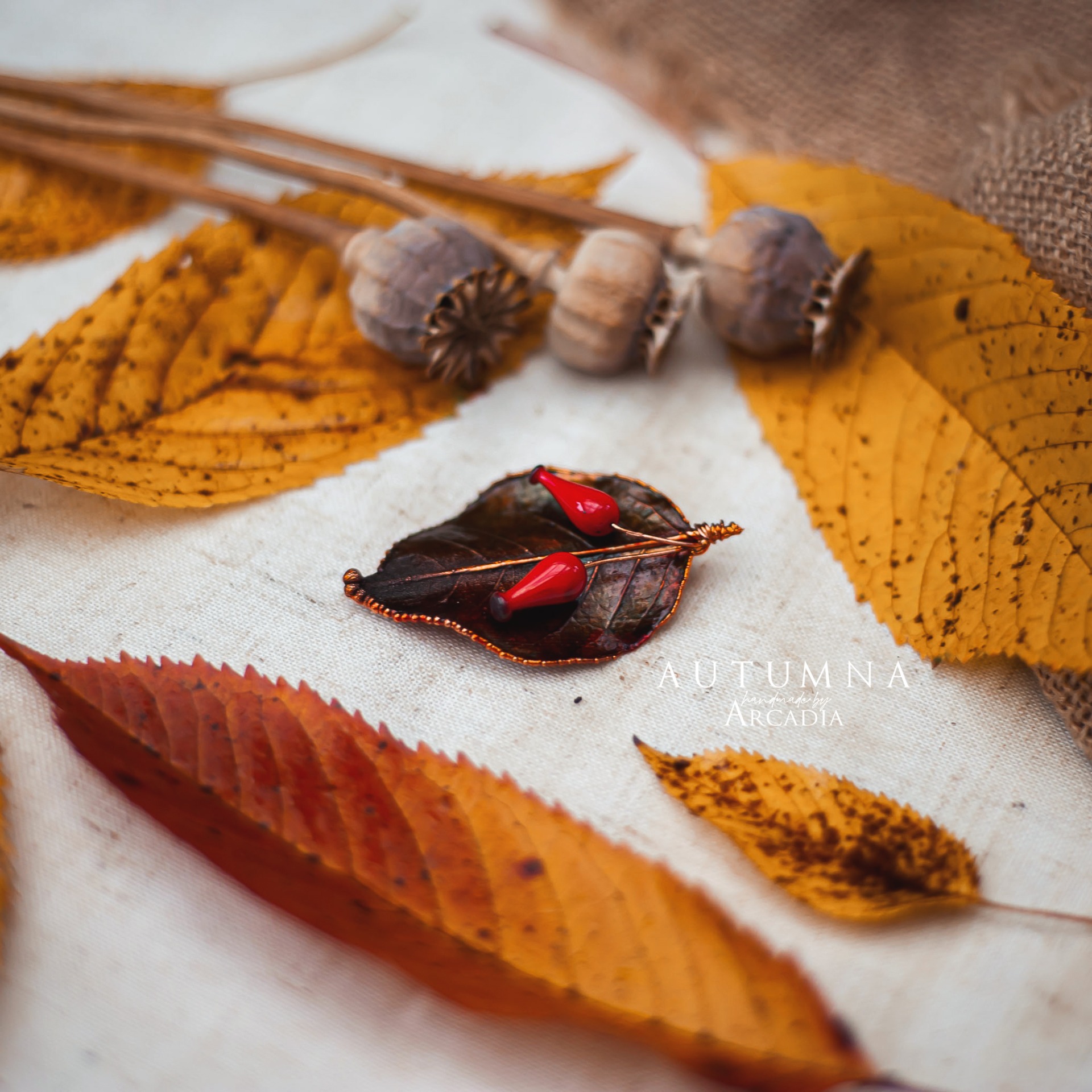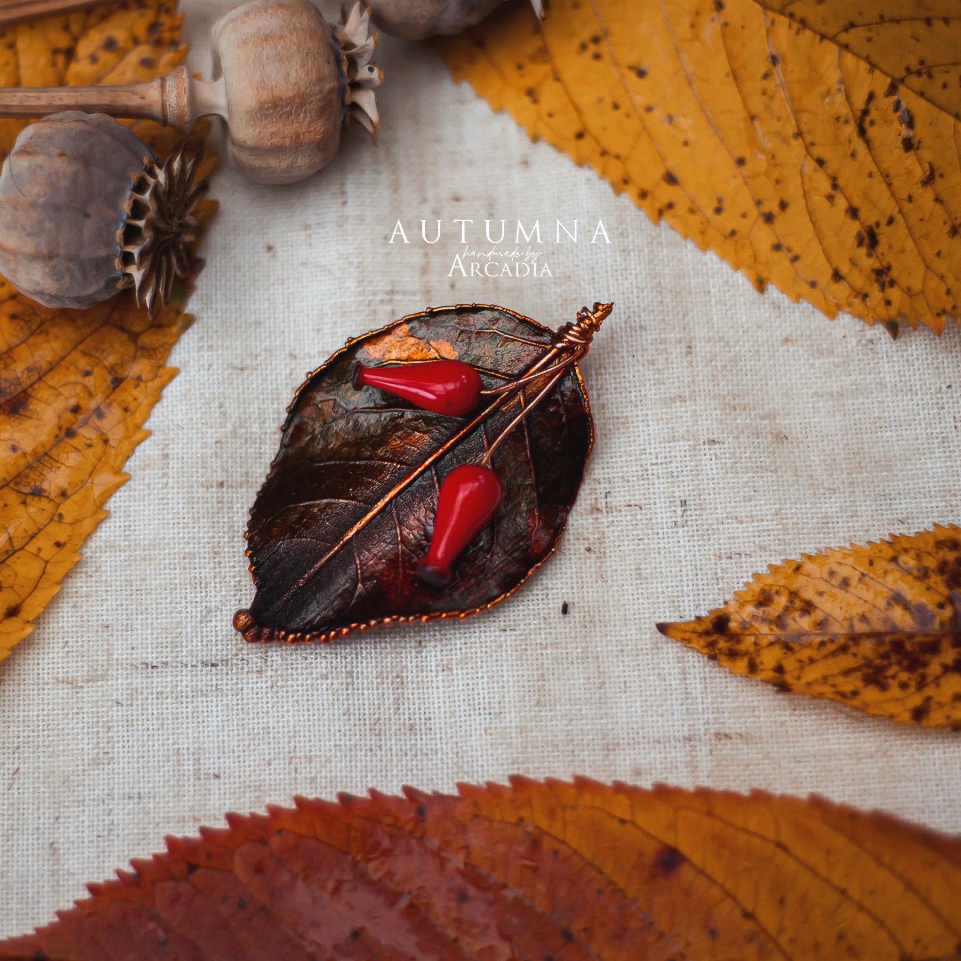 Brož ze skutečného pokoveného lístku šípkového keře s dvojicí sklěněných šípků z českého ručně vinutého skla. Vyrobeno rukama a srdcem v alchymistické dílně na severu Čech.