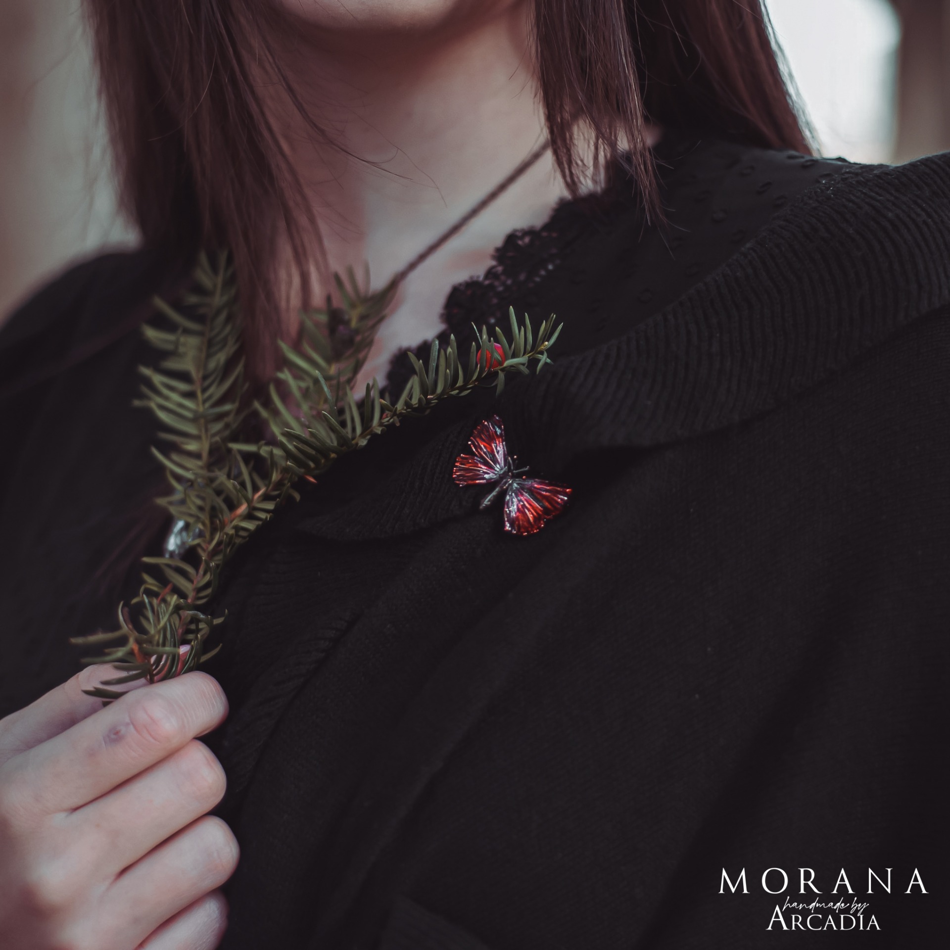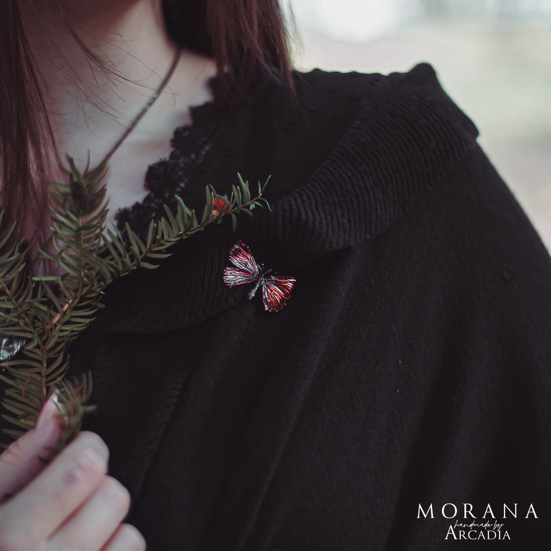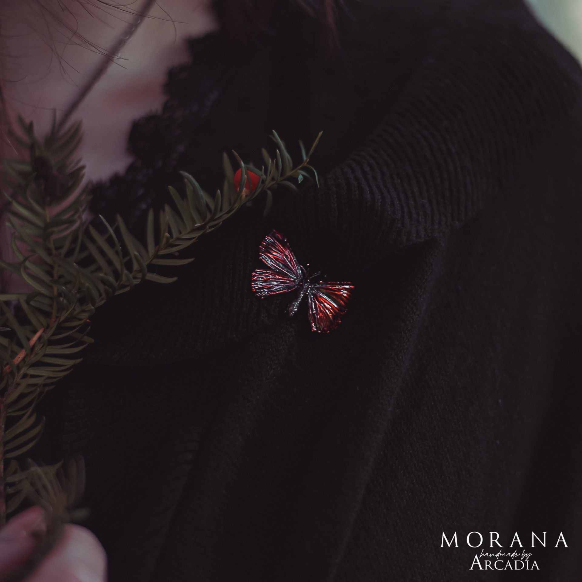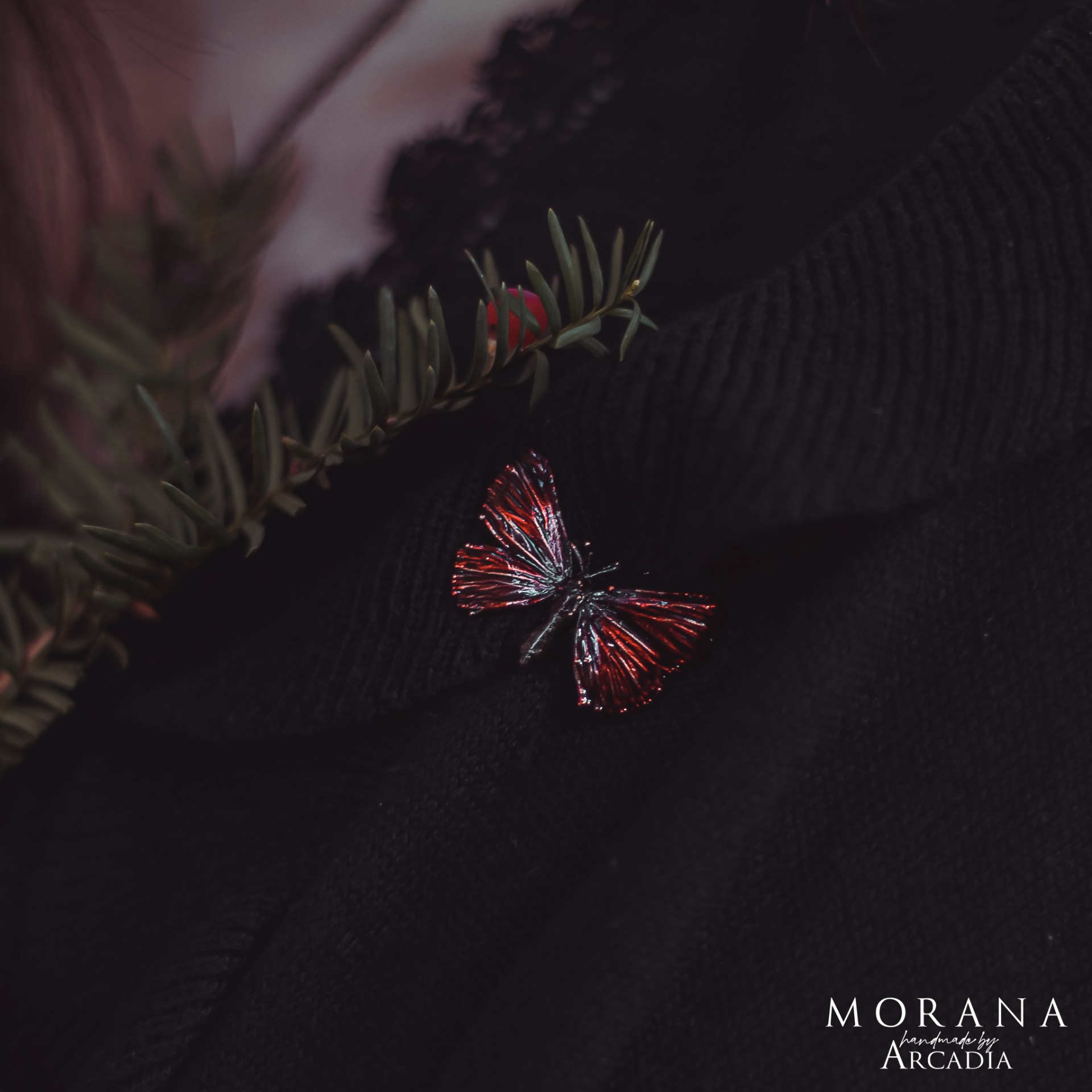 Brož se skutečnou pokovenou můrkou s karmínově rudými křidélky. Drobný a nenápadný, leč výrazný doplněk. Odznakový mechanismus. Vyrobeno rukama a srdcem v alchymistické dílně na severu Čech.
