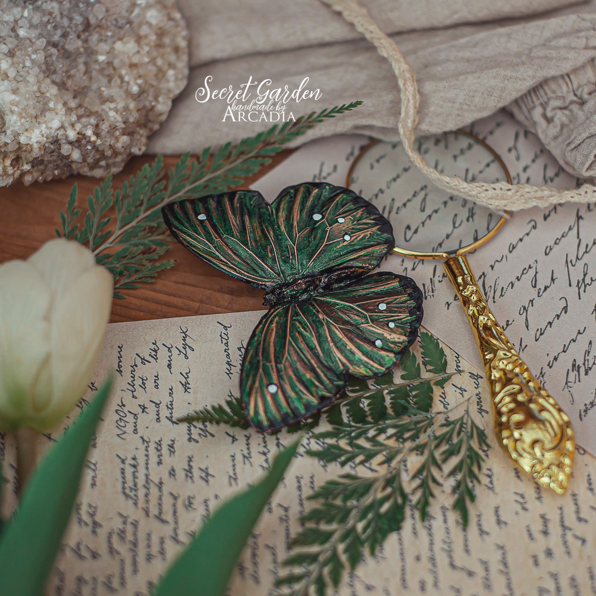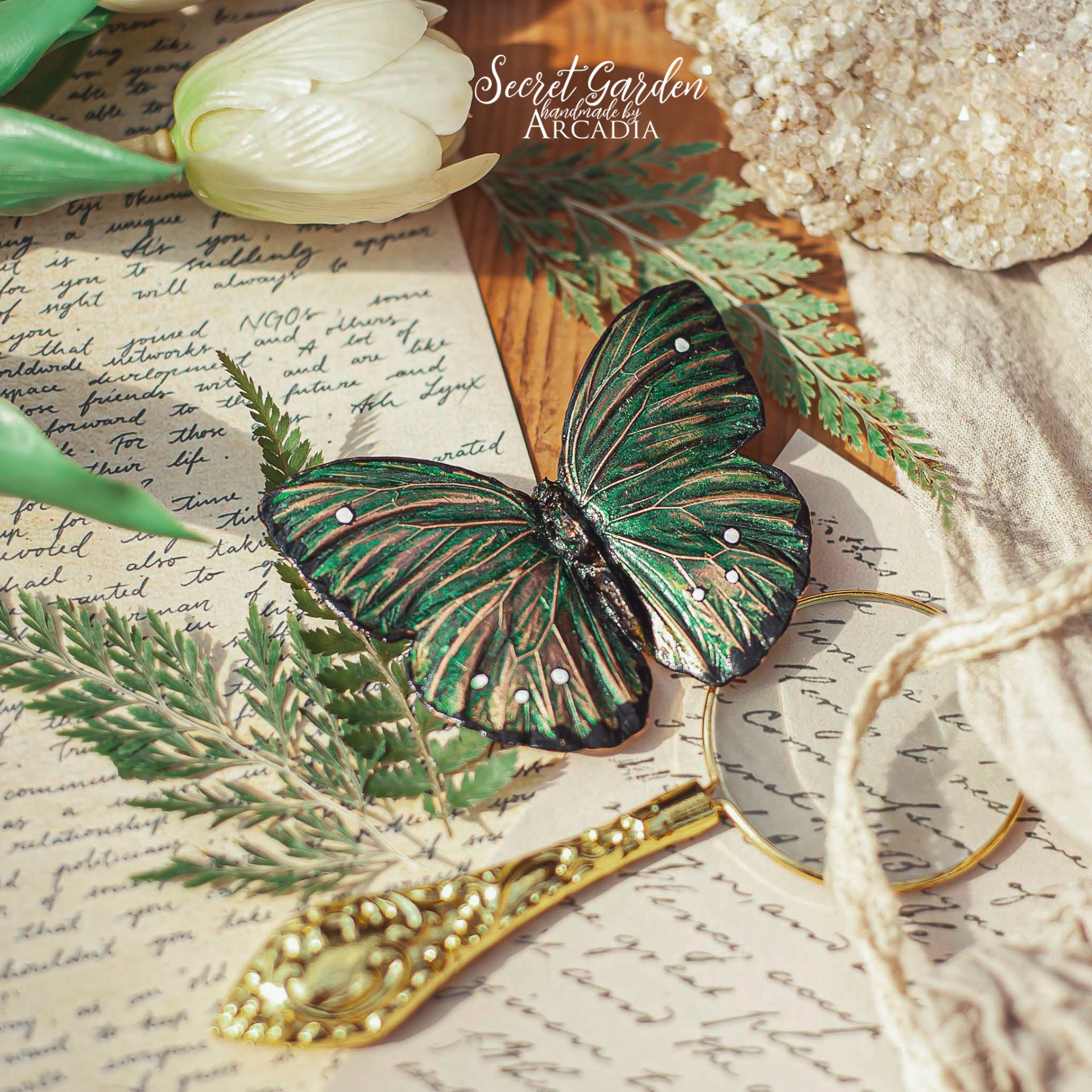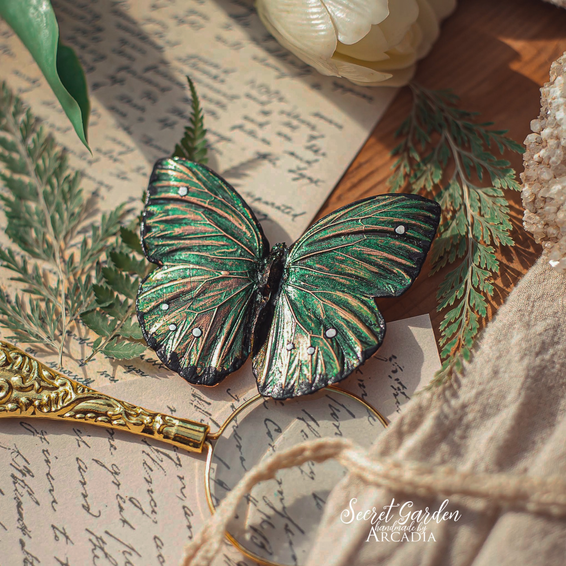 Velká výrazná brož se skutečným pokoveným motýlkem s měňavými třpytivými zelenými křidélky. Vyrobeno rukama a srdcem v alchymistické dílně na severu Čech.