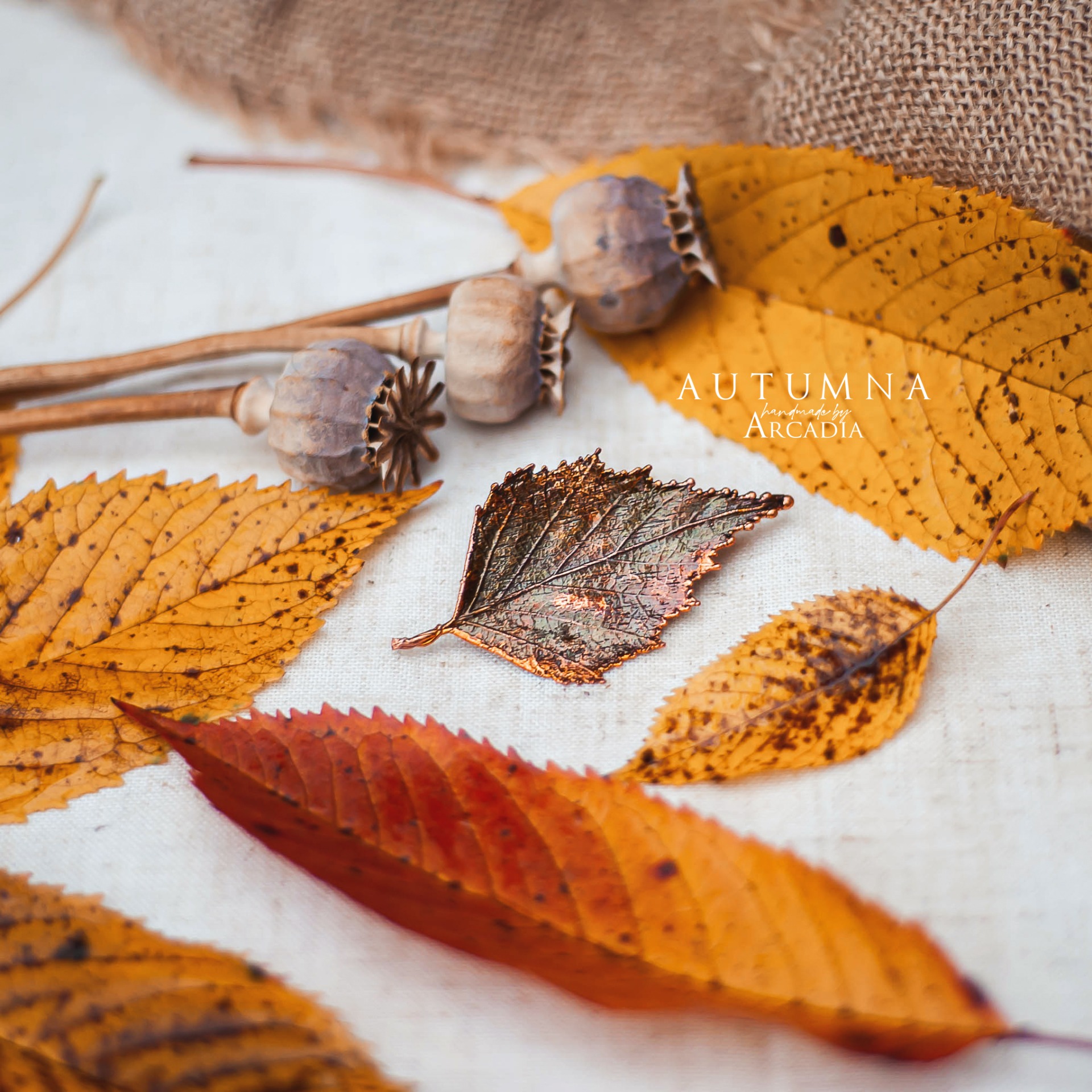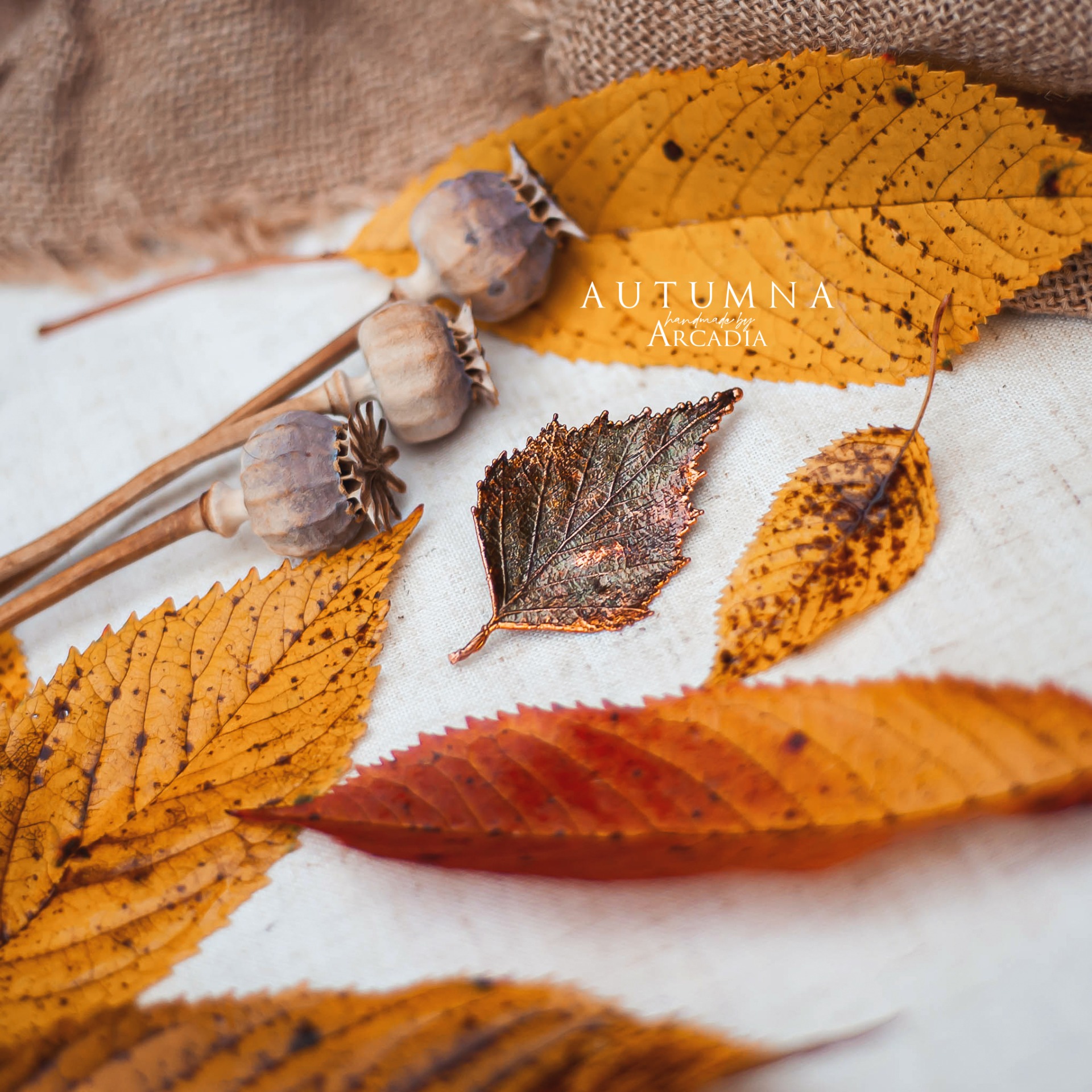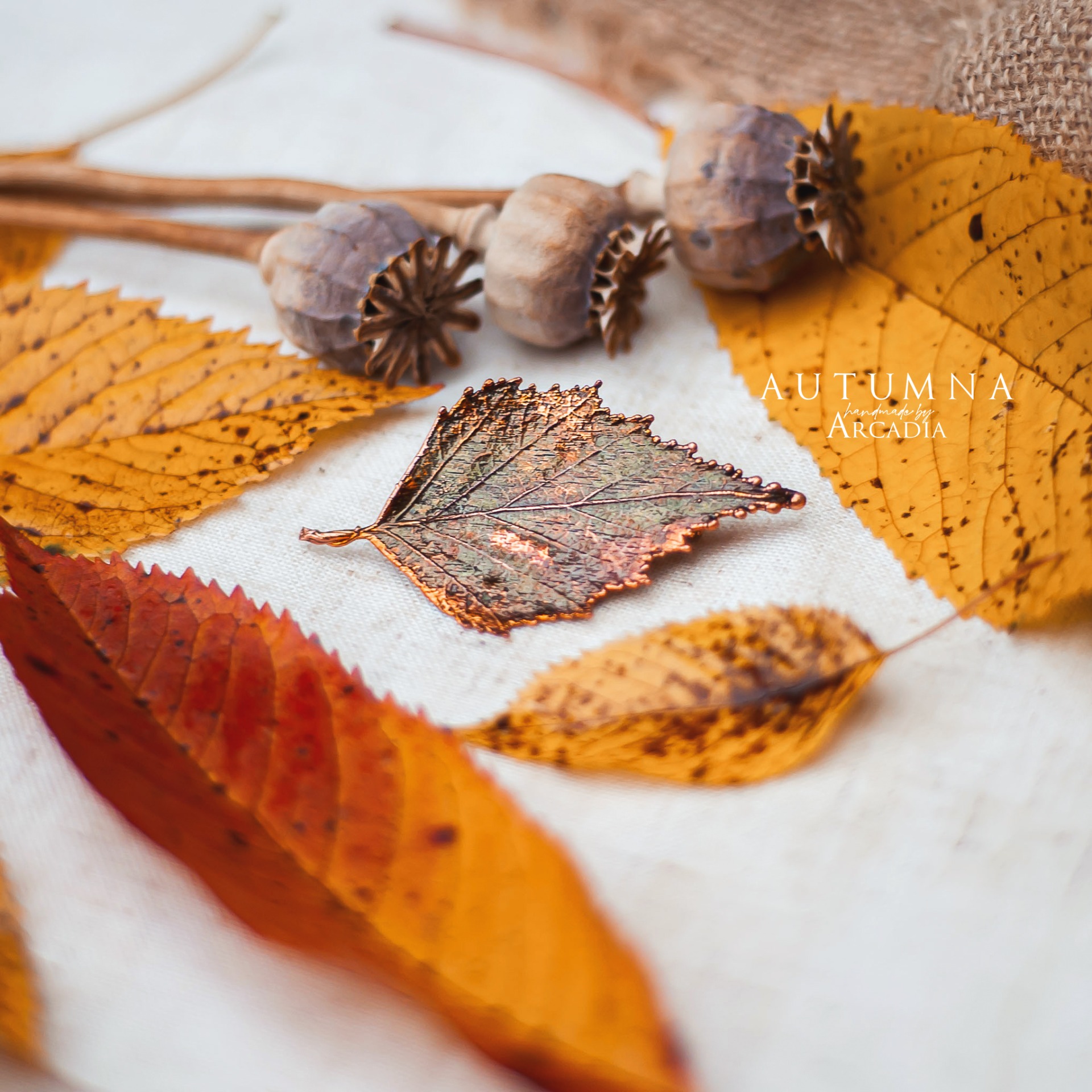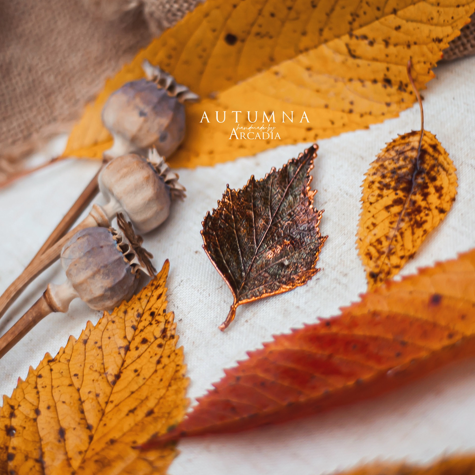 Brož ze skutečného pokoveného březového lístku v podzimních odstínech žluté a zlatavé. Vyrobeno rukama a srdcem v alchymistické dílně na severu Čech.
