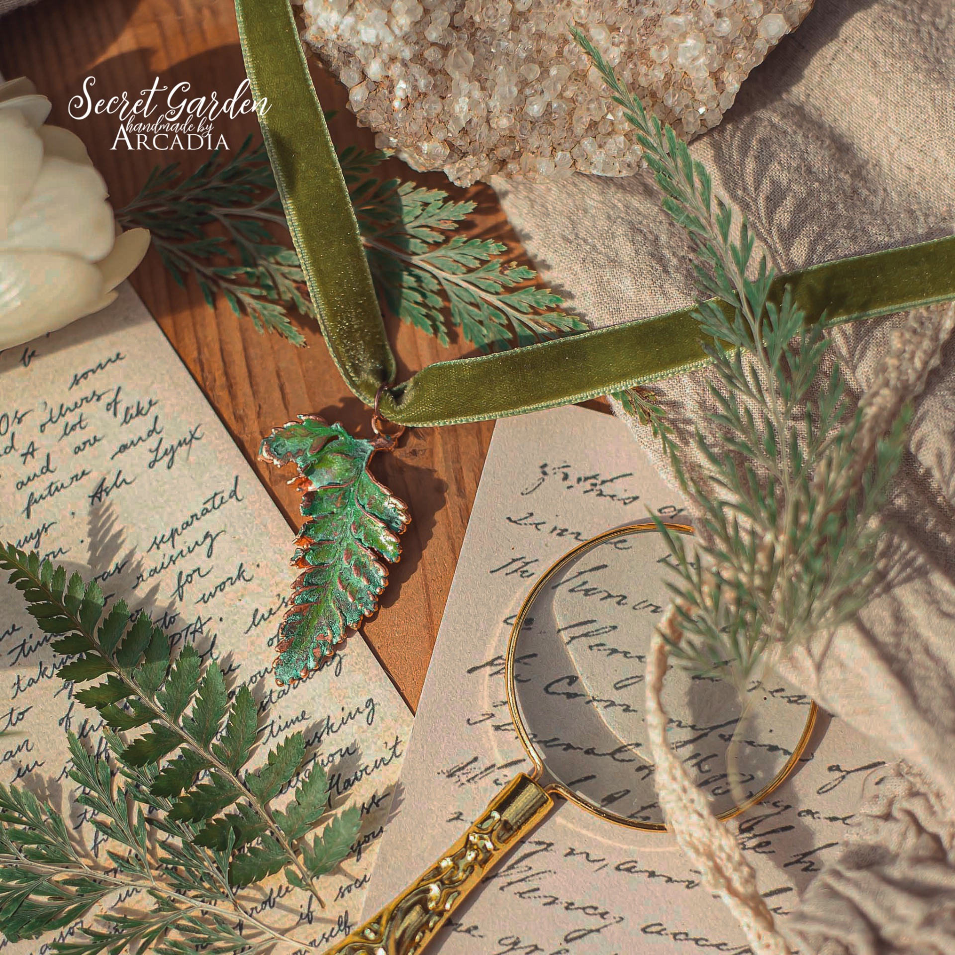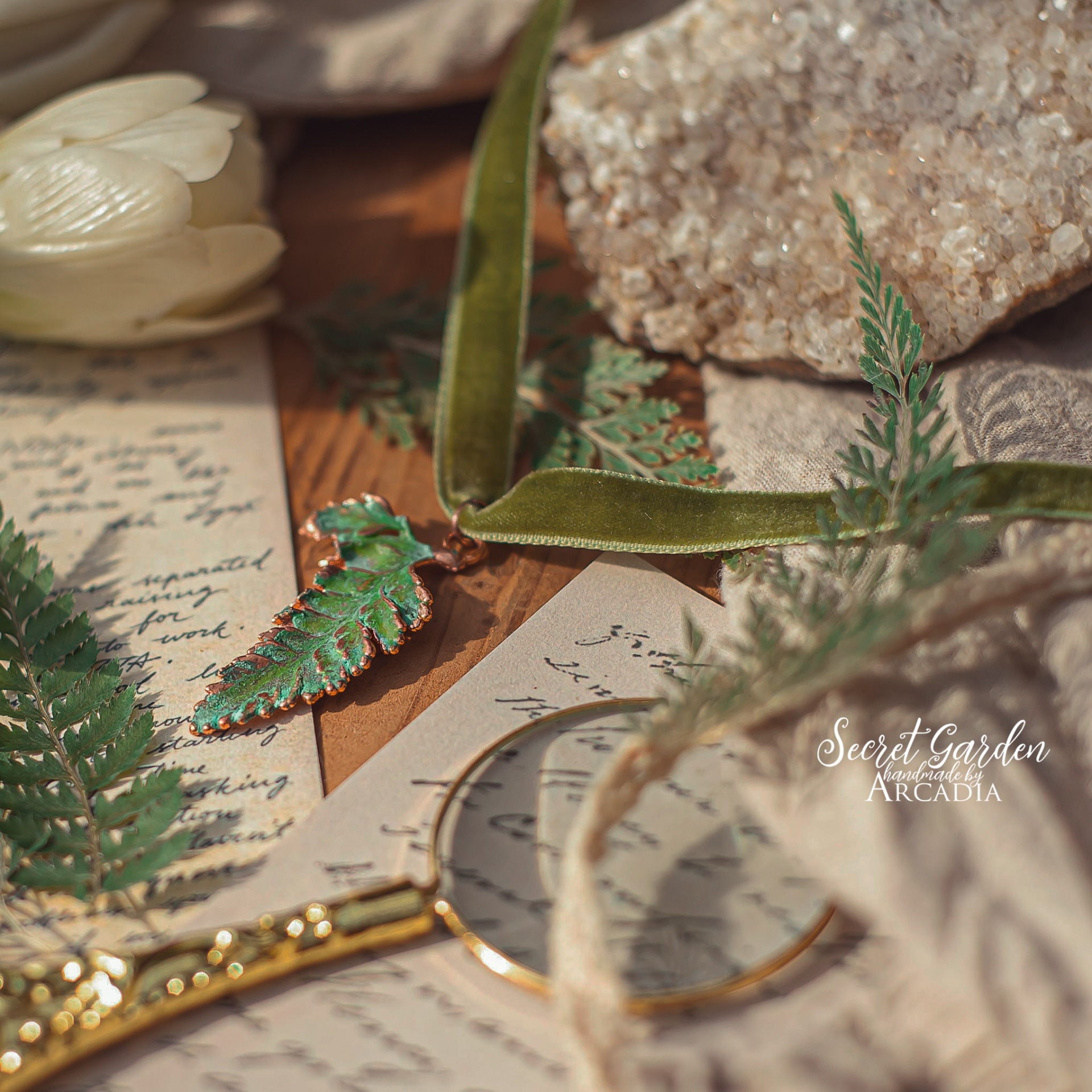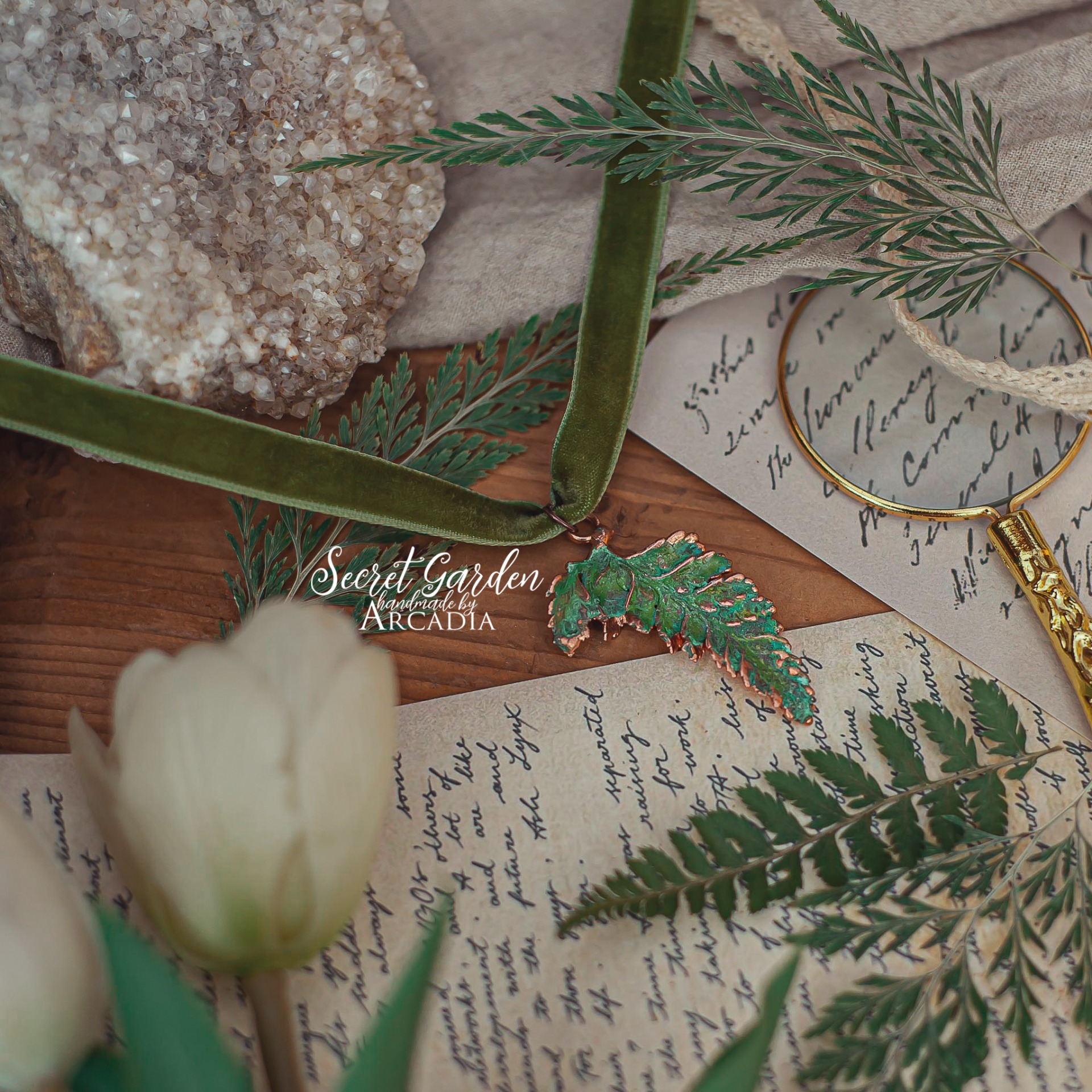 Choker s přívěskem ze skutečné pokovené kapradiny v jemném vintage zelenkavém provedení na zelenkavé sametce se zapínáním. Délka lehce nastavitelná. Vyrobeno rukama a srdcem v alchymistické dílně na severu Čech.