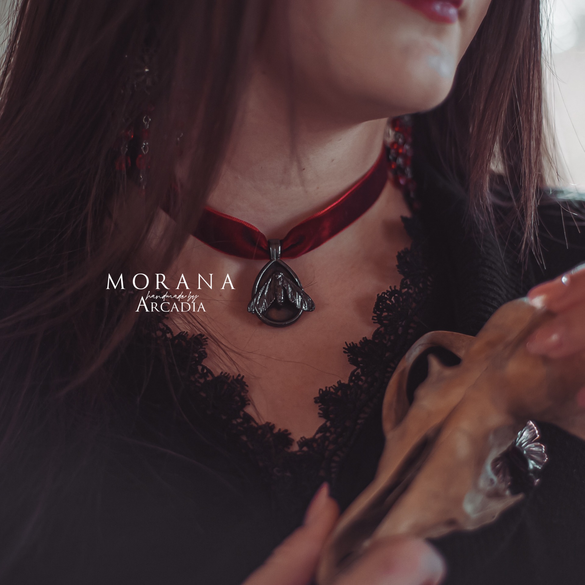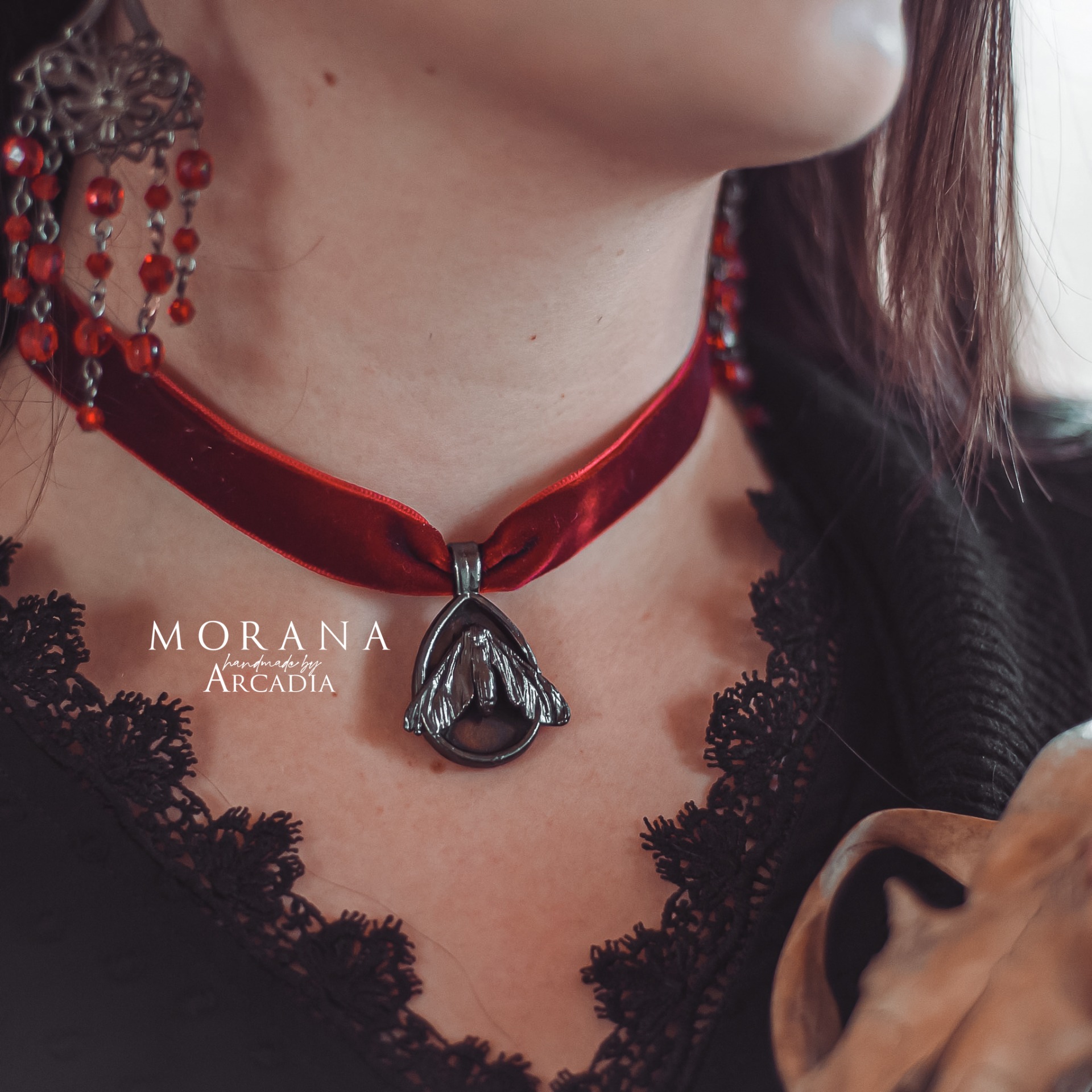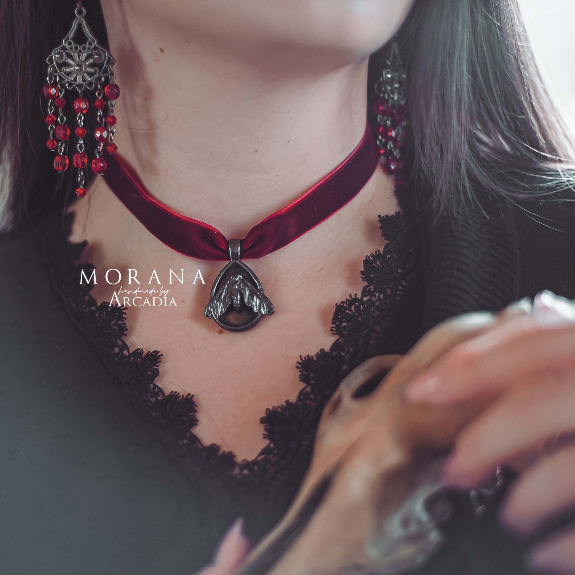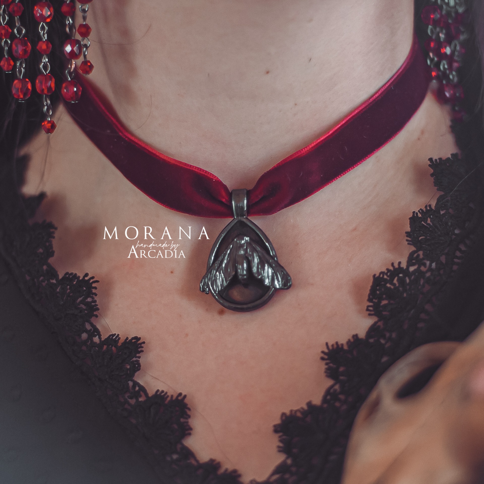 Sametový choker se zapínáním a prodlužkou s medailonkem se skutečnou pokovenou můrkou vyvedenou v temné gunmetal patině. Vyrobeno rukama a srdcem v alchymistické dílně na severu Čech.