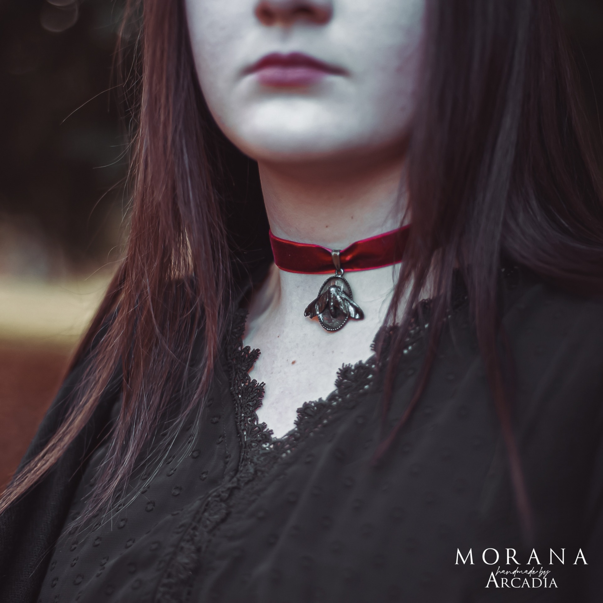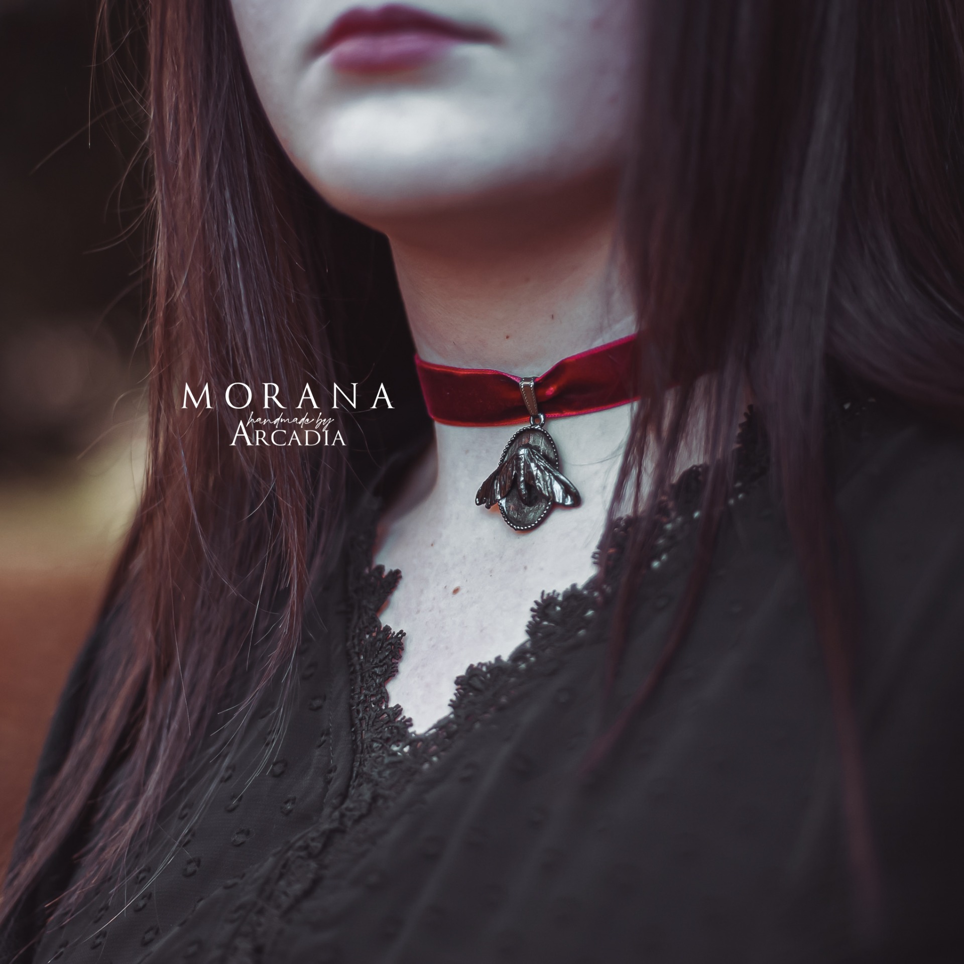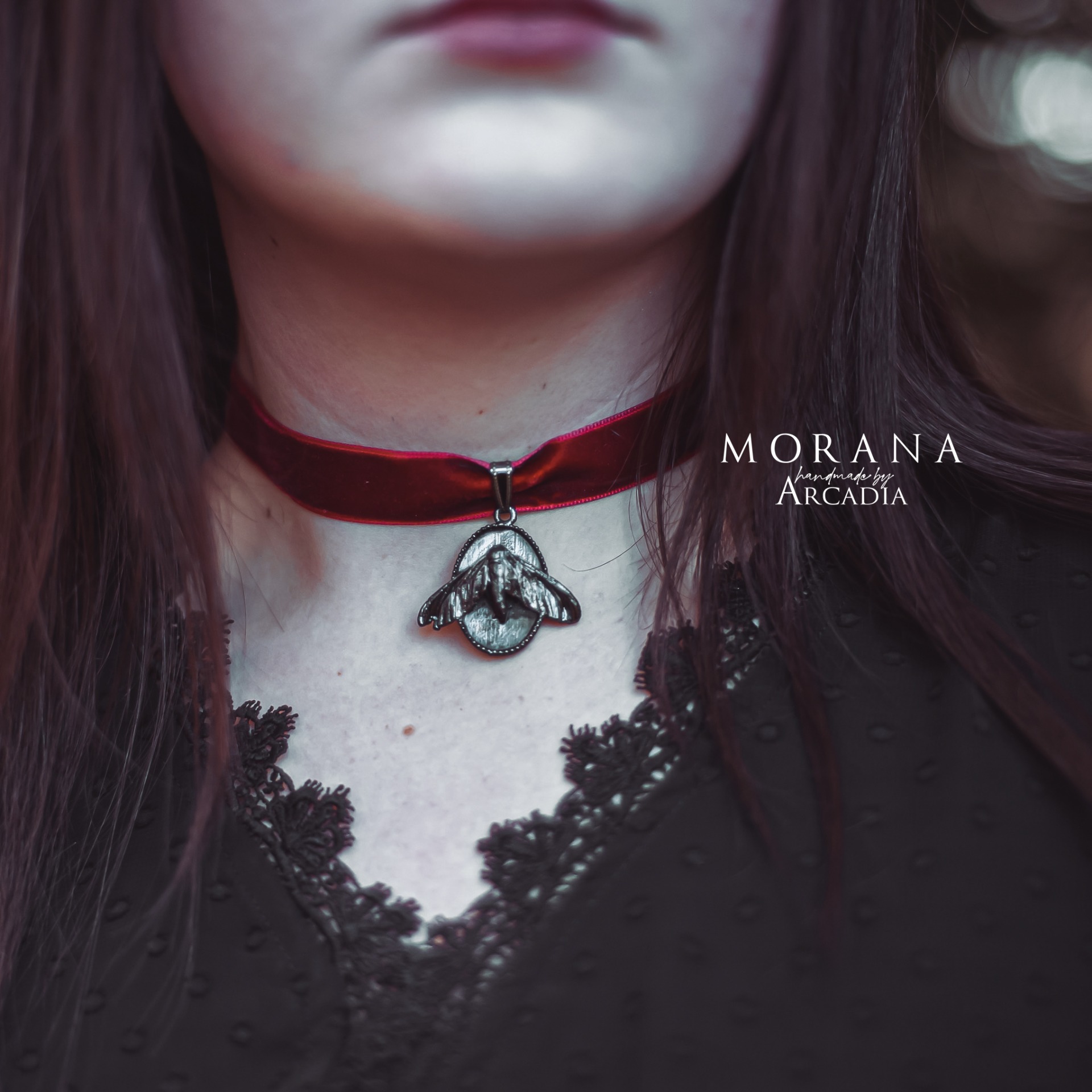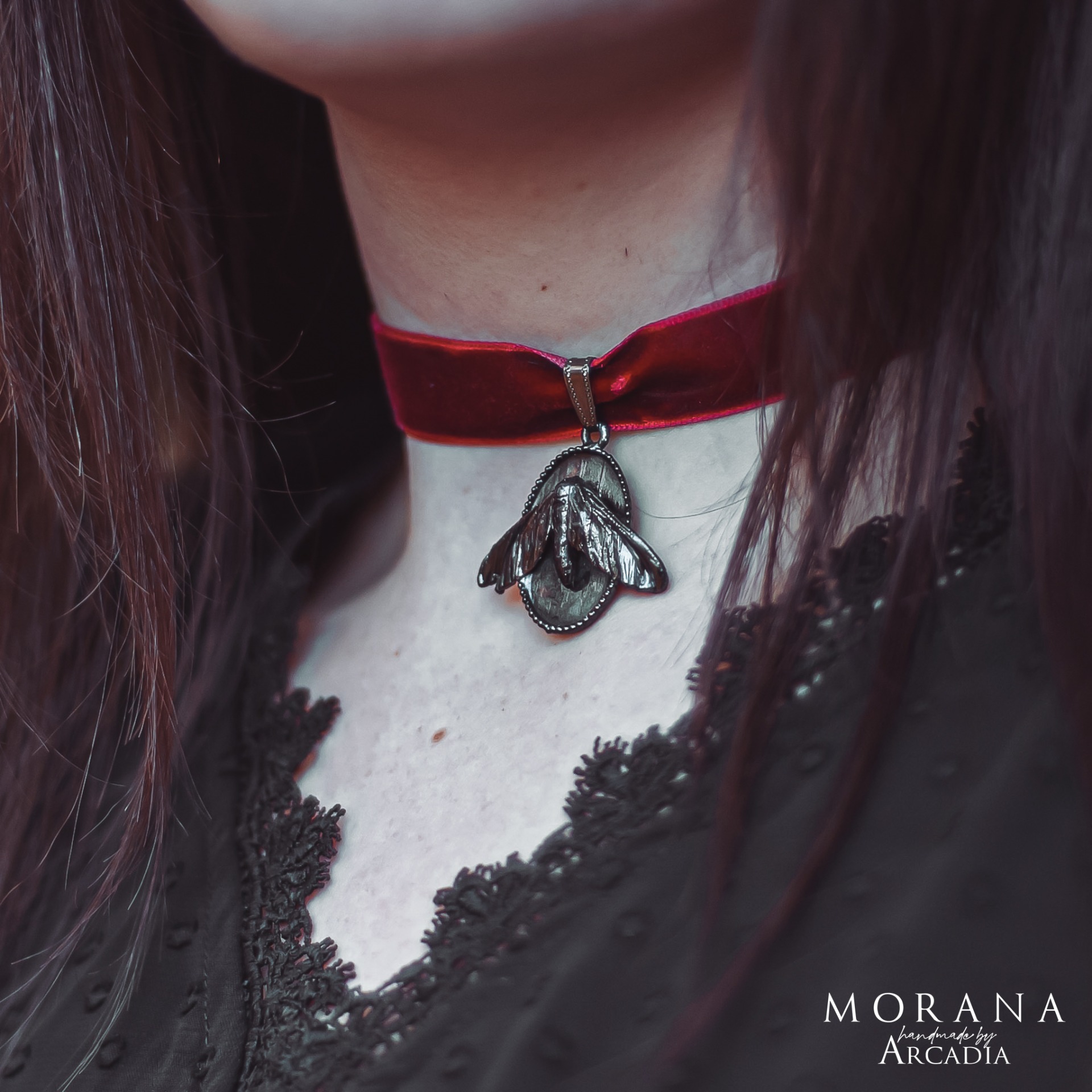Sametový choker se zapínáním a prodlužkou s medailonkem se skutečnou pokovenou můrkou vyvedenou v temné gunmetal patině. Vyrobeno rukama a srdcem v alchymistické dílně na severu Čech.