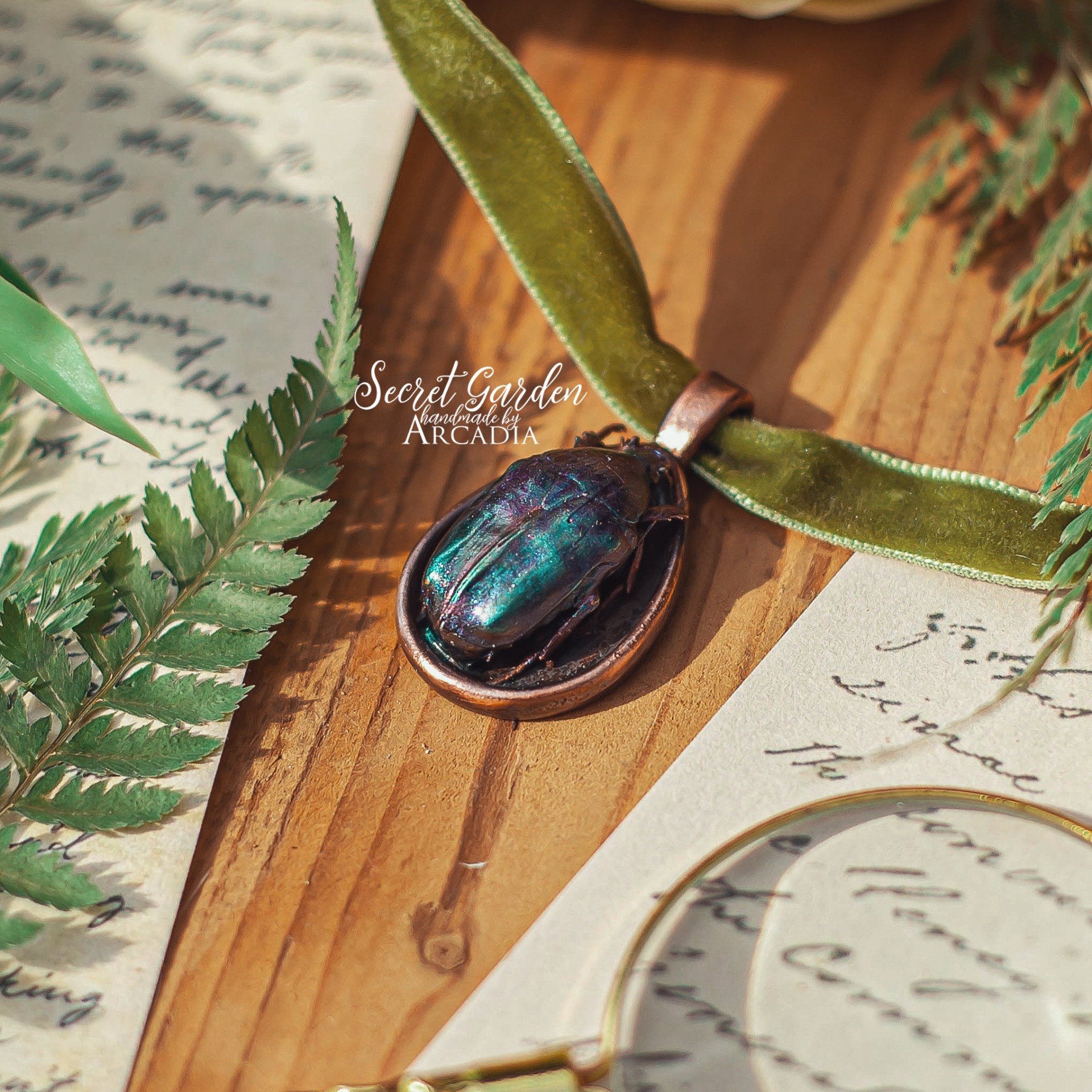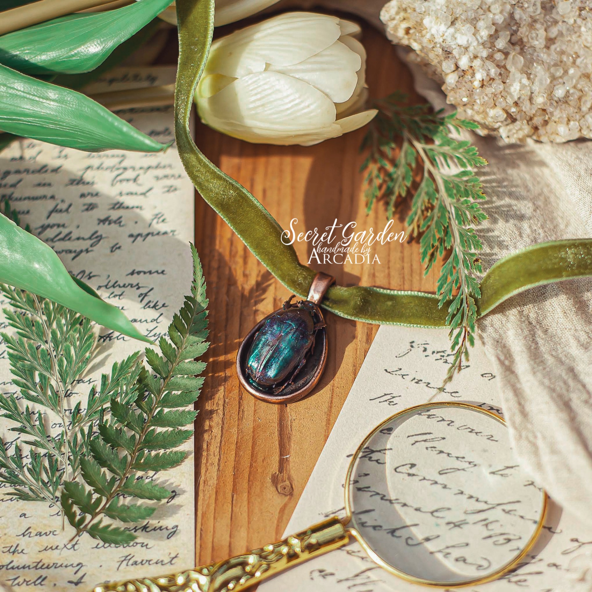 Choker s přívěskem ze skutečného pokoveného afrického zlatohlávka vyvedeného v realistických kovově leklých barvách, usazeného ve zdobném vintage lůžku na jarní zelenkavé sametce se zapínáním. Délka lehce nastavitelná. Vyrobeno rukama a srdcem v alchymistické dílně na severu Čech.