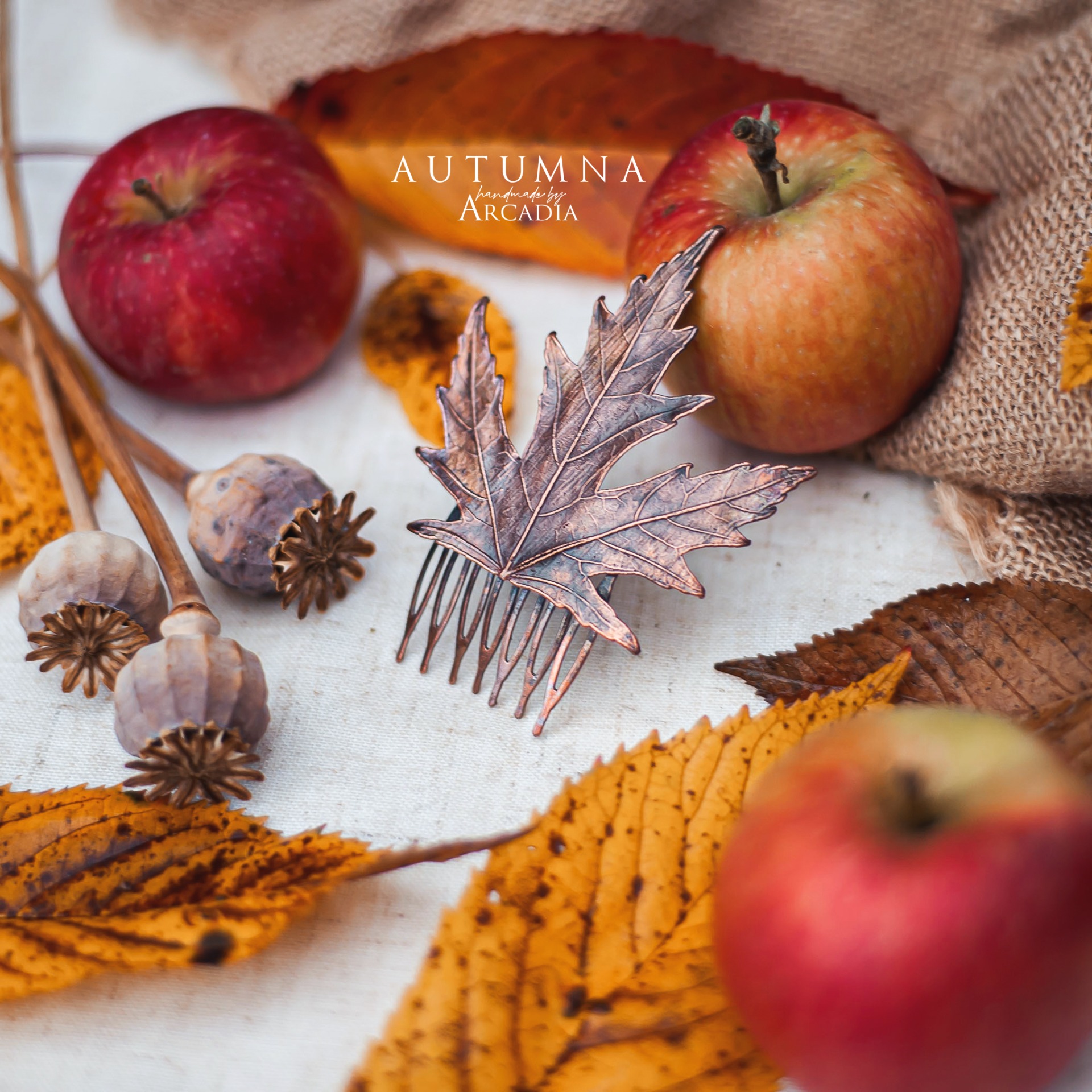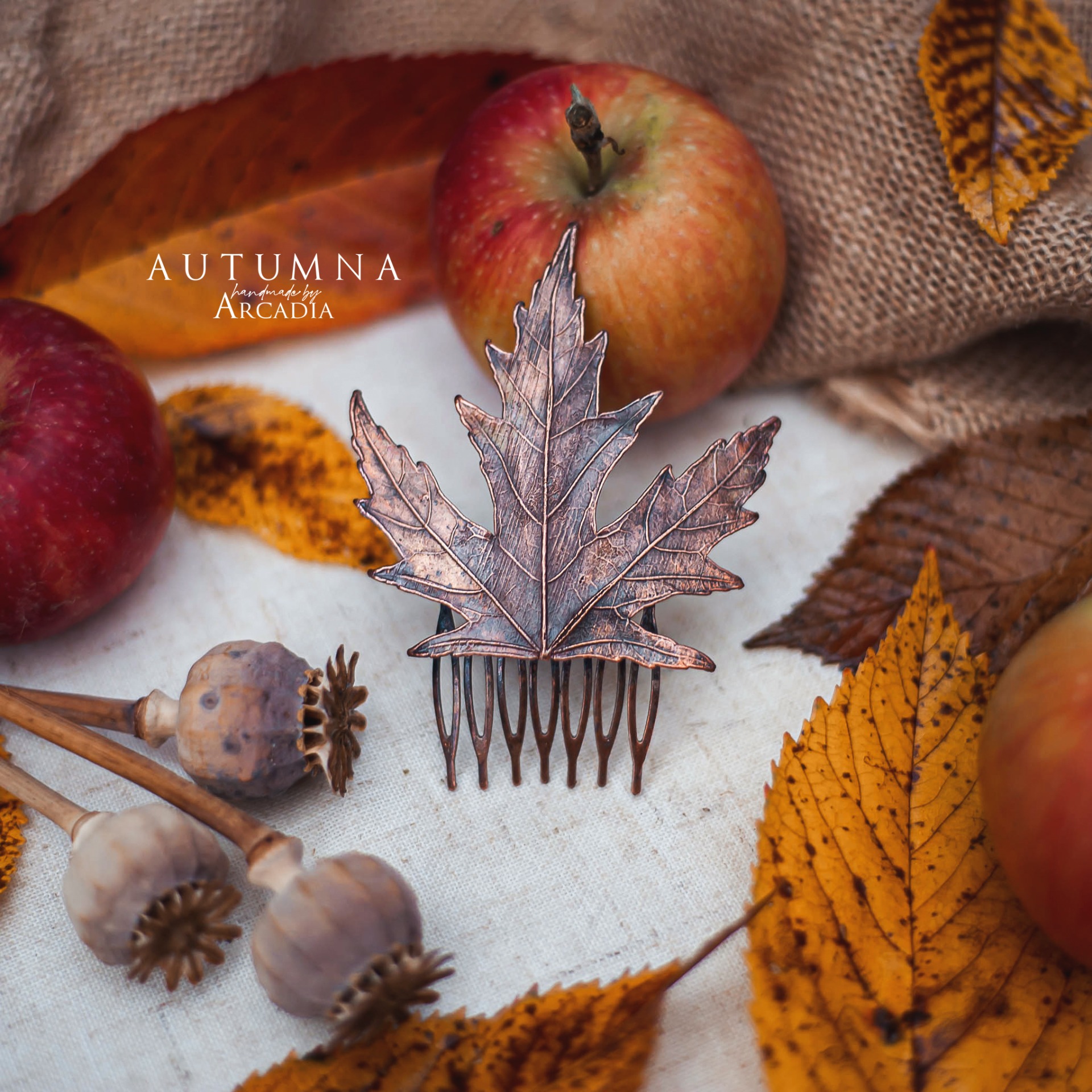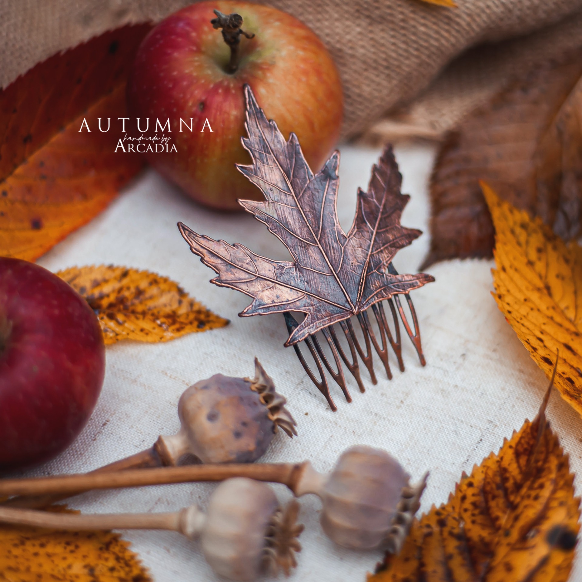 Hřebínek do vlasů ze skutečného pokoveného lístku cukrového javoru v antické patině. Vyrobeno rukama a srdcem v alchymistické dílně na severu Čech.