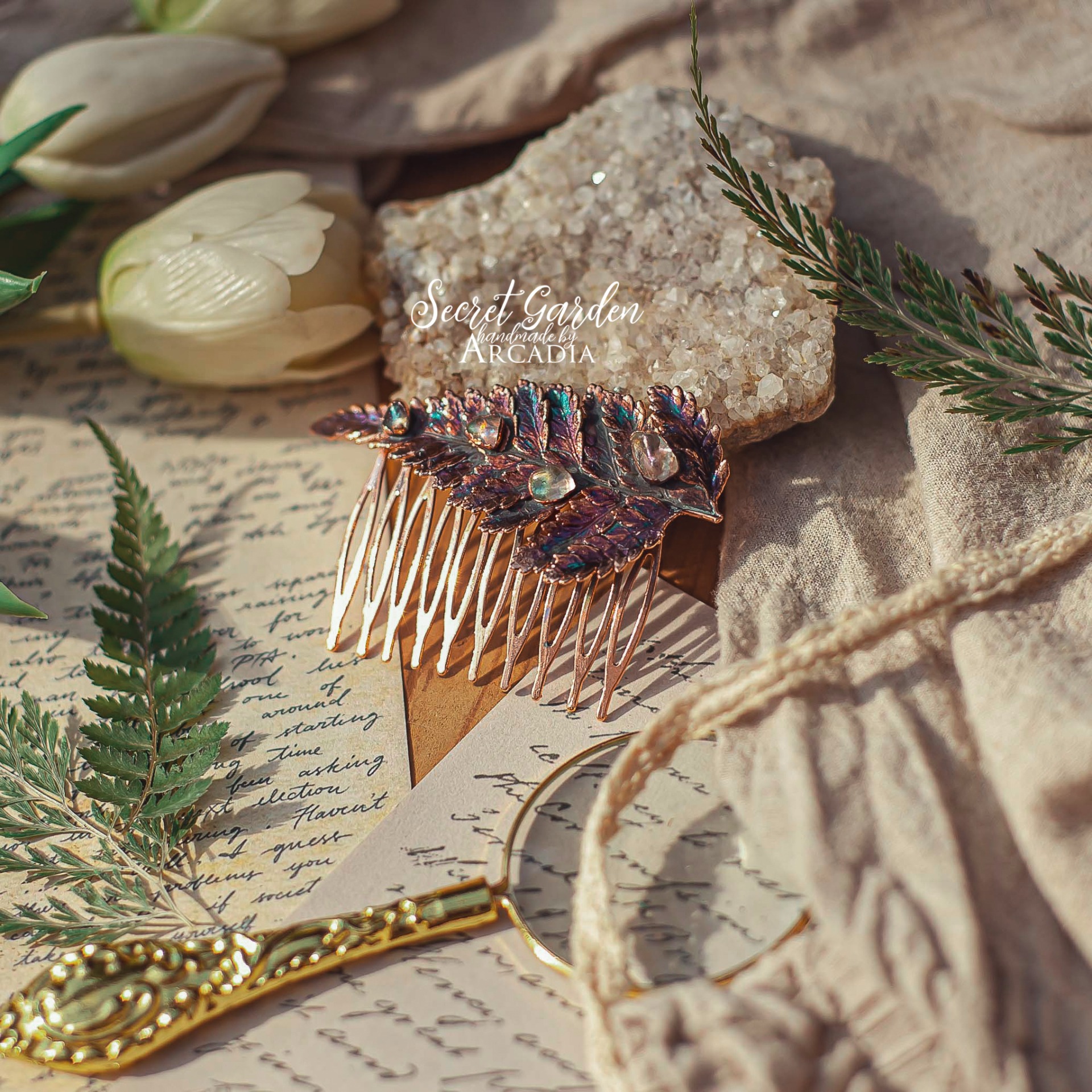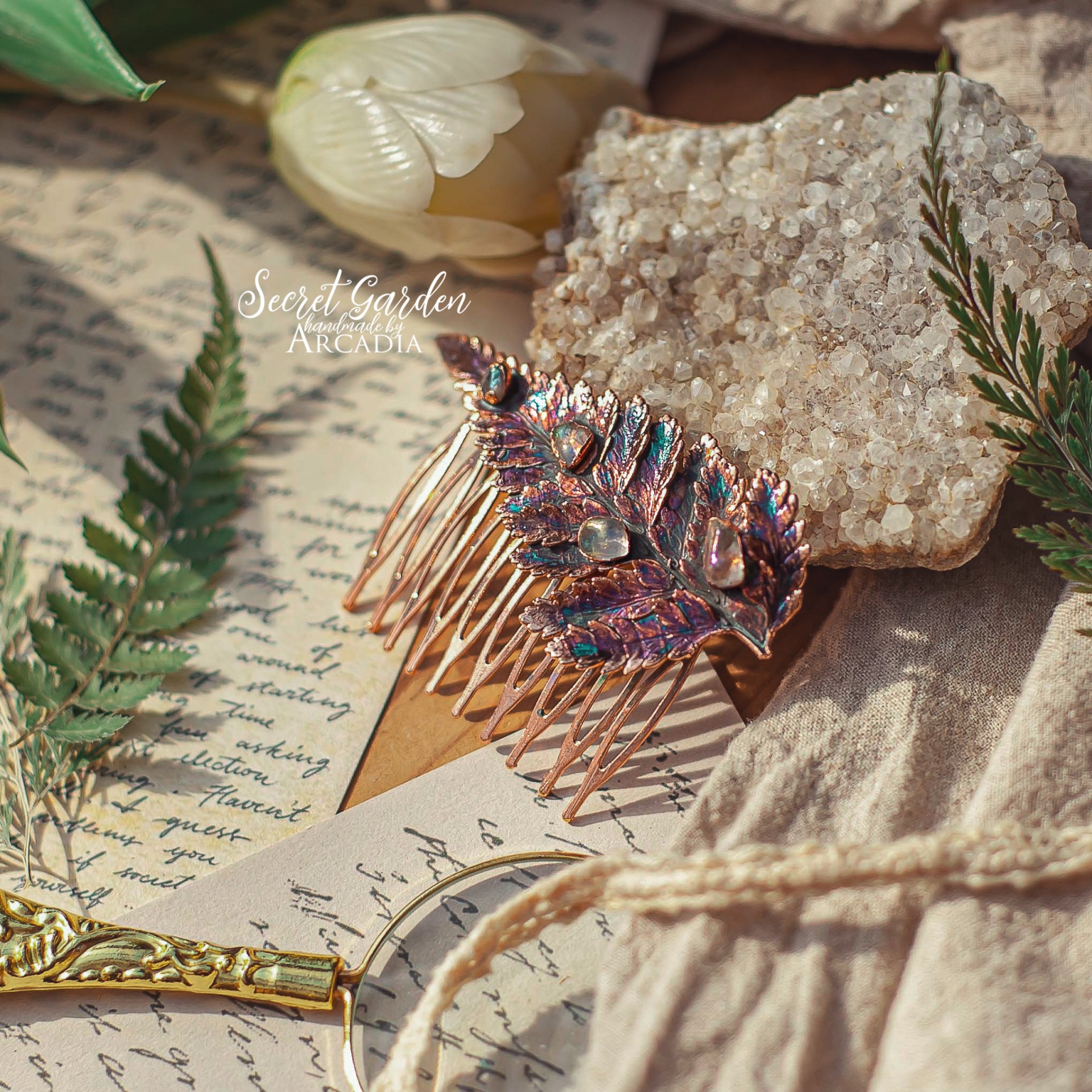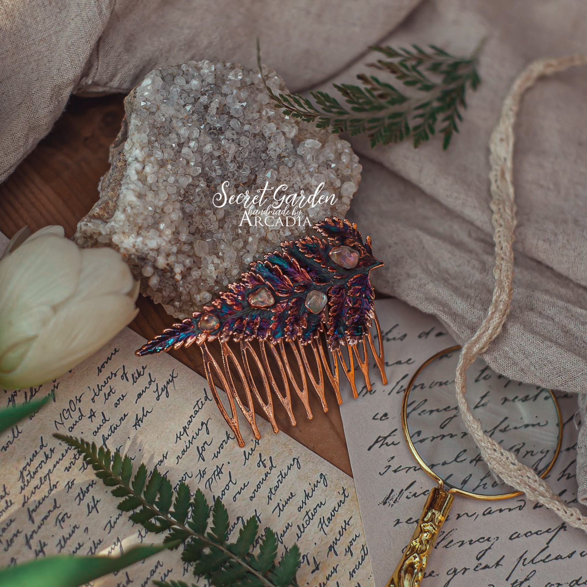 Měděný hřebínek do vlasů ze skutečné pokovené kapradiny v olejově duhových odstínech s tromlovanými valounky aura křišťálu. Vyrobeno rukama a srdcem v alchymistické dílně na severu Čech.