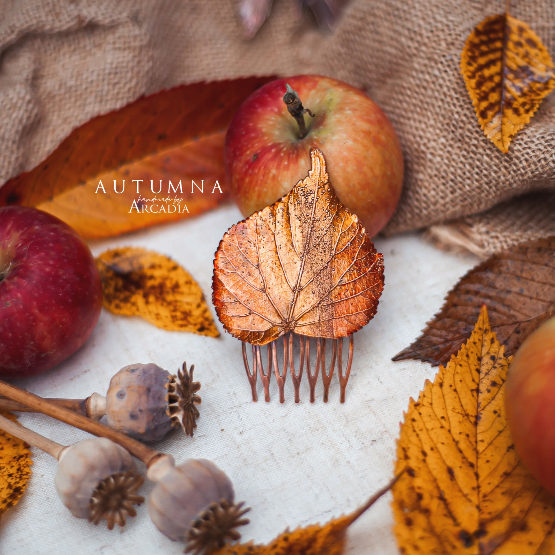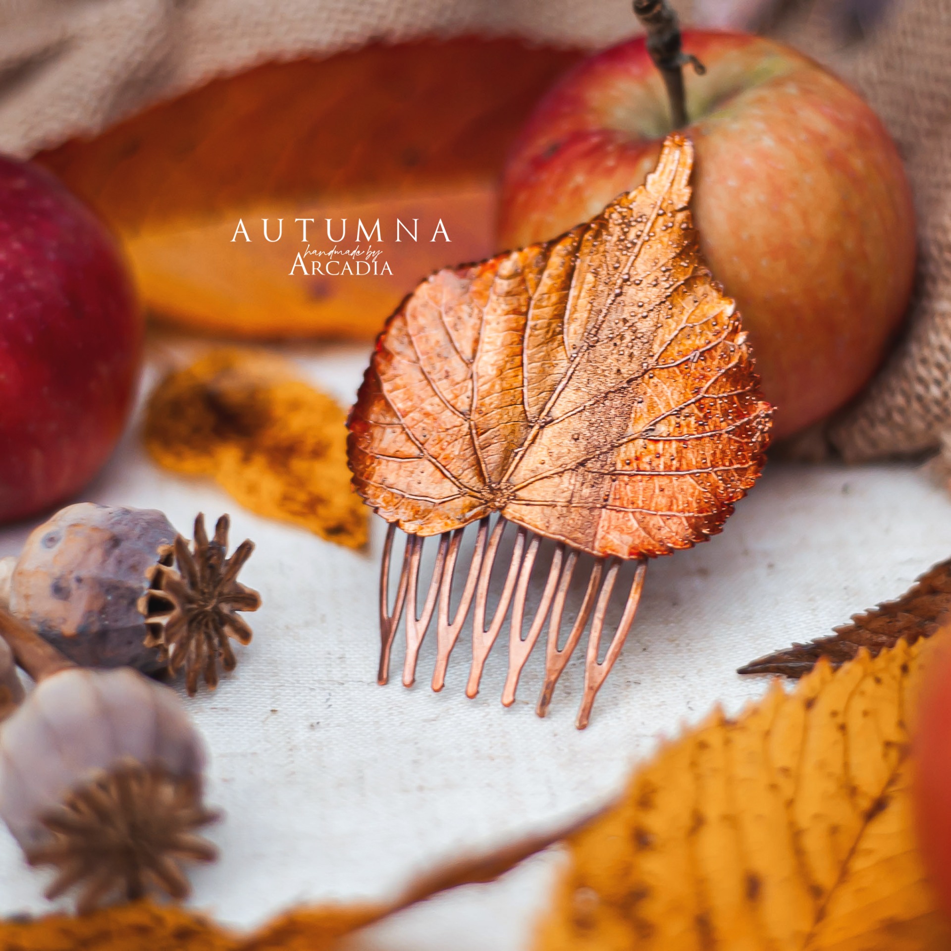 Hřebínek do vlasů ze skutečného pokoveného lipového lístku v ohnivých podzimních odstínech. Vyrobeno rukama a srdcem v alchymistické dílně na severu Čech.