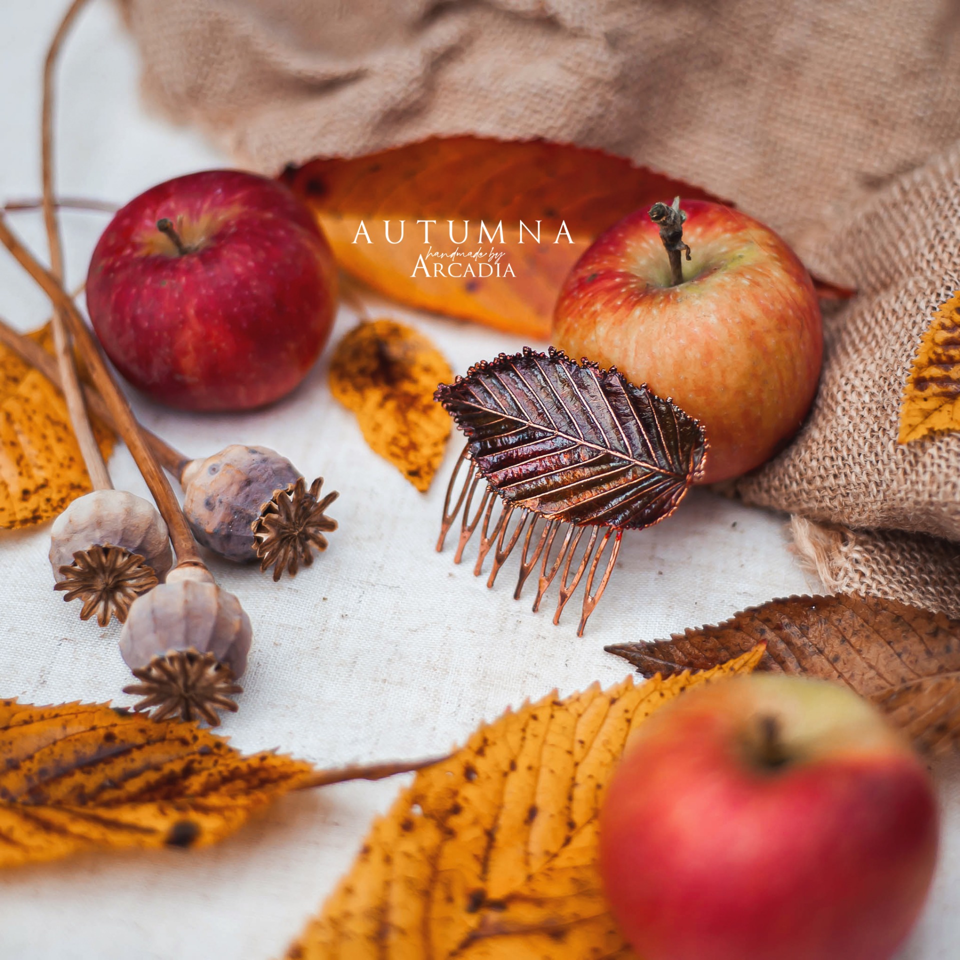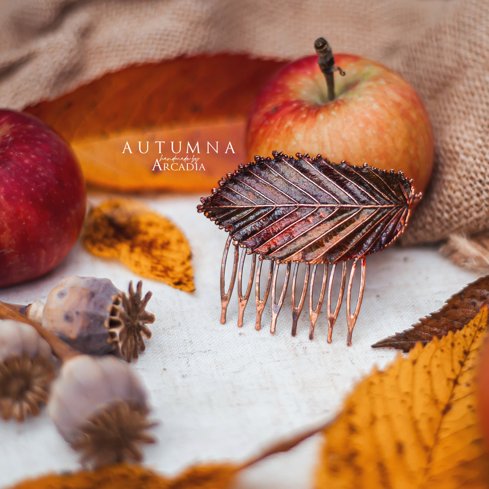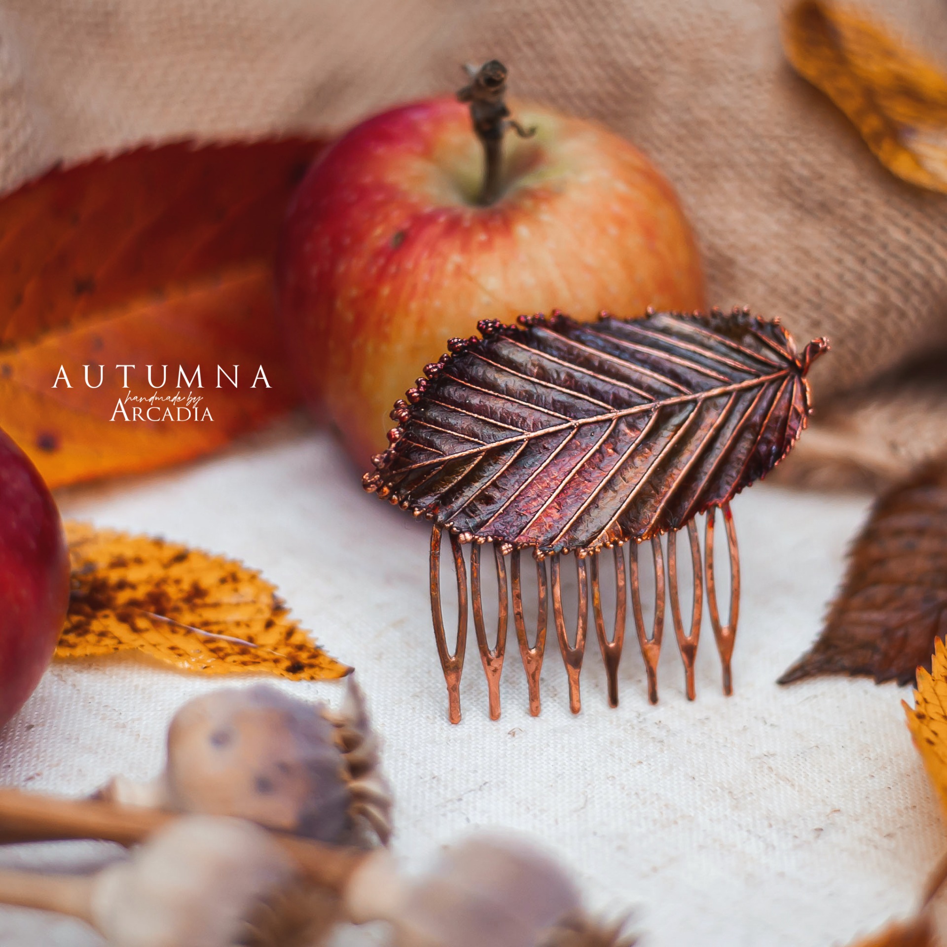 Hřebínek do vlasů ze skutečného pokoveného lístku habru v ohnivých podzimních odstínech. Vyrobeno rukama a srdcem v alchymistické dílně na severu Čech.