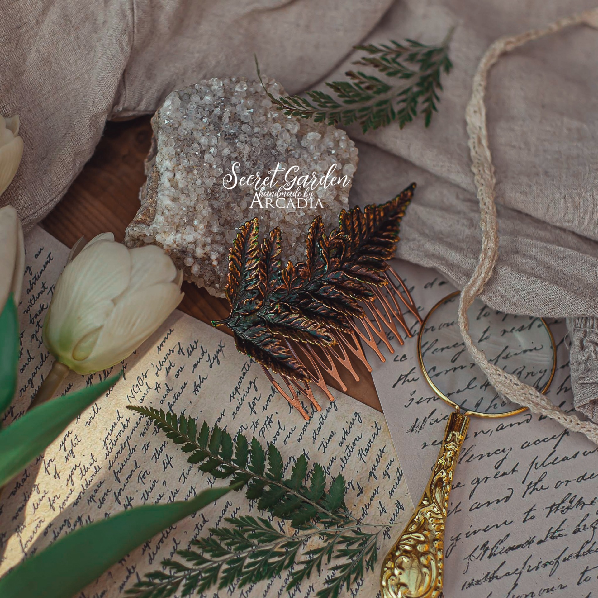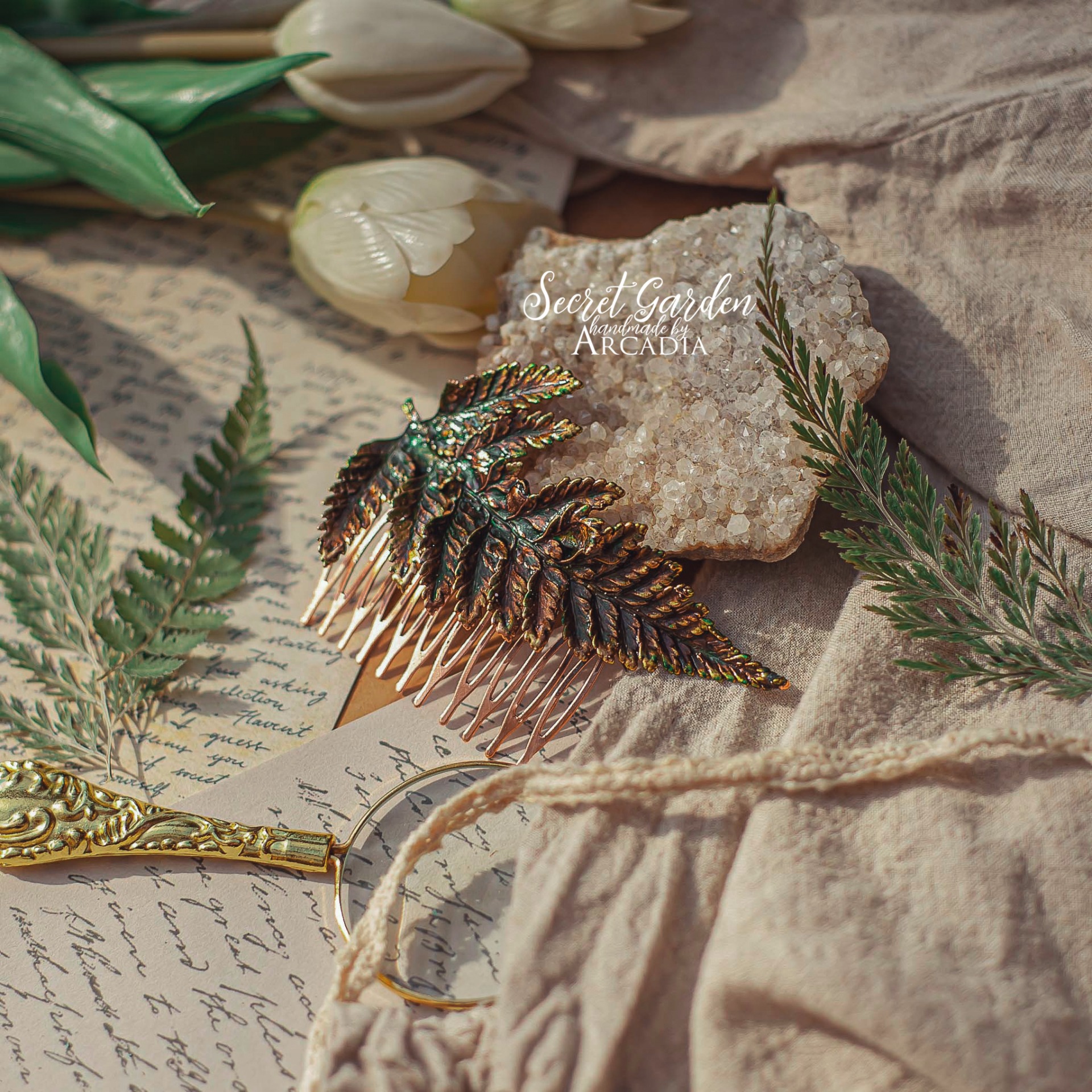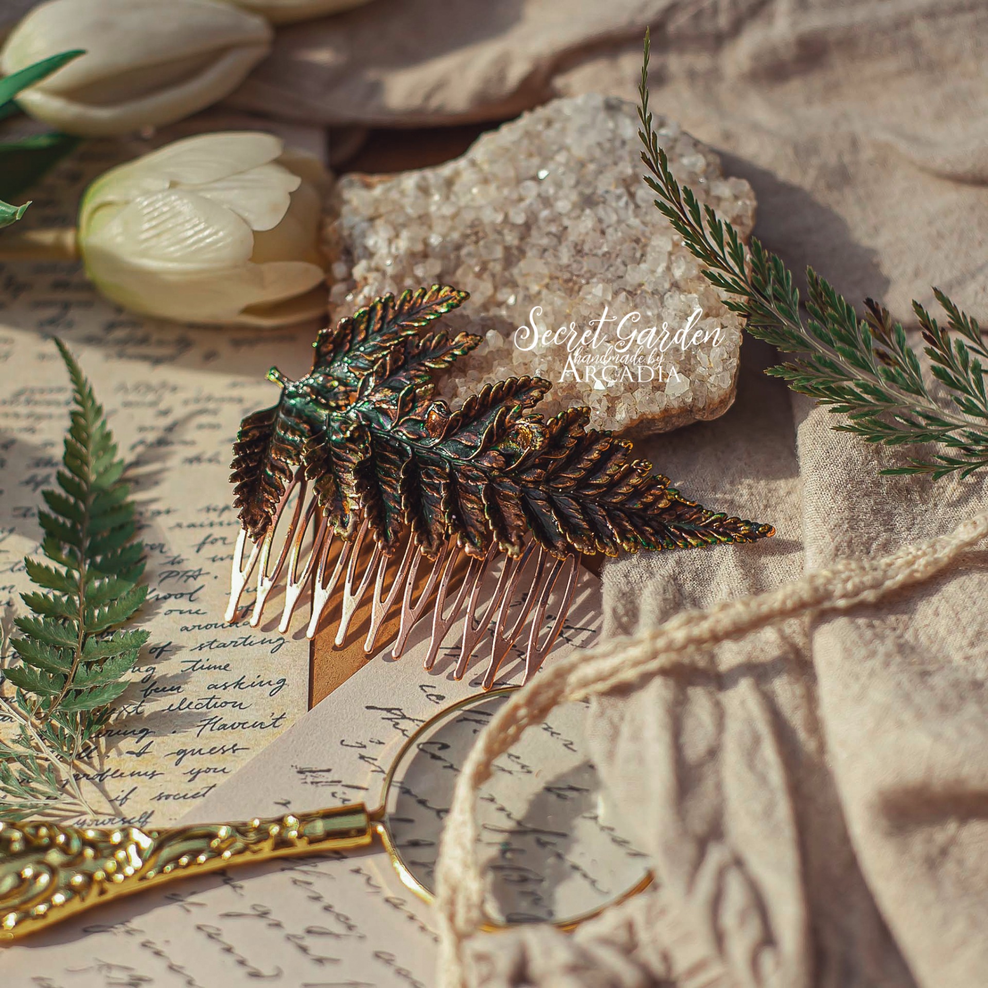 Měděný hřebínek do vlasů ze skutečné pokovené kapradiny v olejově zelených odstínech. Vyrobeno rukama a srdcem v alchymistické dílně na severu Čech.