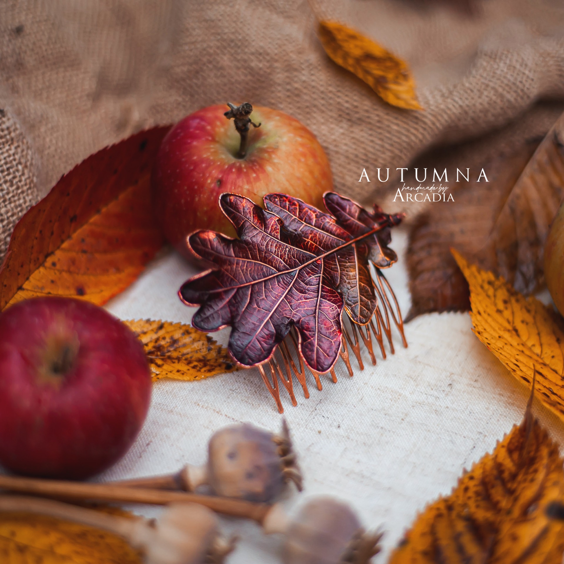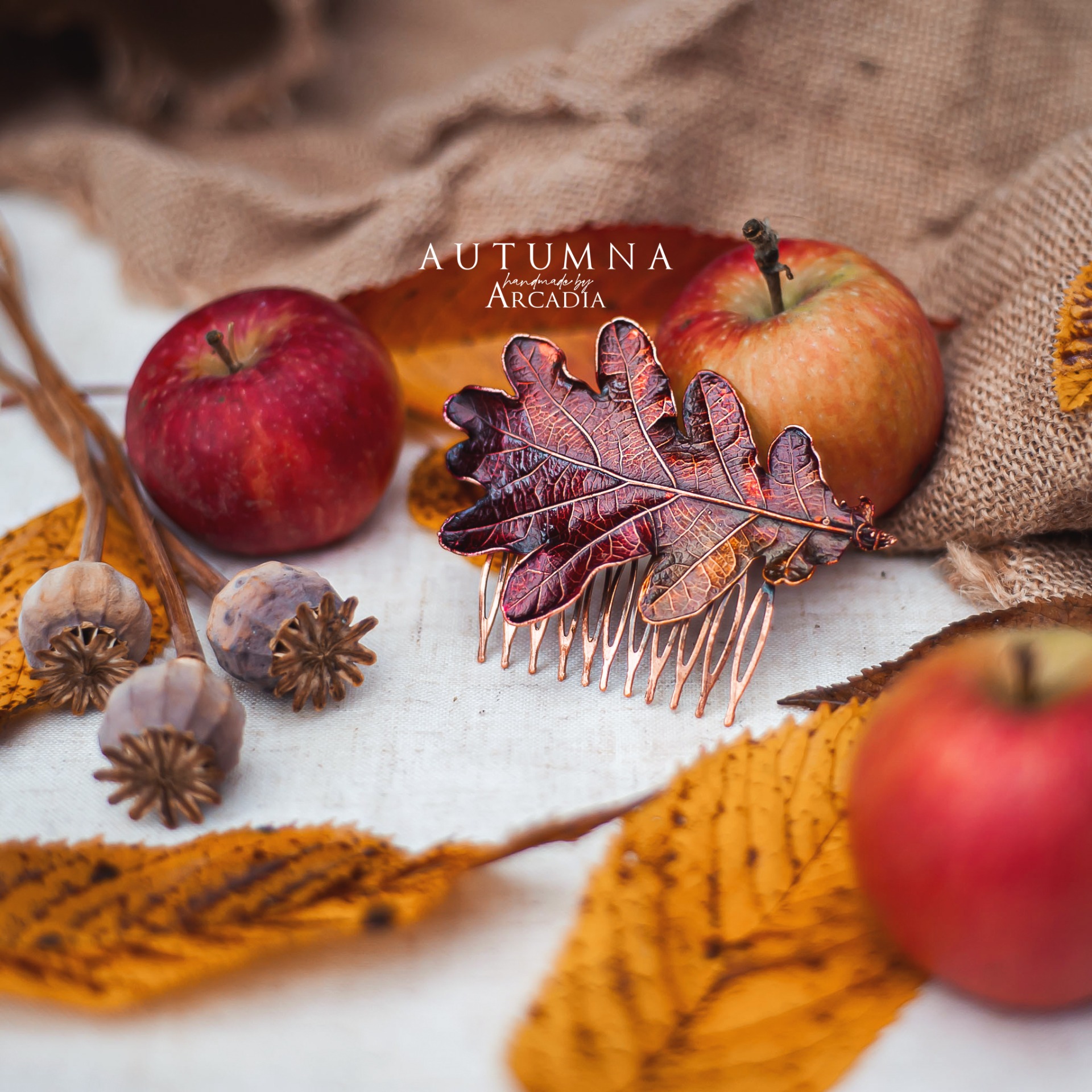 Hřebínek do vlasů ze skutečného pokoveného lístku dubu v odstínech rudé a zlatavé. Vyrobeno rukama a srdcem v alchymistické dílně na severu Čech.