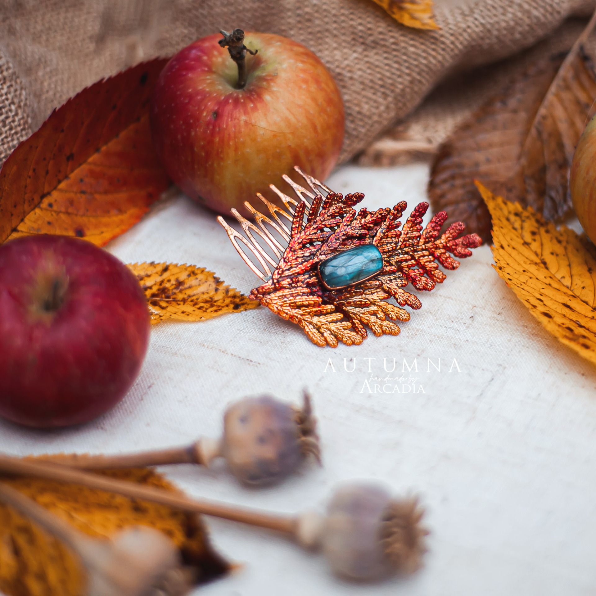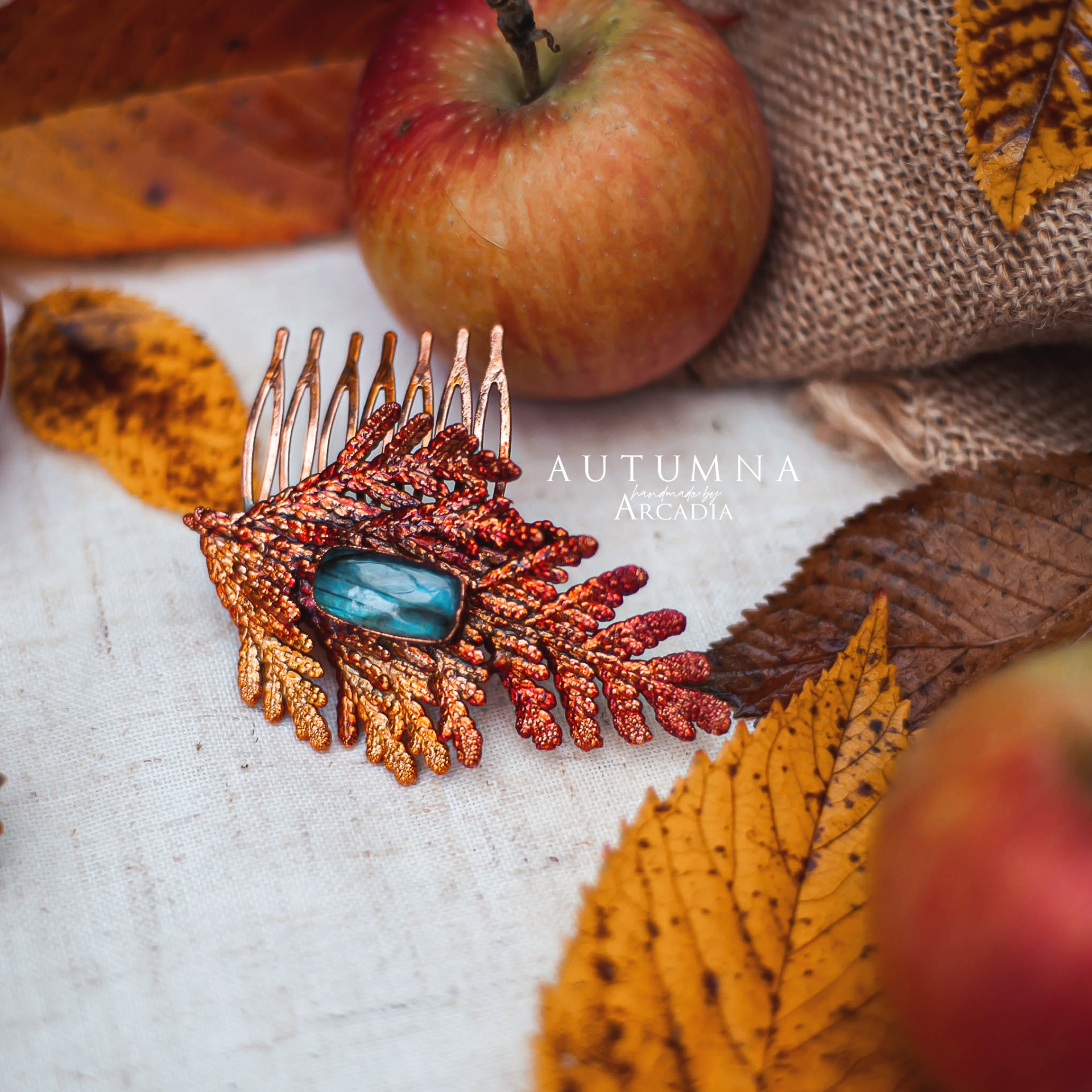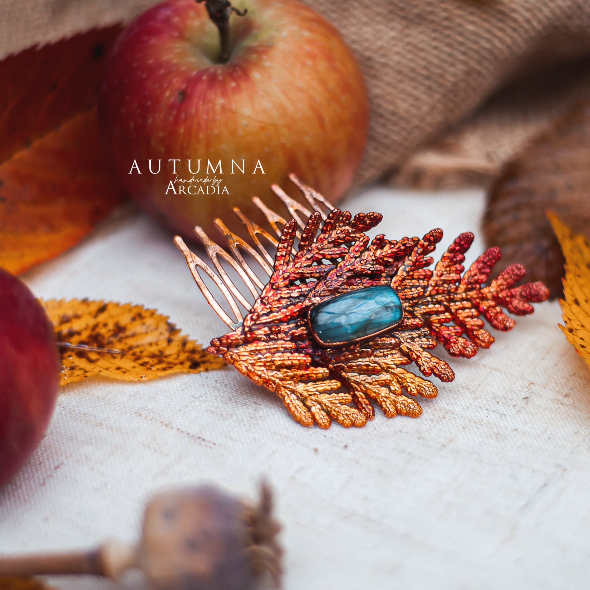 Hřebínek do vlasů ze skutečné pokovené větvičky túje v podzimních ohnivých tónech s kabošonem modrého labradoritu. Vyrobeno rukama a srdcem v alchymistické dílně na severu Čech.