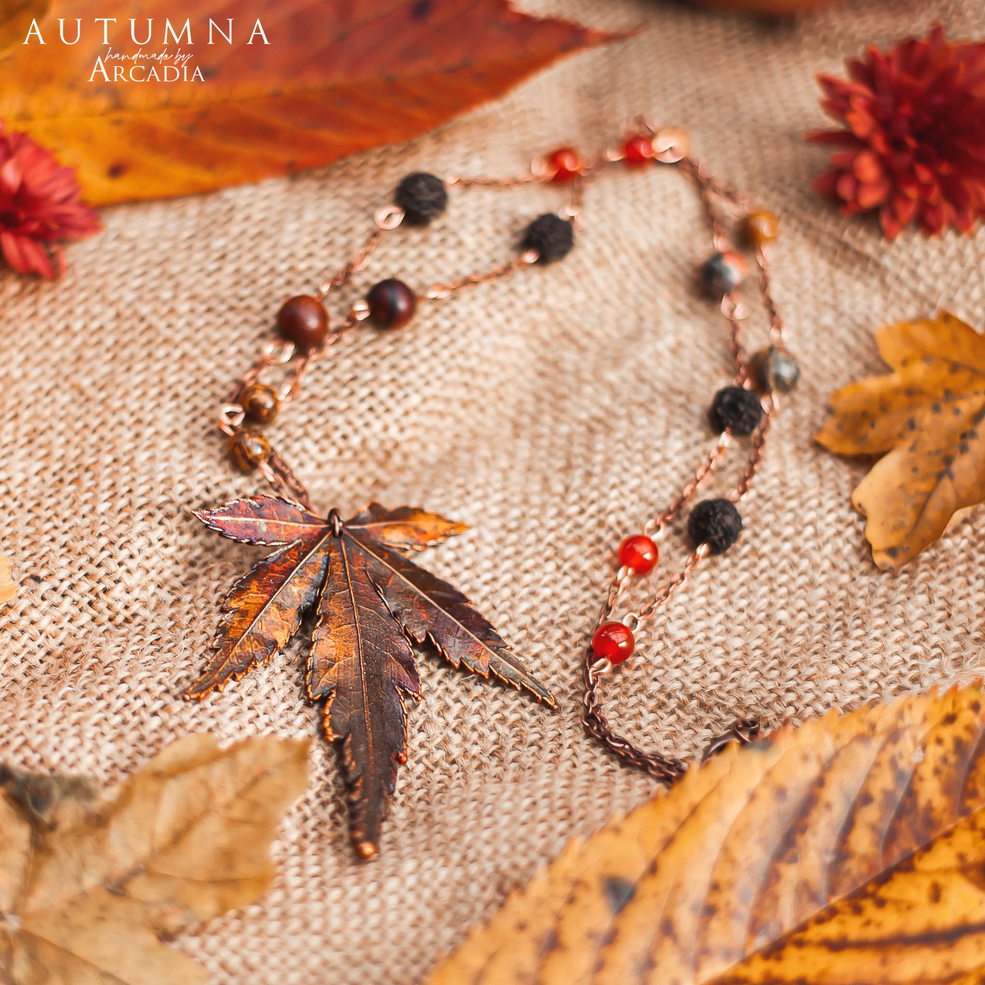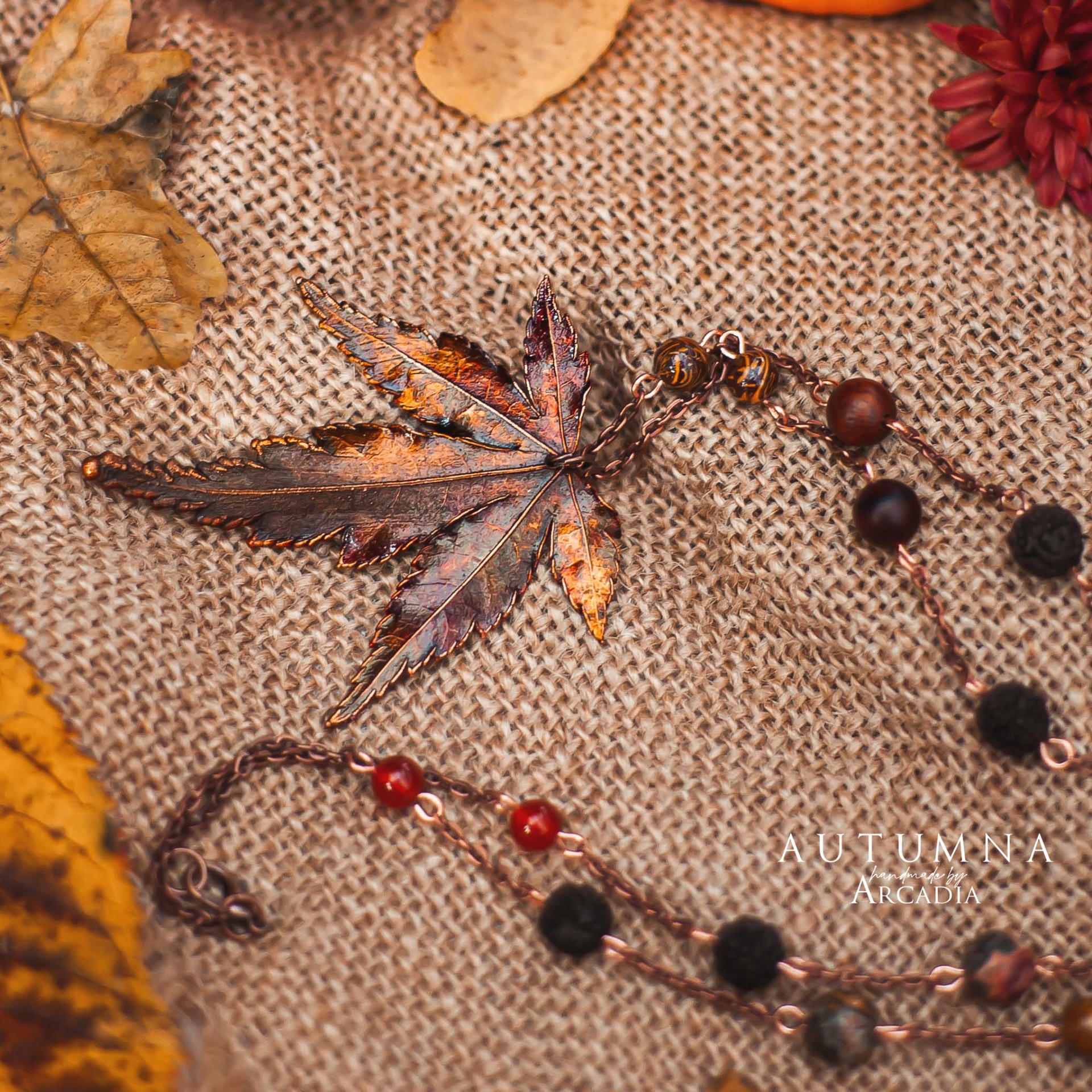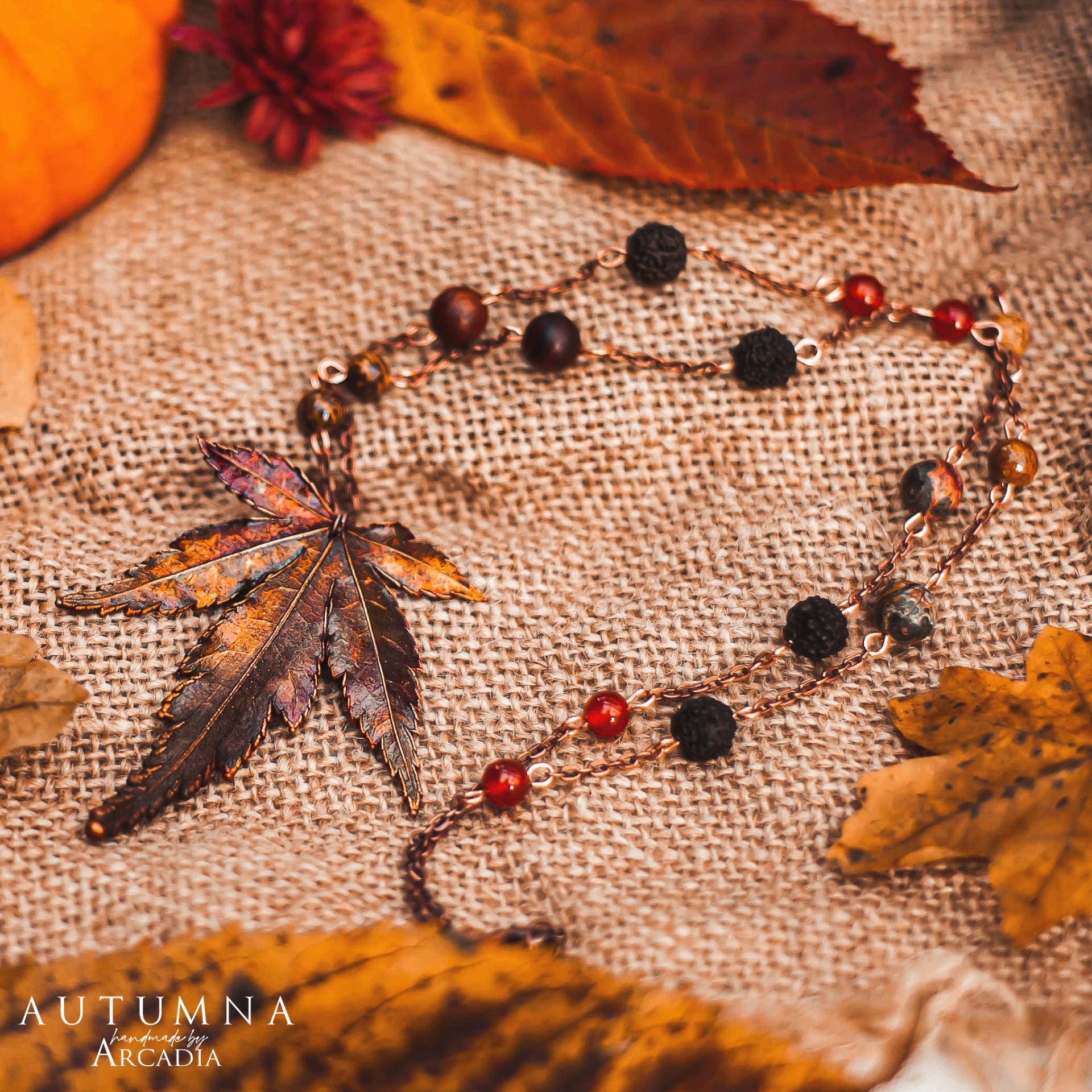 Korálkový náhrdelník s přívěskem ze skutečného pokoveného lístku japonského javoru. Vyrobeno rukama a srdcem v alchymistické dílně na severu Čech.