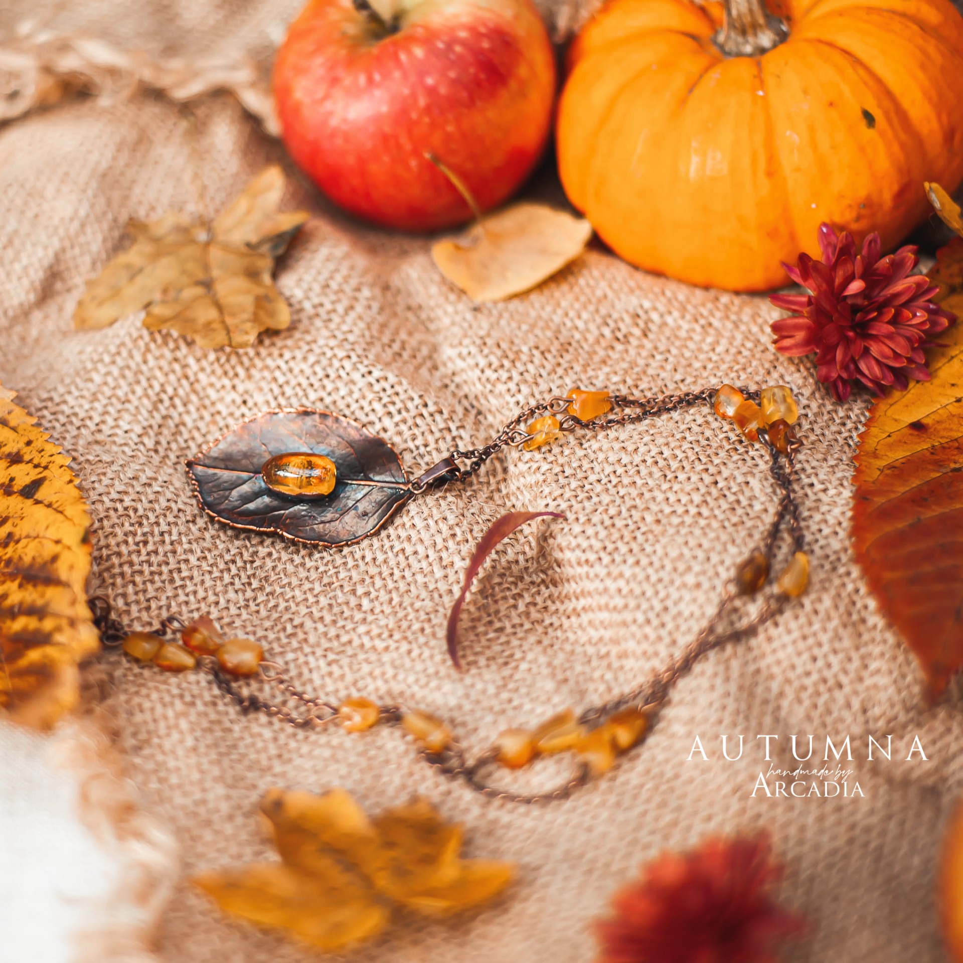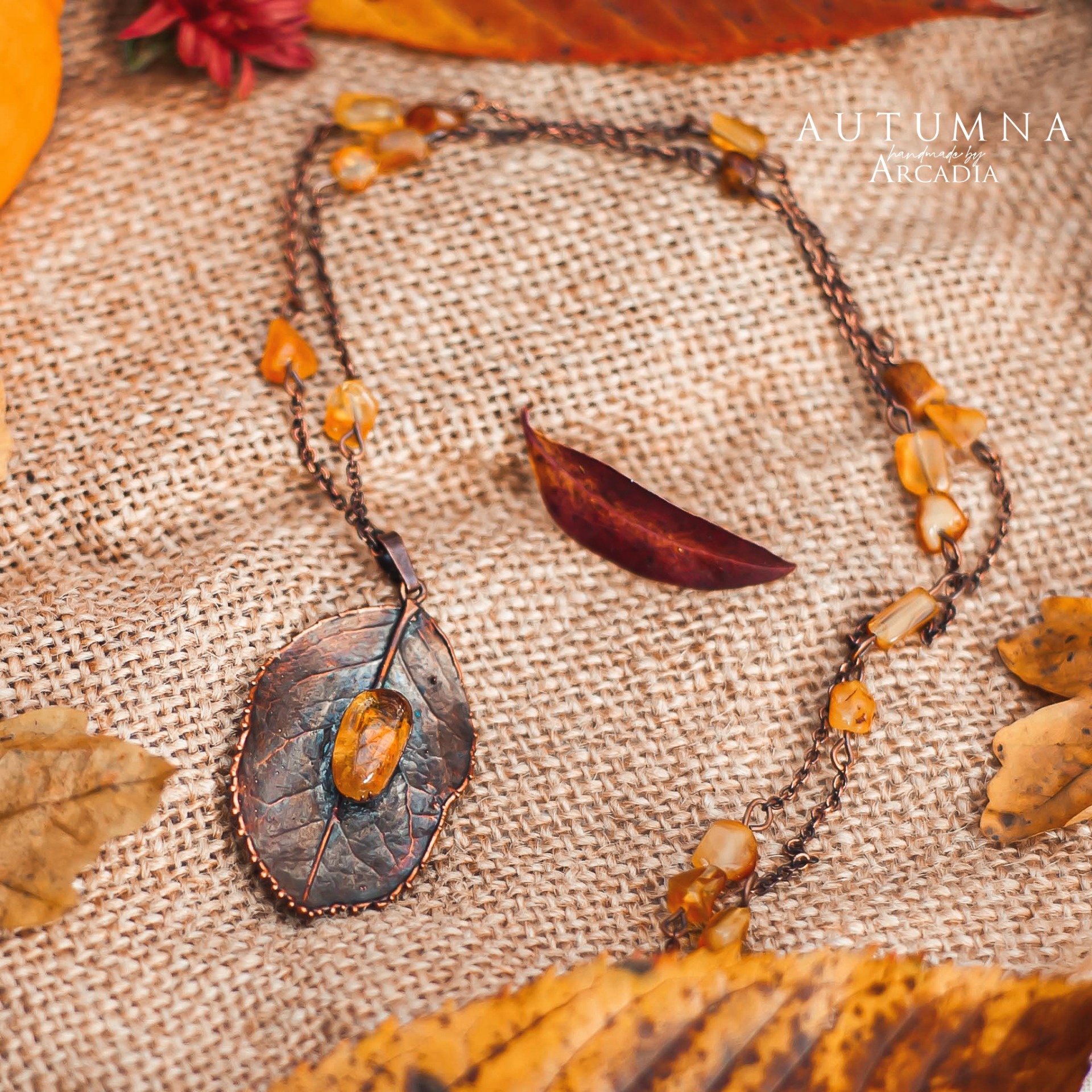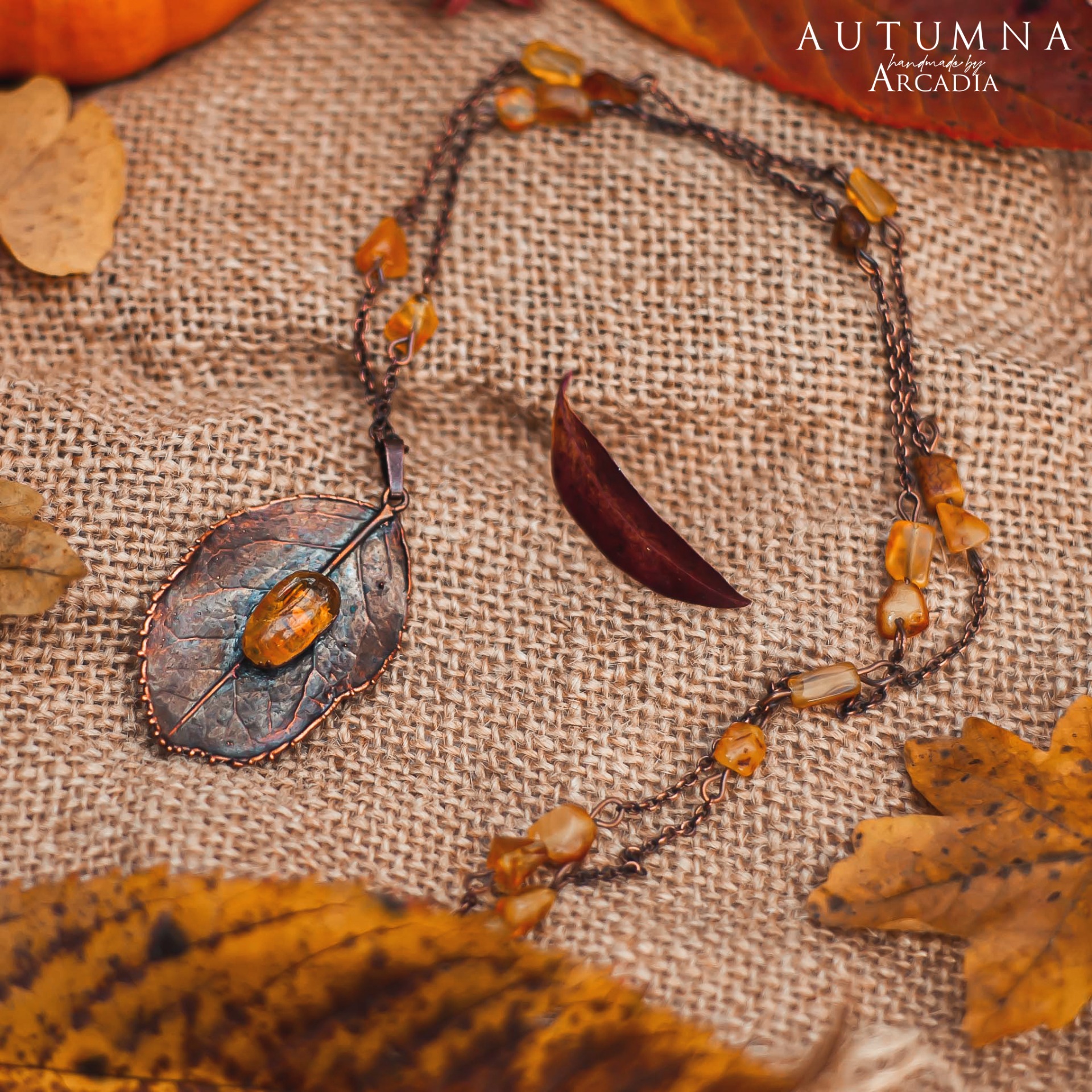 Korálkový náhrdelník s přívěskem ze skutečného pokoveného lístku růže s baltským jantarem. Vyrobeno rukama a srdcem v alchymistické dílně na severu Čech.