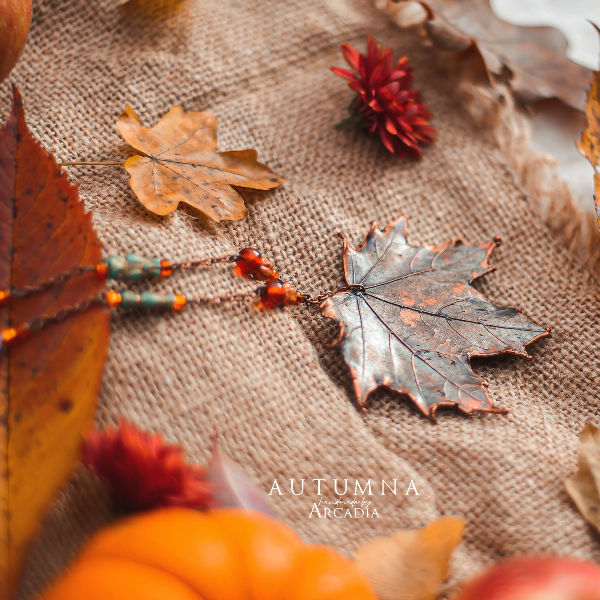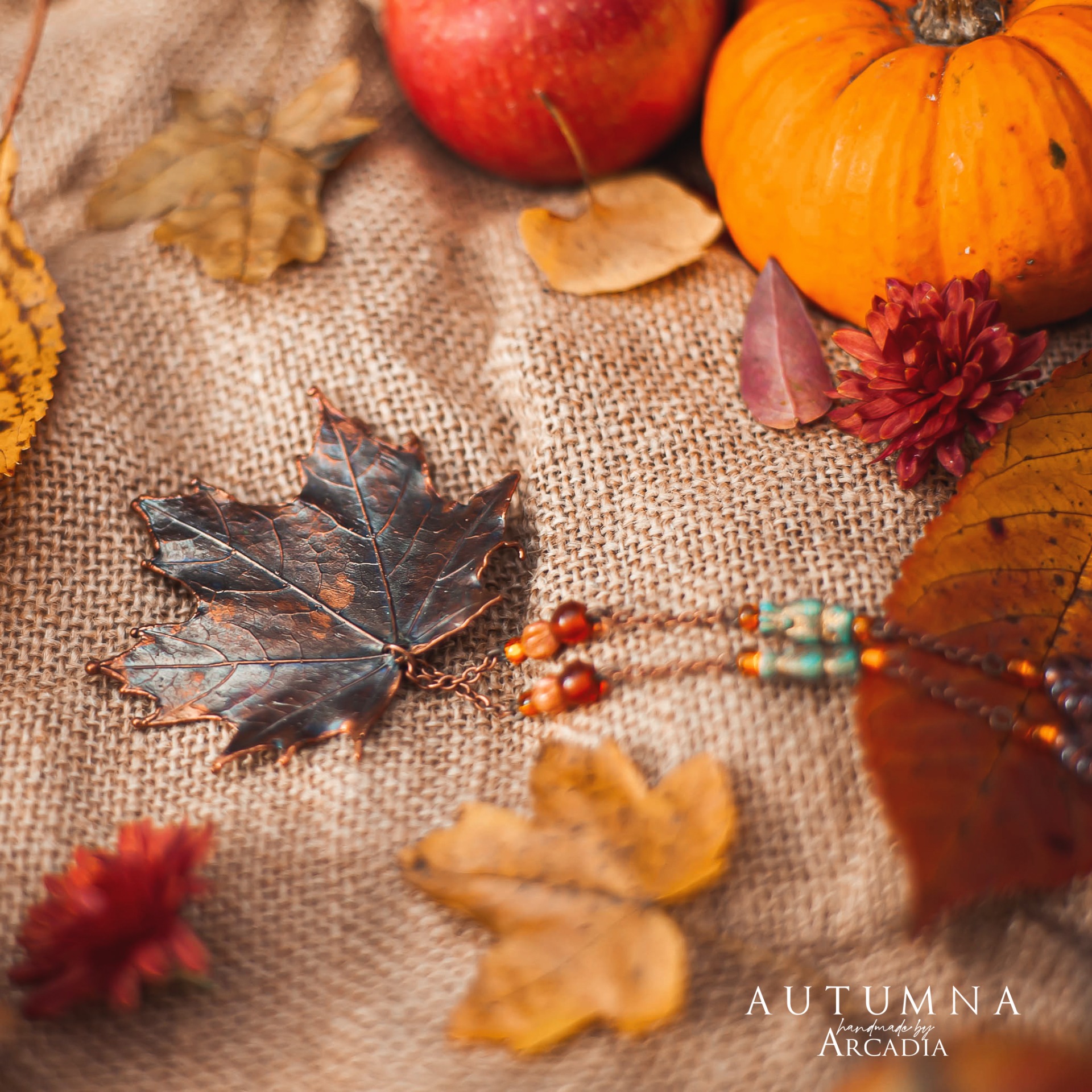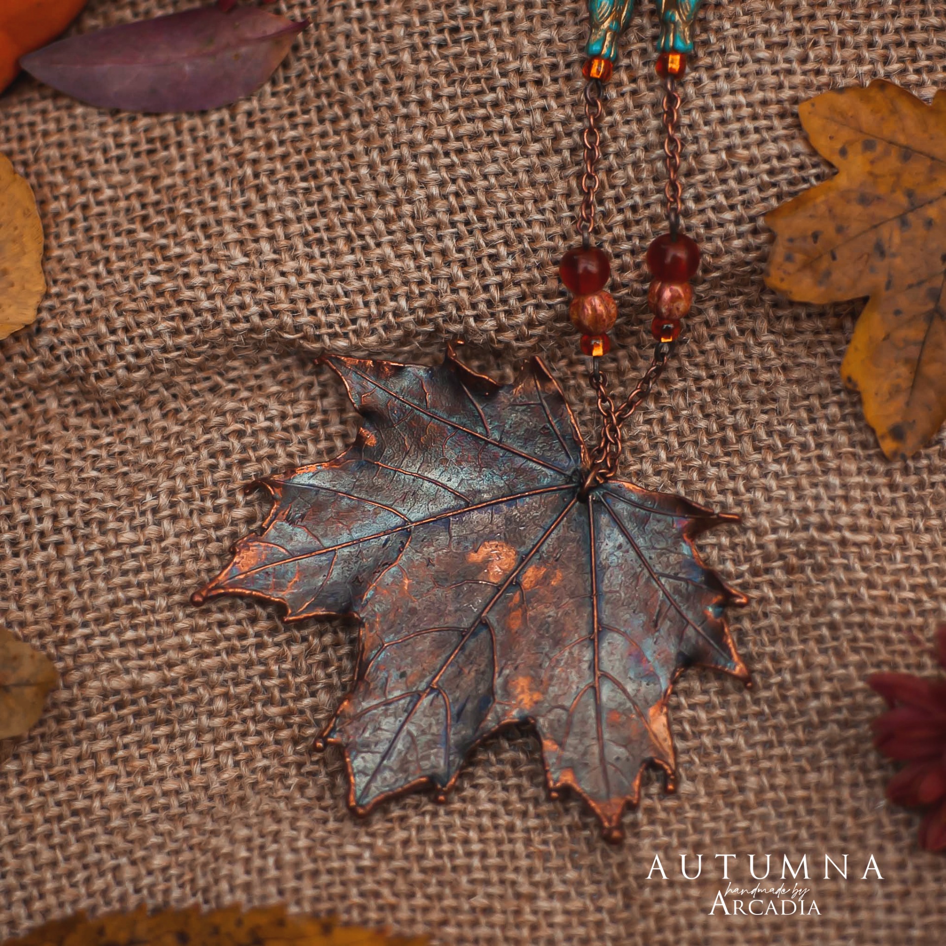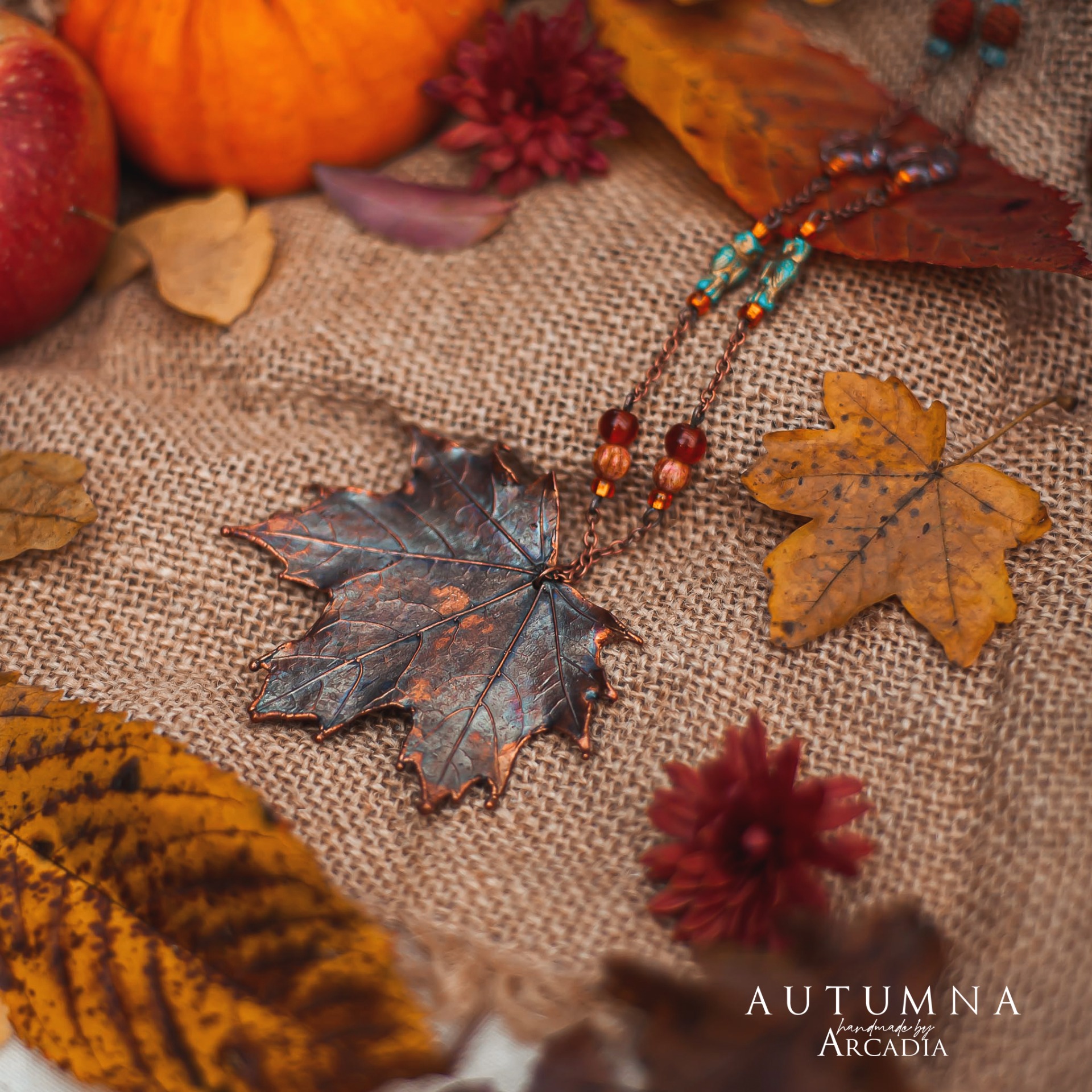 Korálkový náhrdelník s přívěskem ze skutečného pokoveného lístku javoru. Vyrobeno rukama a srdcem v alchymistické dílně na severu Čech.