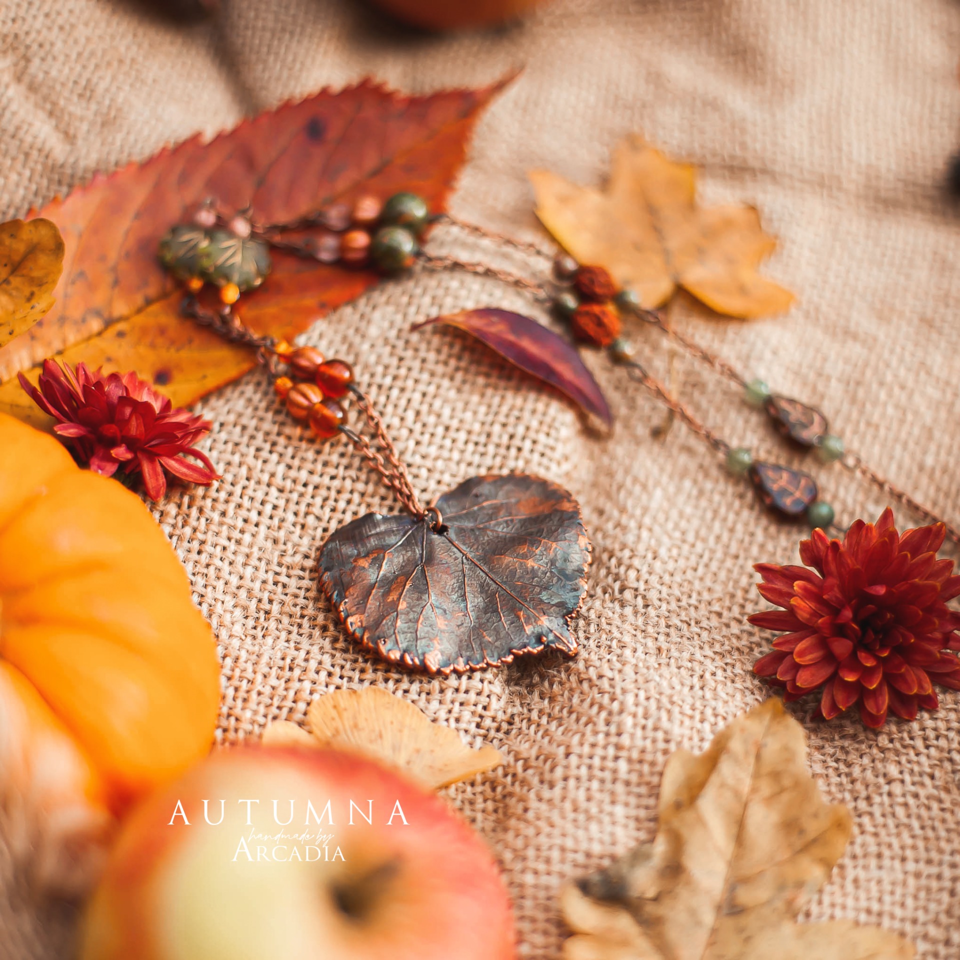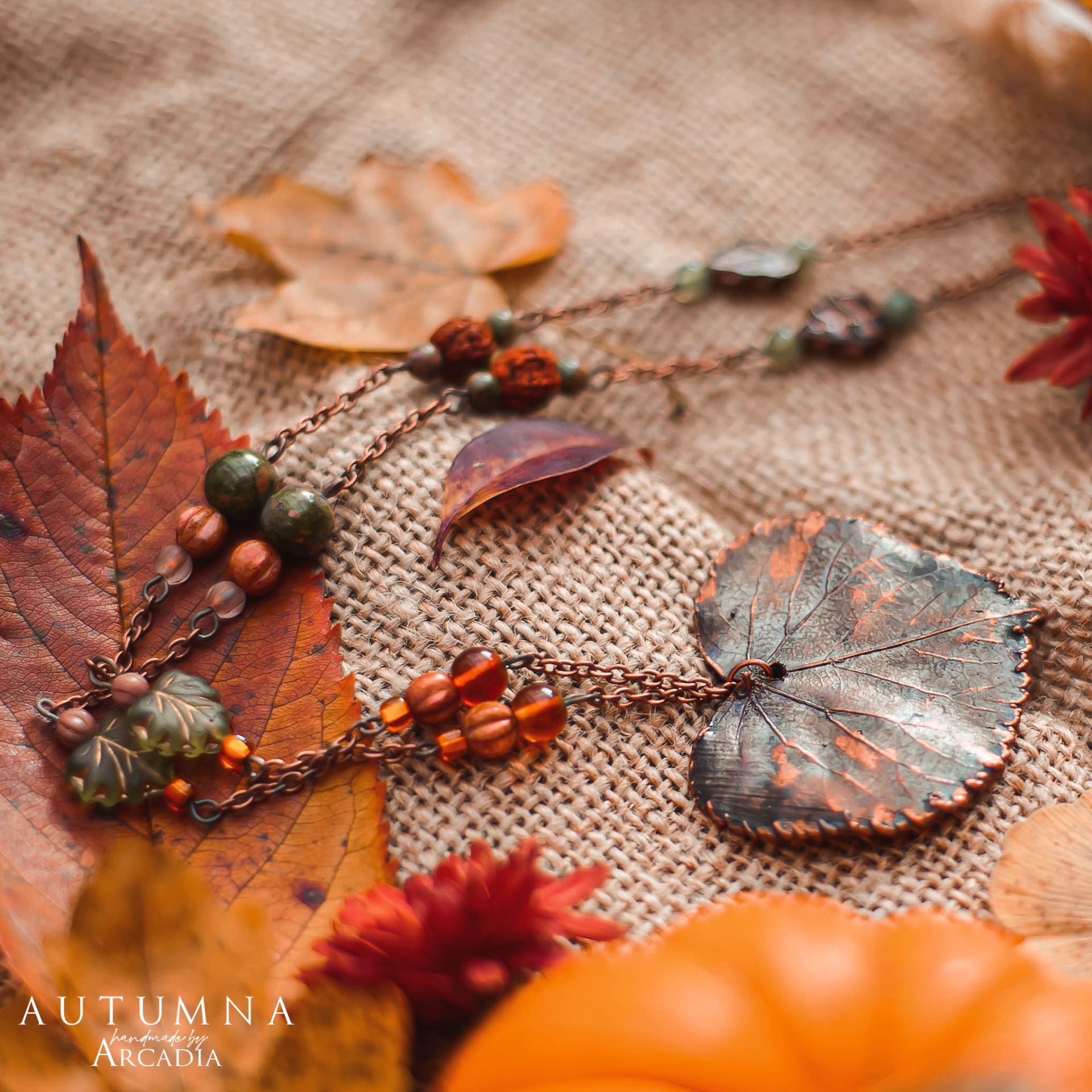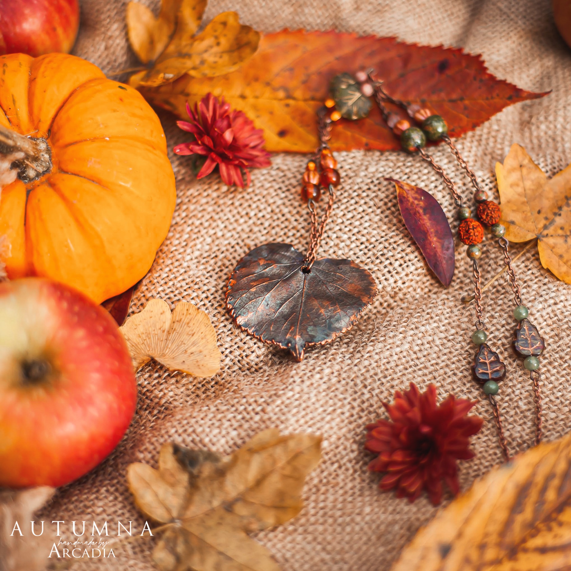 Korálkový náhrdelník s přívěskem ze skutečného pokoveného lístku lípy. Jemný řetízekv barvě růžového zlata. Vyrobeno rukama a srdcem v alchymistické dílně na severu Čech.