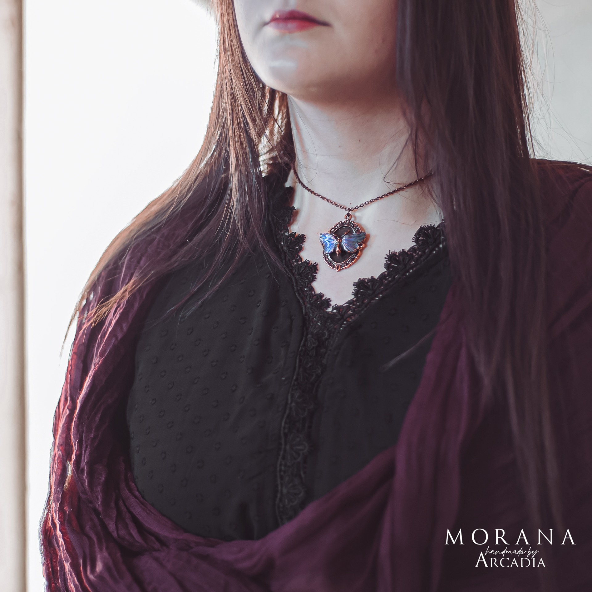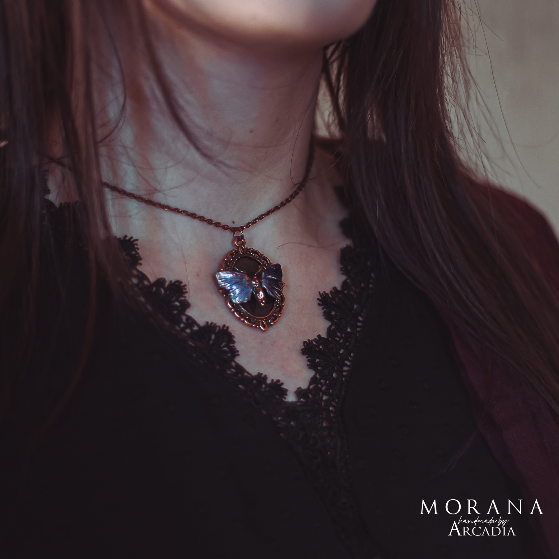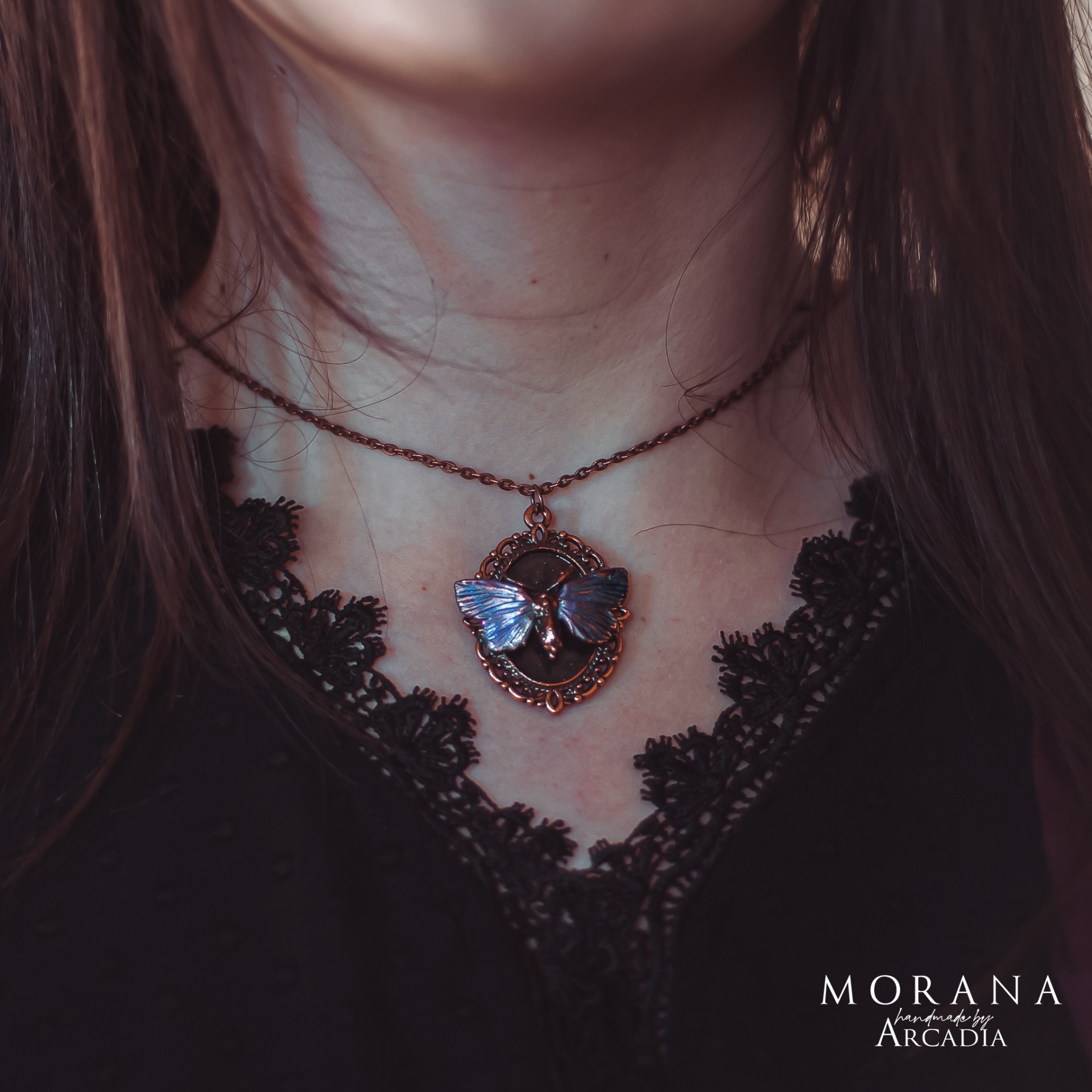 Zdobný medailonek se skutečnou pokovenou můrkou s třpytivými modrými křidélky. Jemný bižuterní řetízek. Vyrobeno rukama a srdcem v alchymistické dílně na severu Čech.