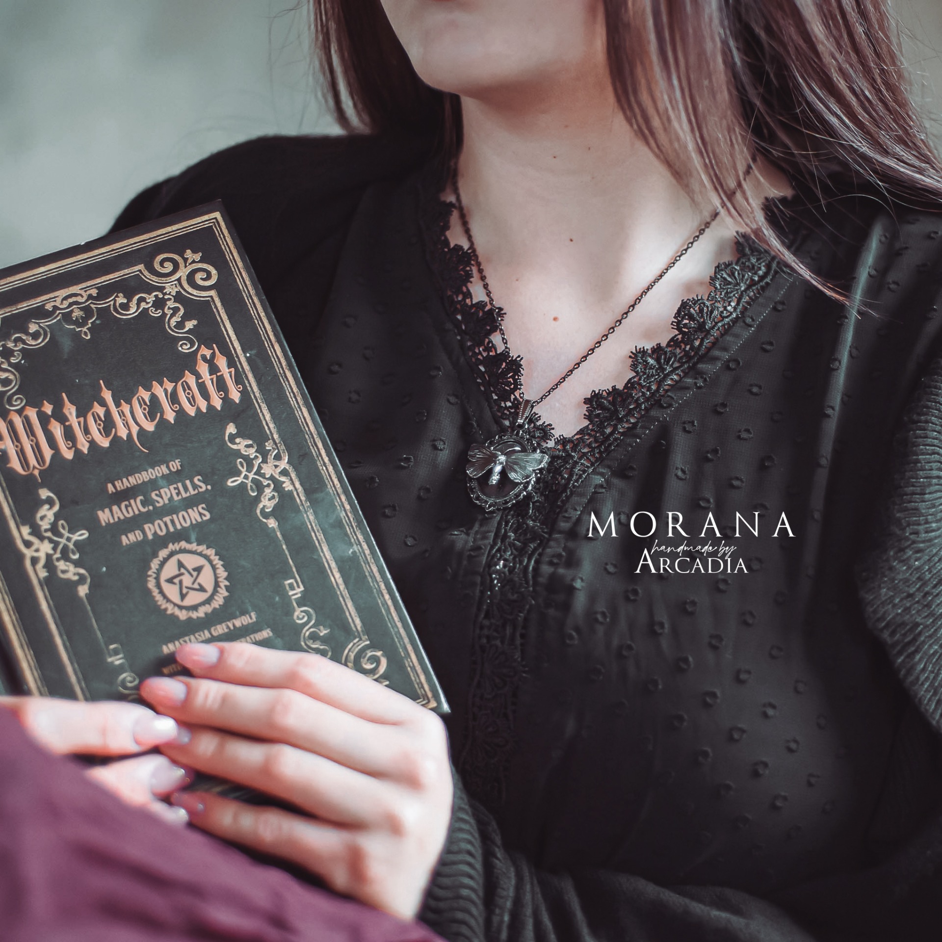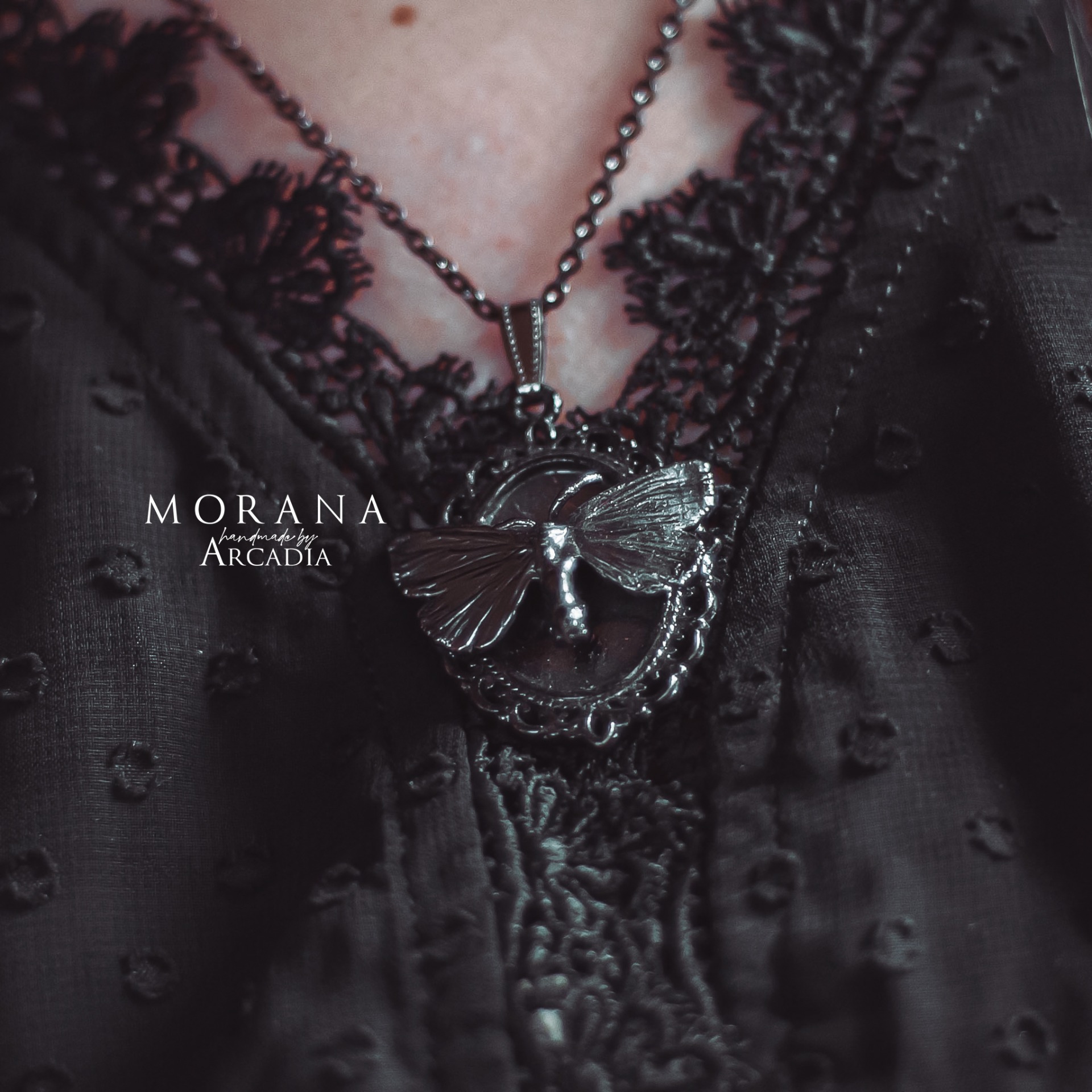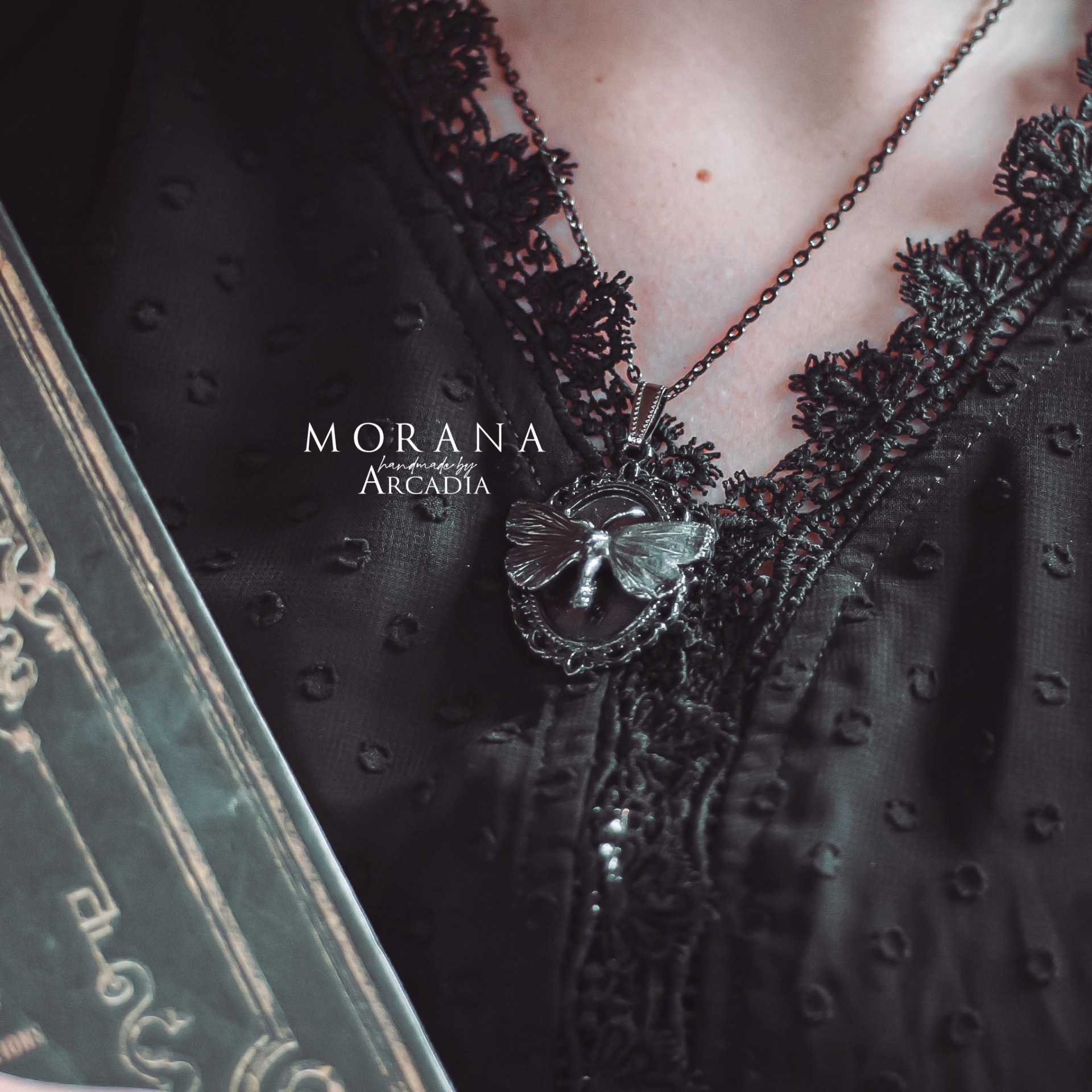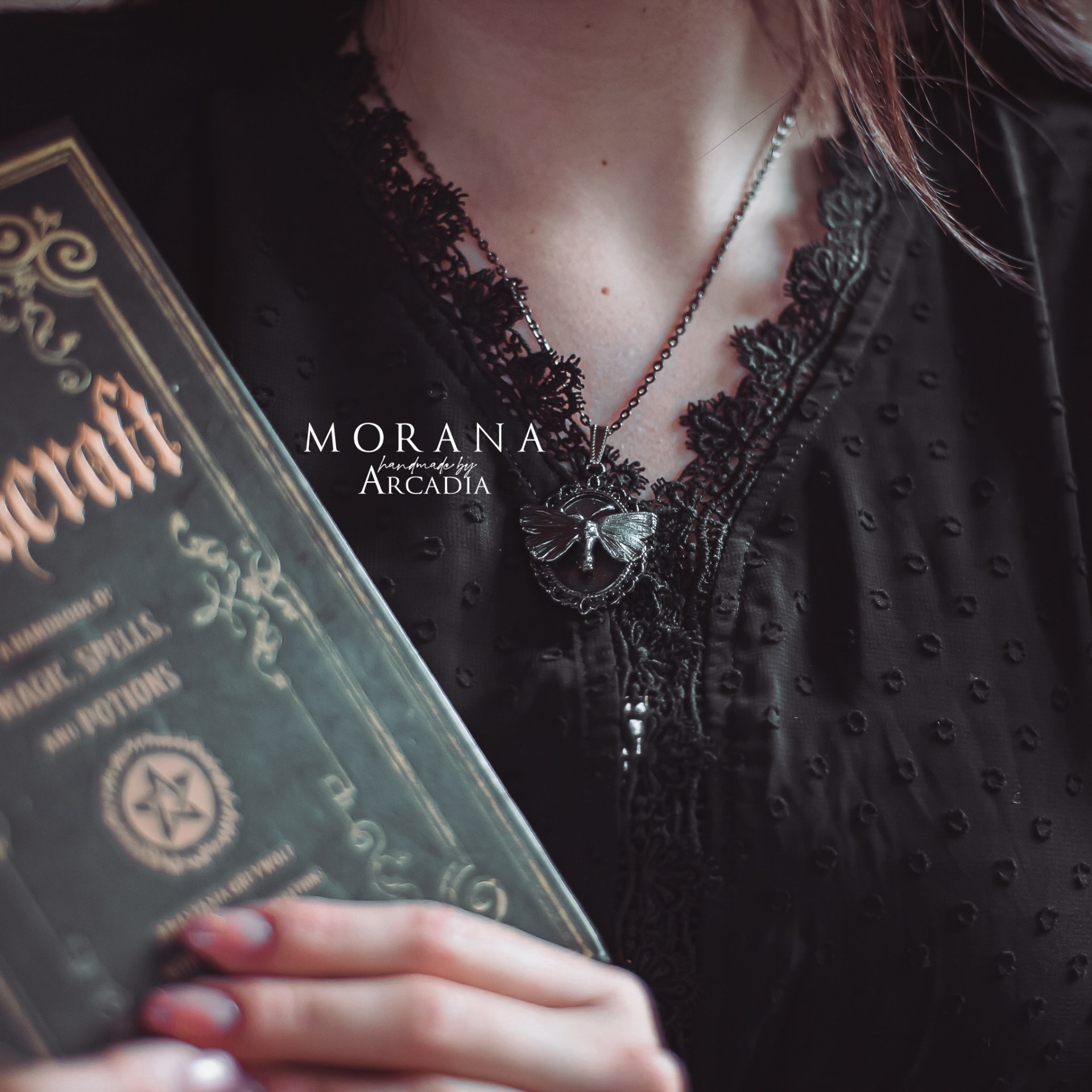 Zdobný medailonek se skutečnou pokovenou můrkou v temné gunmetal patině. Jemný bižuterní řetízek. Vyrobeno rukama a srdcem v alchymistické dílně na severu Čech.