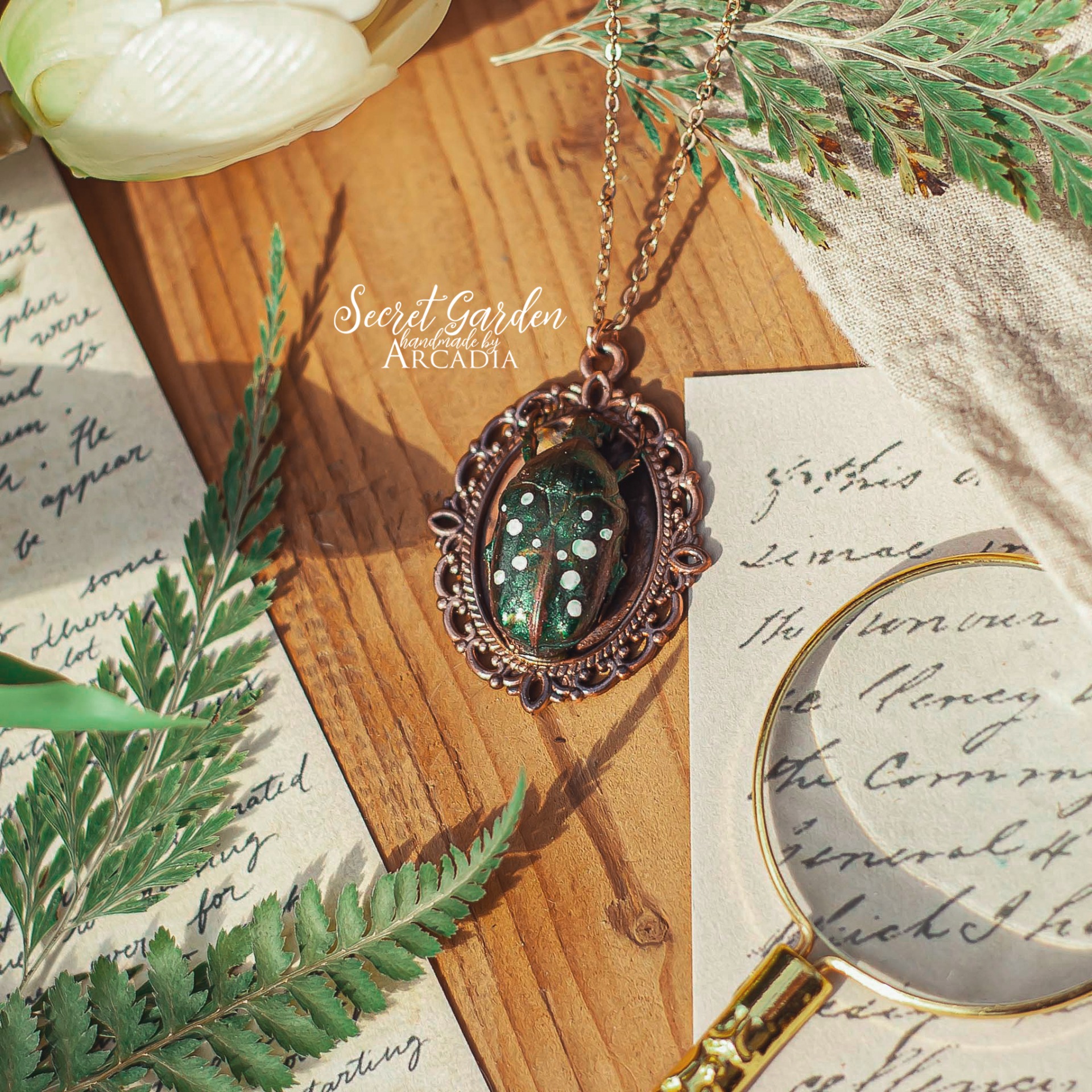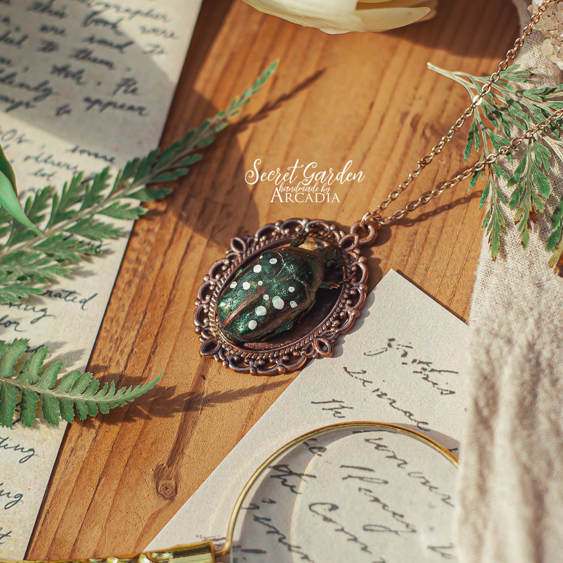 Náhrdelník s přívěskem ze skutečného pokoveného afrického zlatohlávka vyvedeného v realistických kovově leklých barvách, usazeného ve zdobném vintage lůžku. Jemný rosegold řetízek z nerezové oceli. Vyrobeno rukama a srdcem v alchymistické dílně na severu Čech.