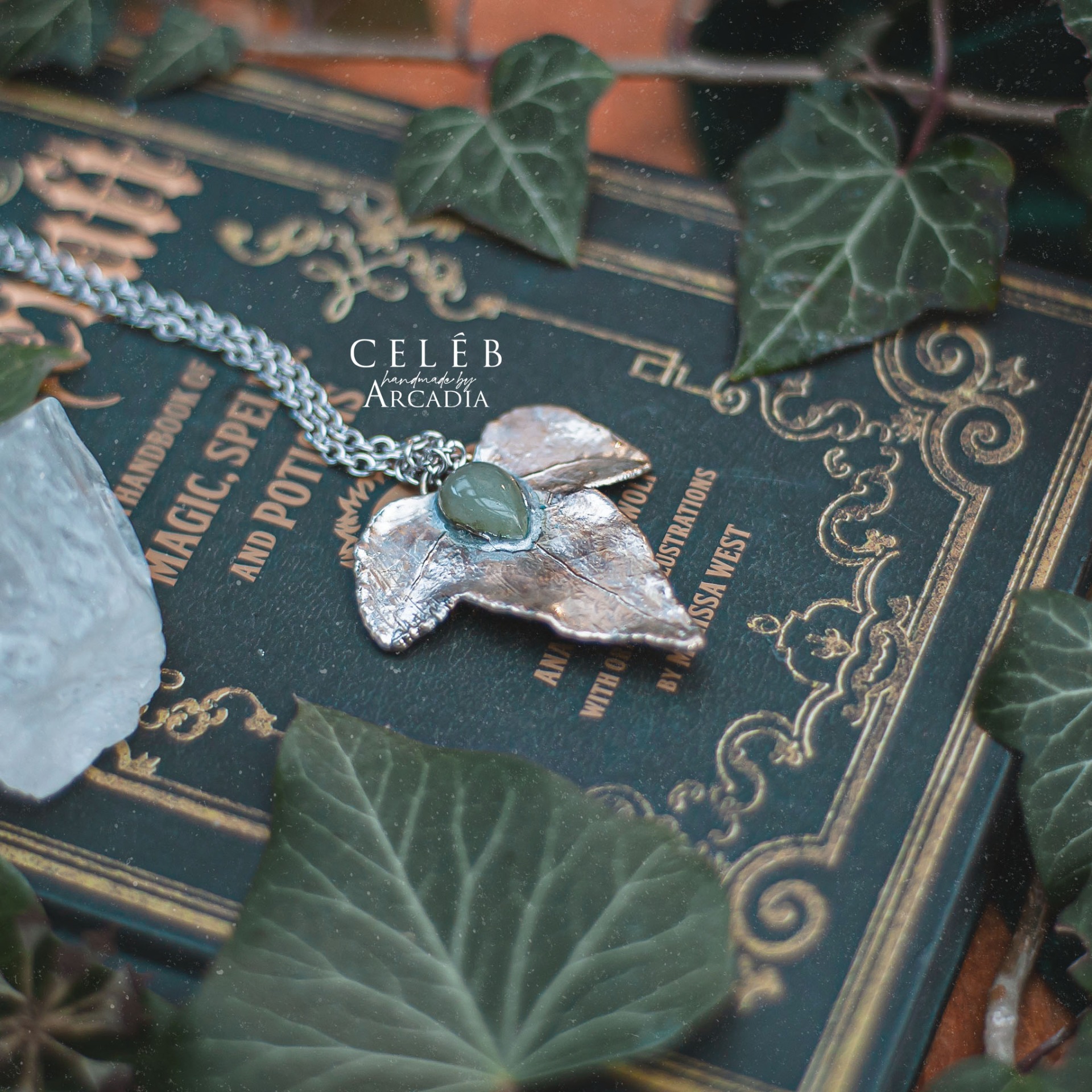 Náhrdelník se skutečným pokoveným lístkem břečťanu s kabošonem zeleného jadeitu. Řetízek z nerezové oceli. Vyrobeno rukama a srdcem v alchymistické dílně na severu Čech.