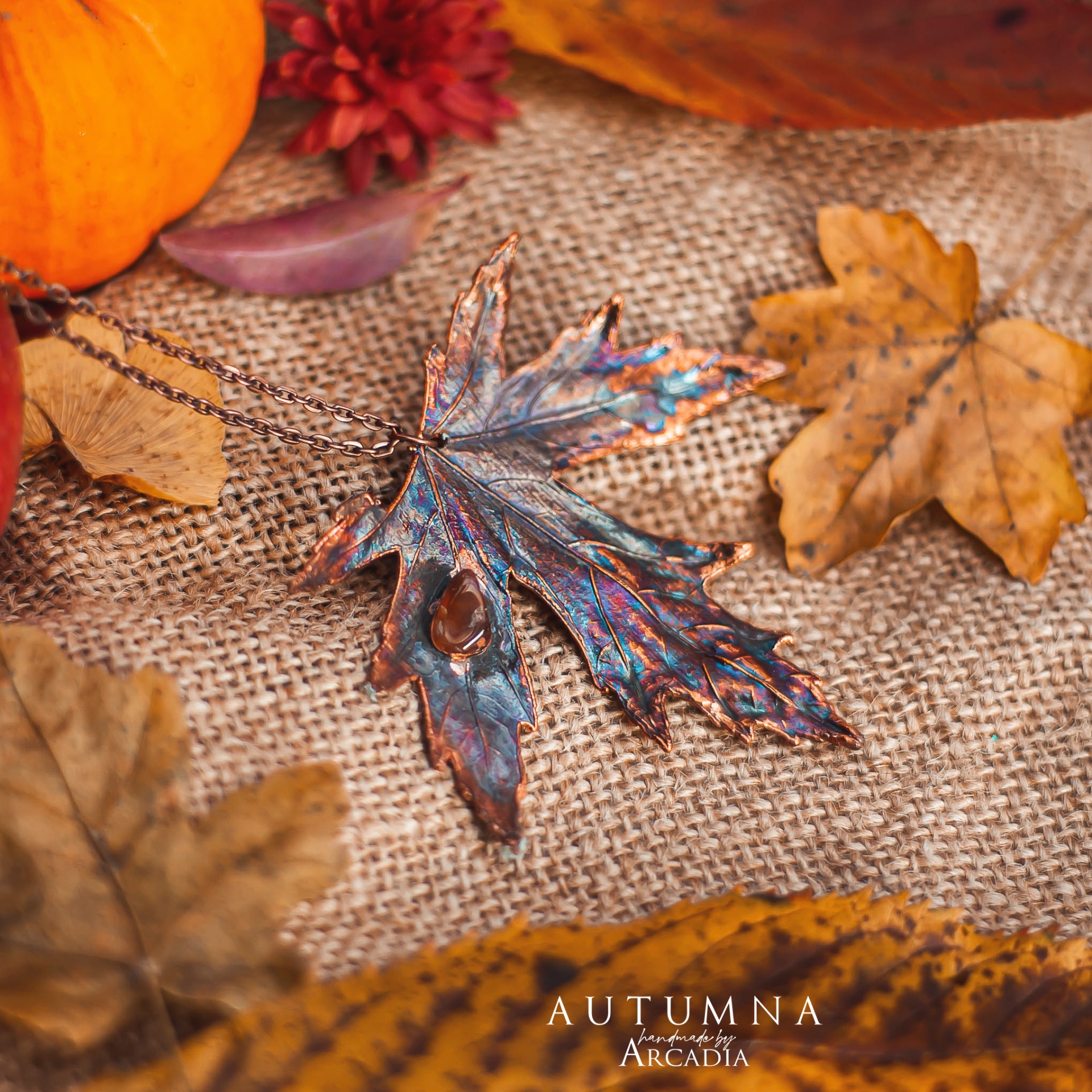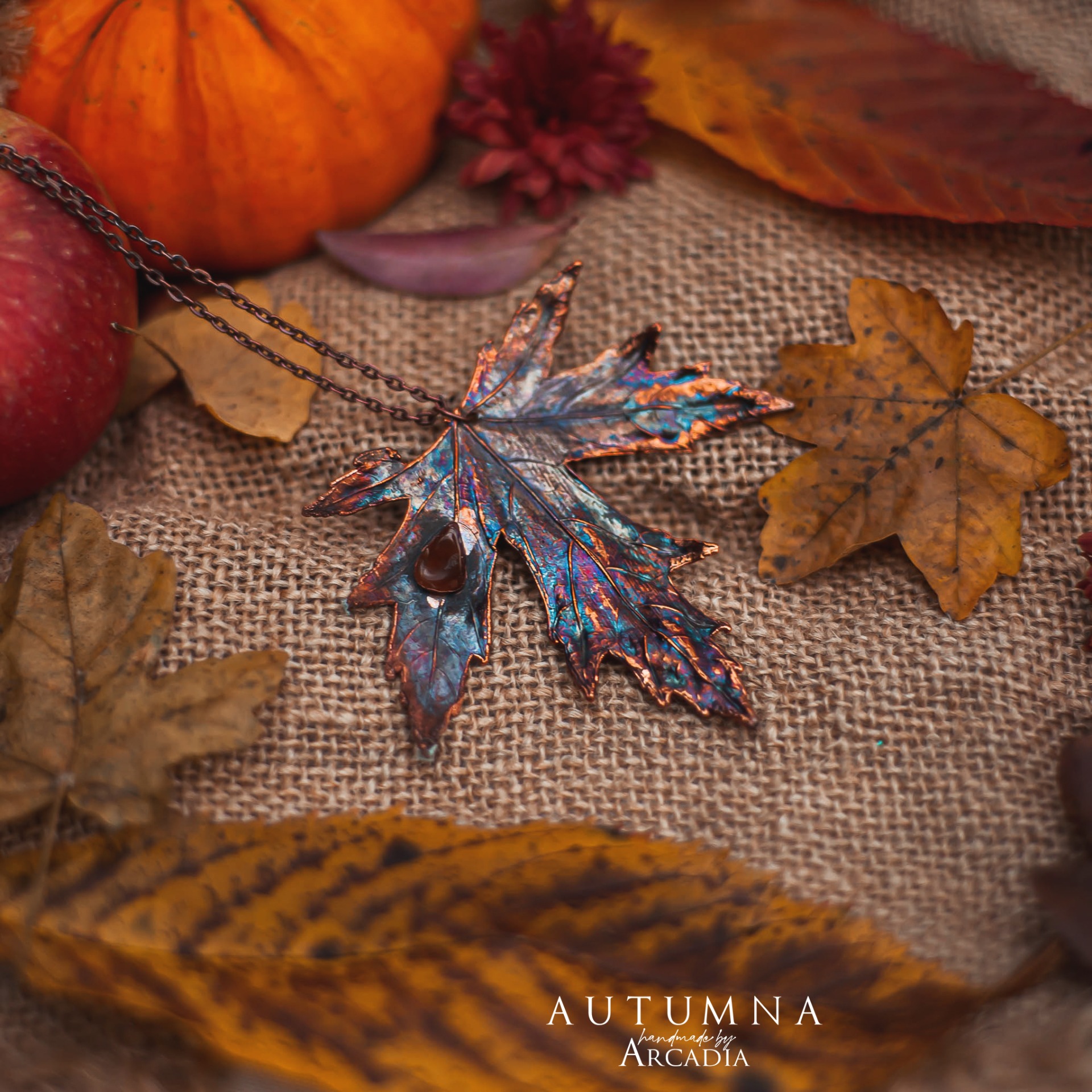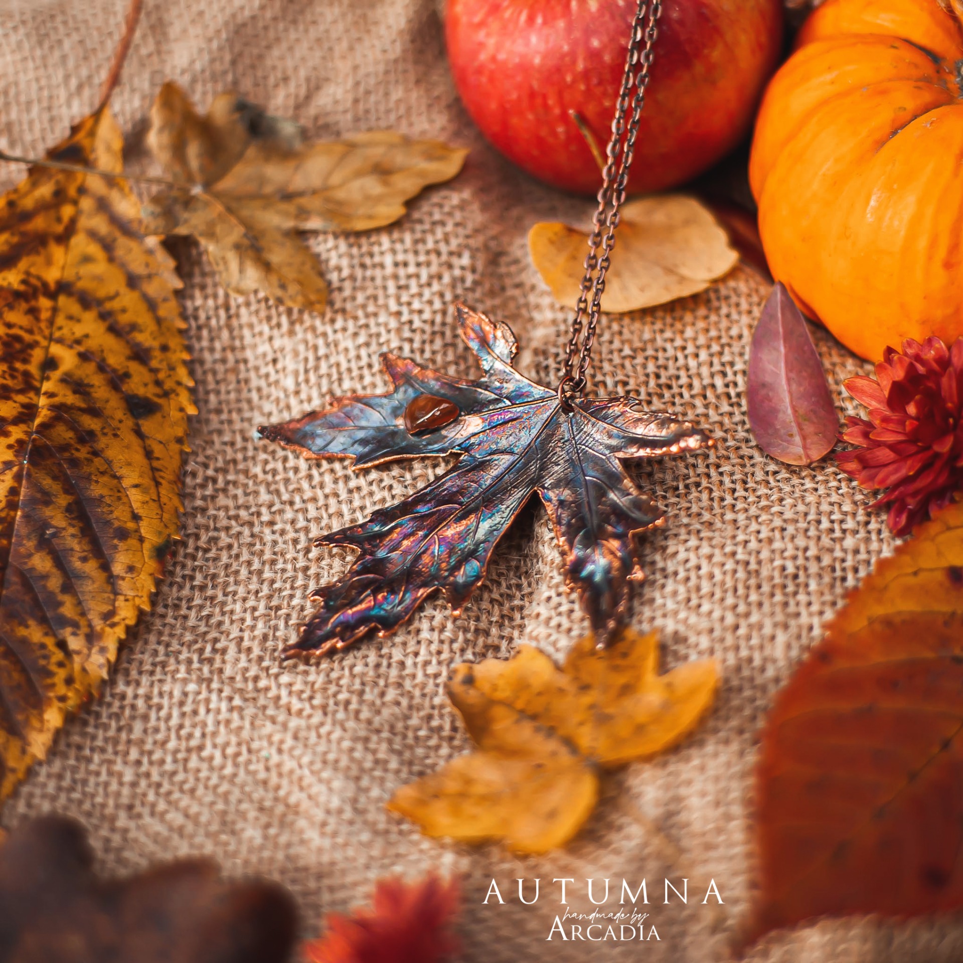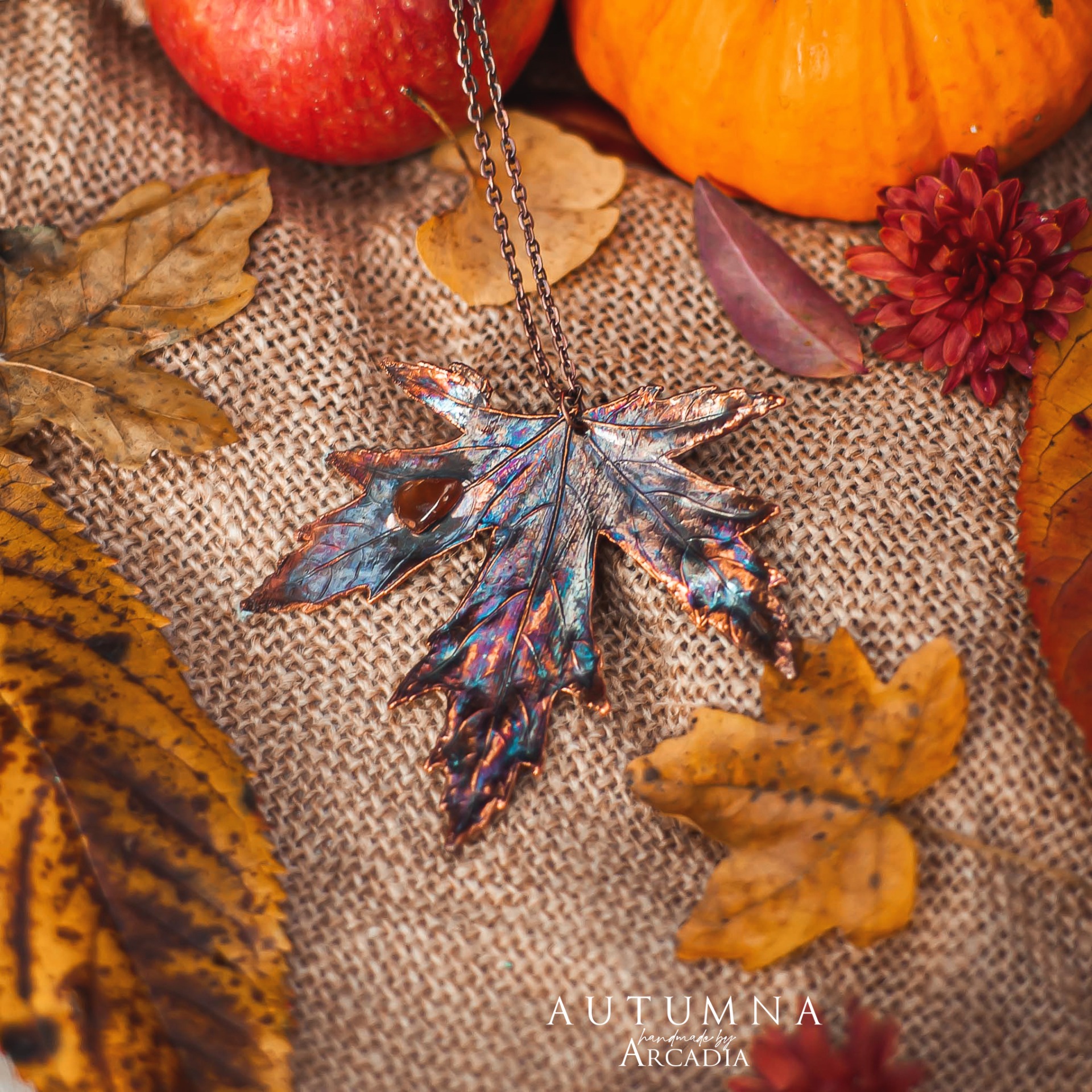 Náhrdelník s přívěskem ze skutečného pokoveného lístku cukrového javoru v olejově duhové patině s baltským jantarem. Jemný staroměděný řetízek. Vyrobeno rukama a srdcem v alchymistické dílně na severu Čech.