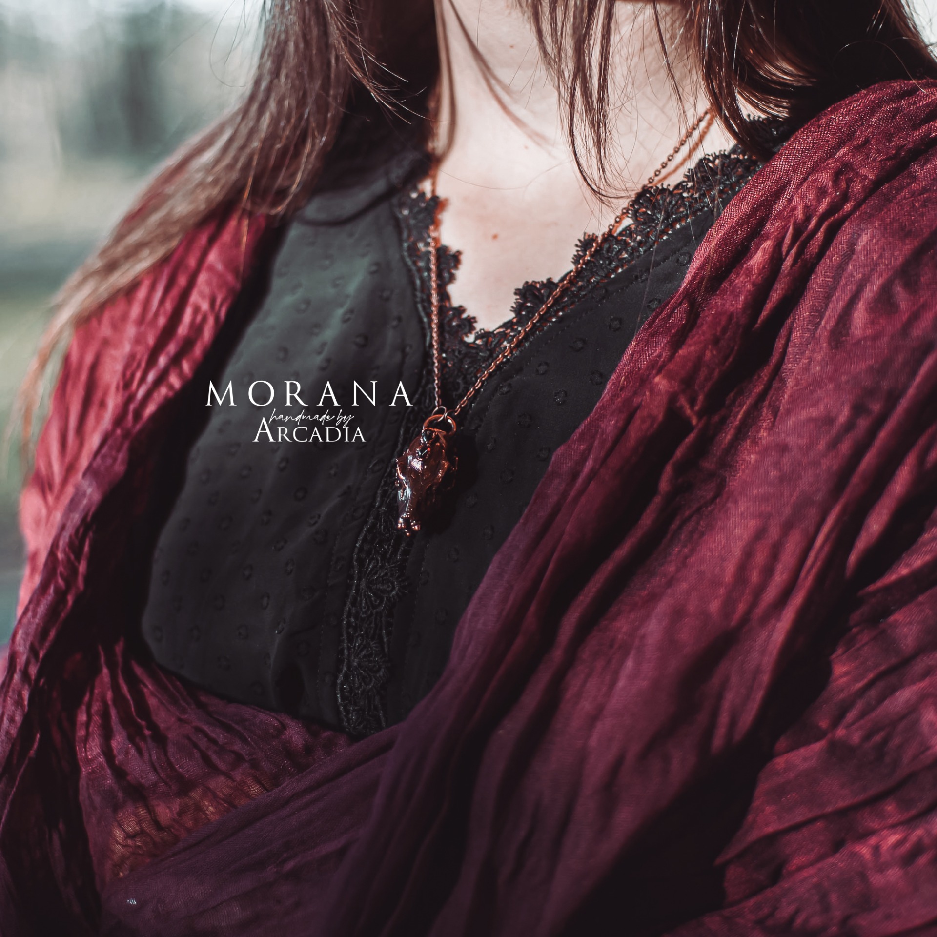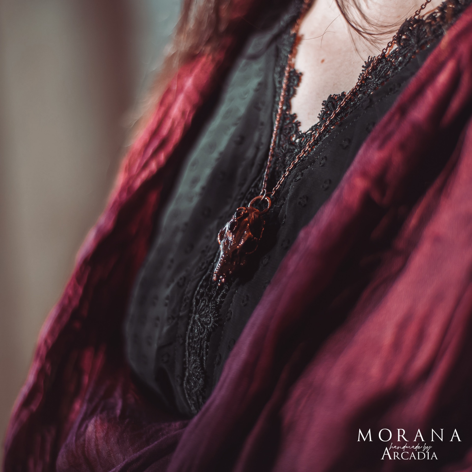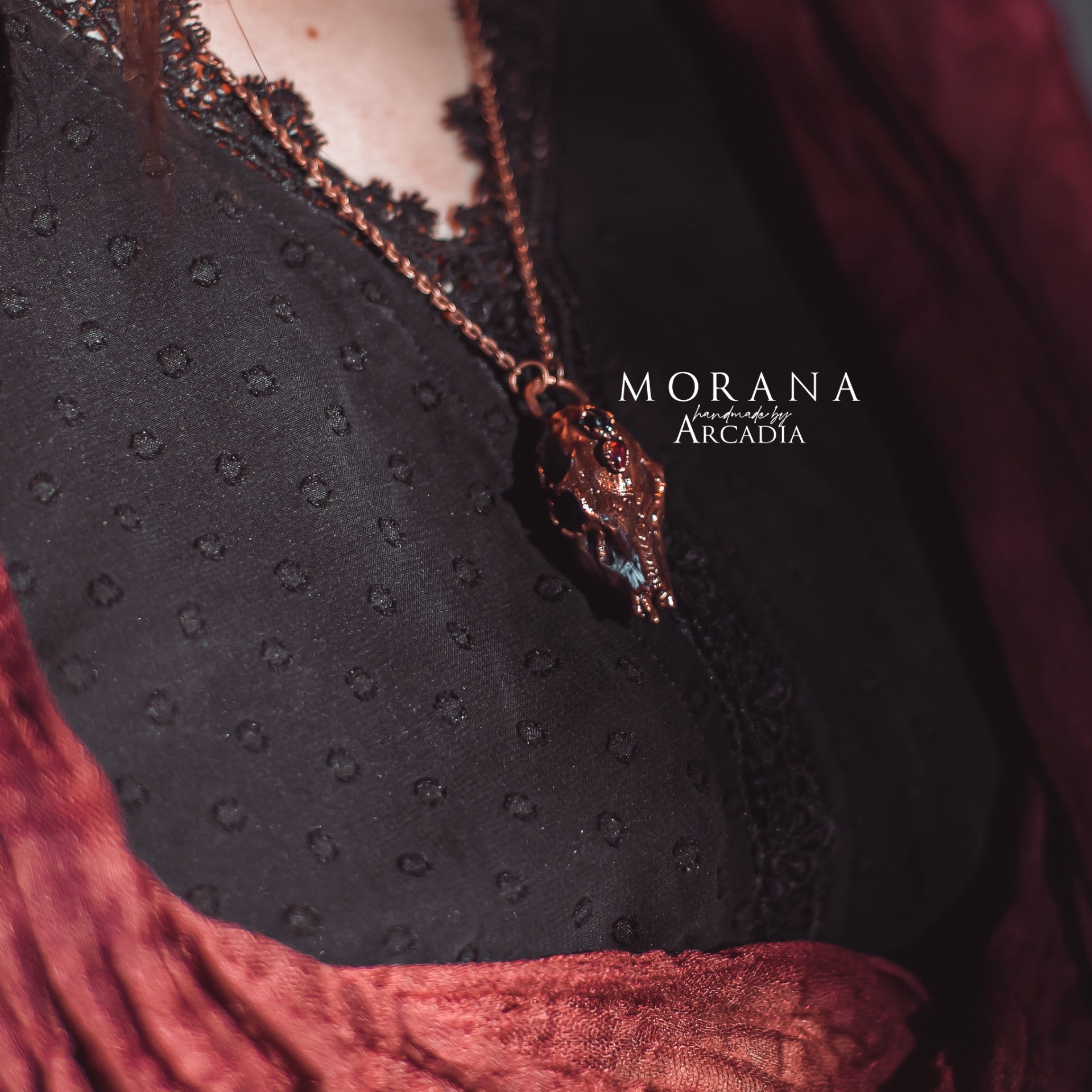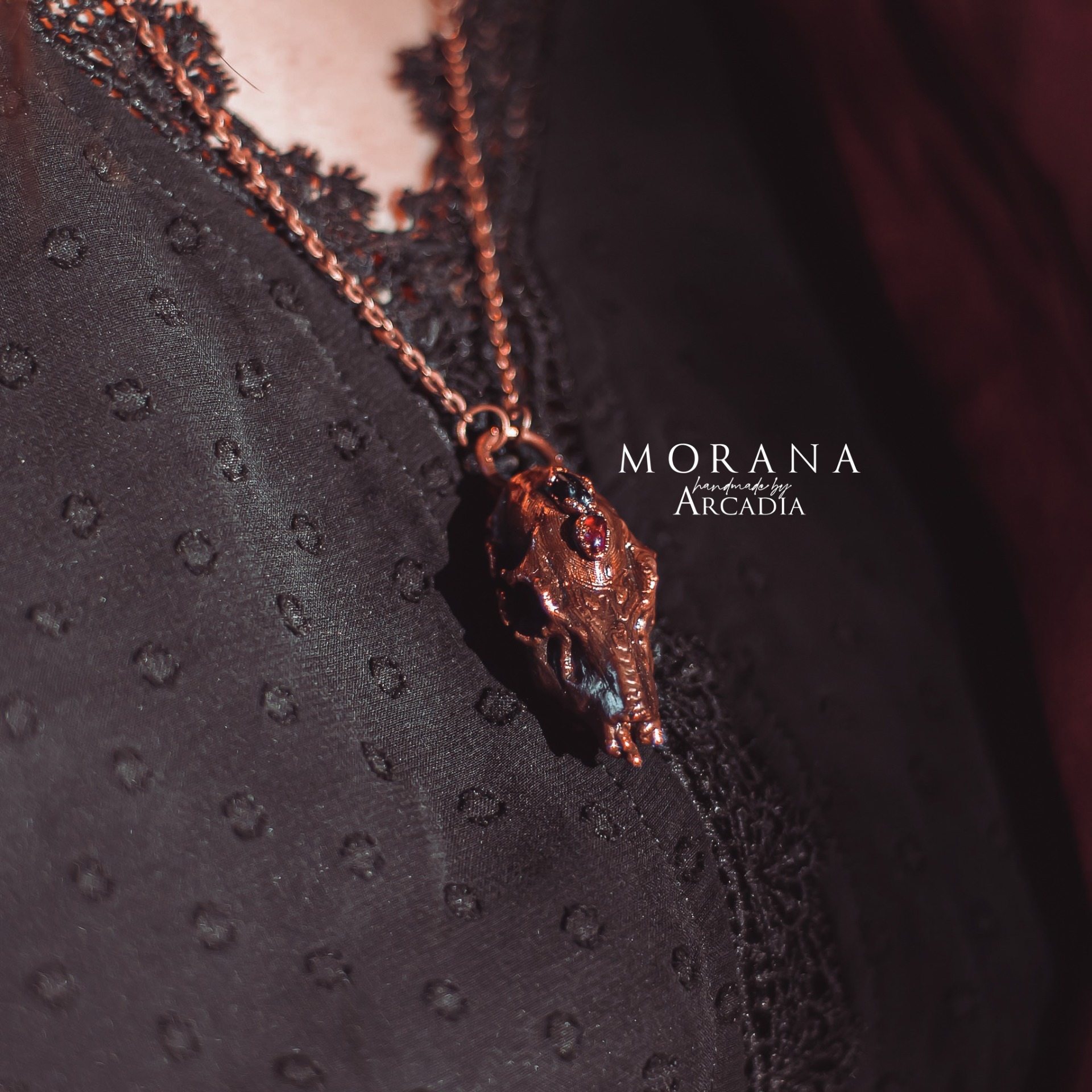 Náhrdelník s pokovenou srnčí lebkou ozdobenou africkými granáty ve vintage staroměděné patině. Jemný bižuterní řetízek. Vyrobeno rukama a srdcem v alchymistické dílně na severu Čech.