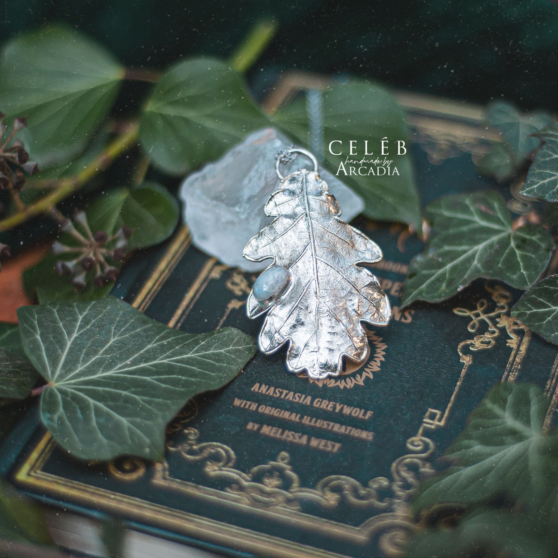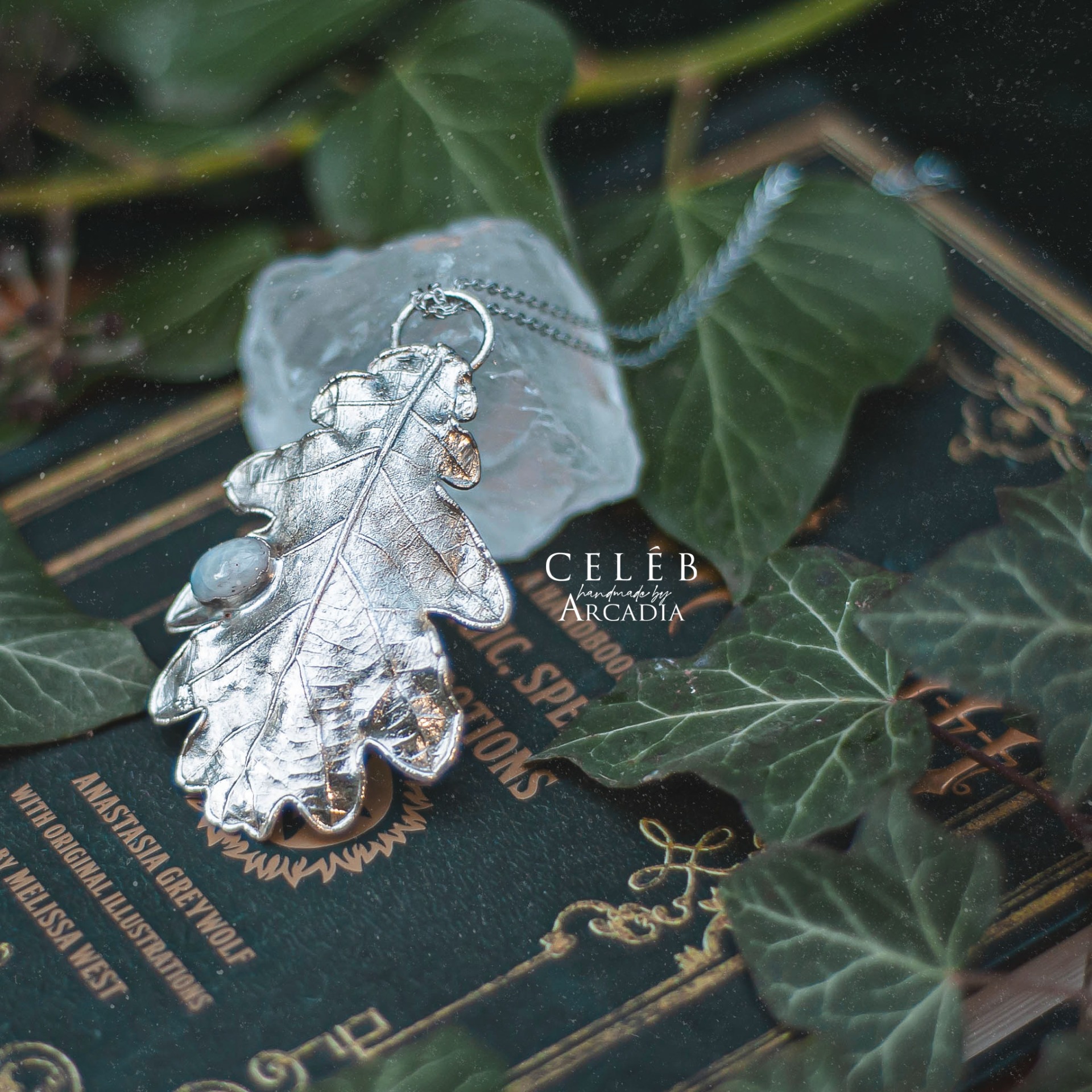 Náhrdelník se skutečným pokoveným dubovým lístkem s kabošonem měsíčního kamene. Jemný řetízek z nerezové oceli. Vyrobeno rukama a srdcem v alchymistické dílně na severu Čech.