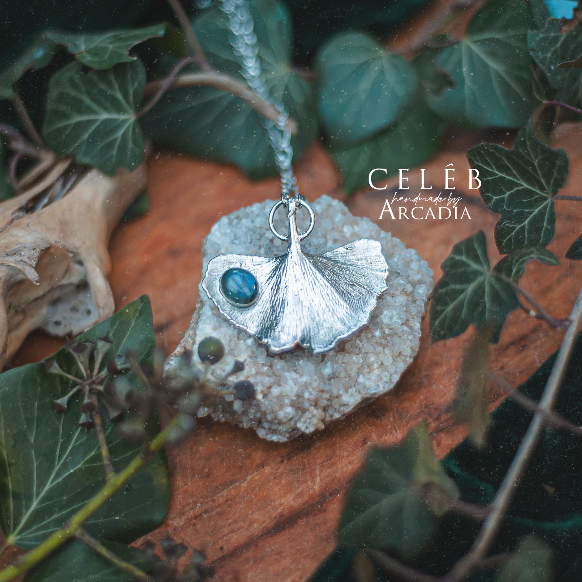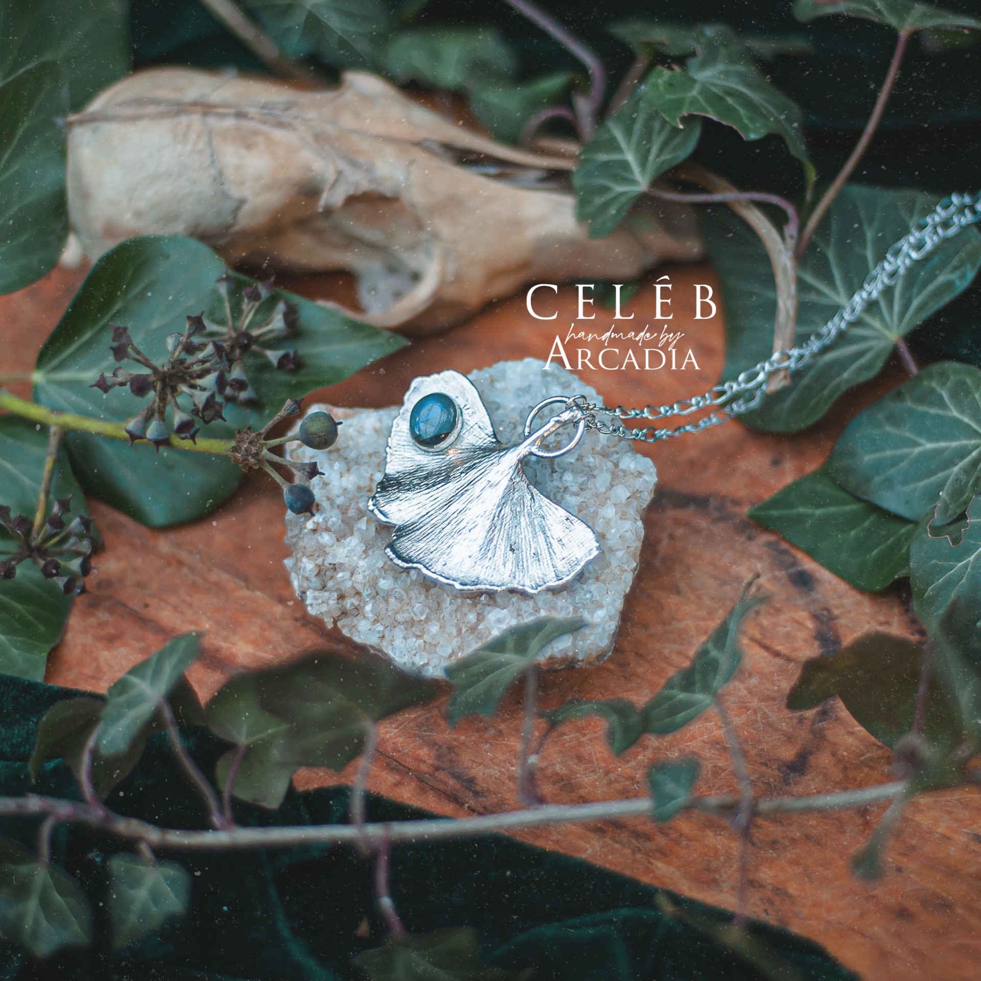 Náhrdelník se skutečným pokoveným lístkem ginka s kabošonem modrého labradoritu. Zdobný bižuterní řetízek. Vyrobeno rukama a srdcem v alchymistické dílně na severu Čech.