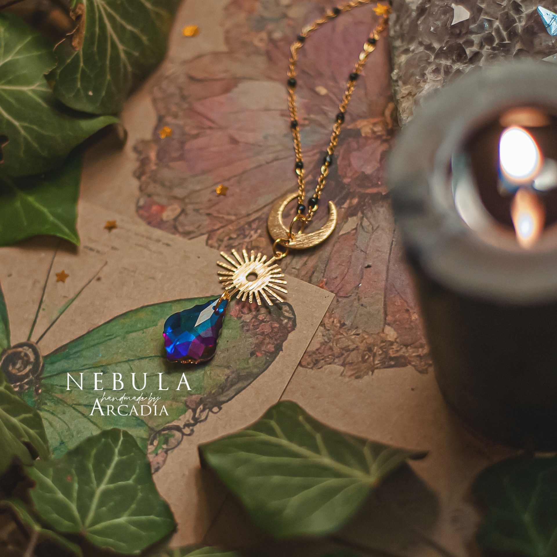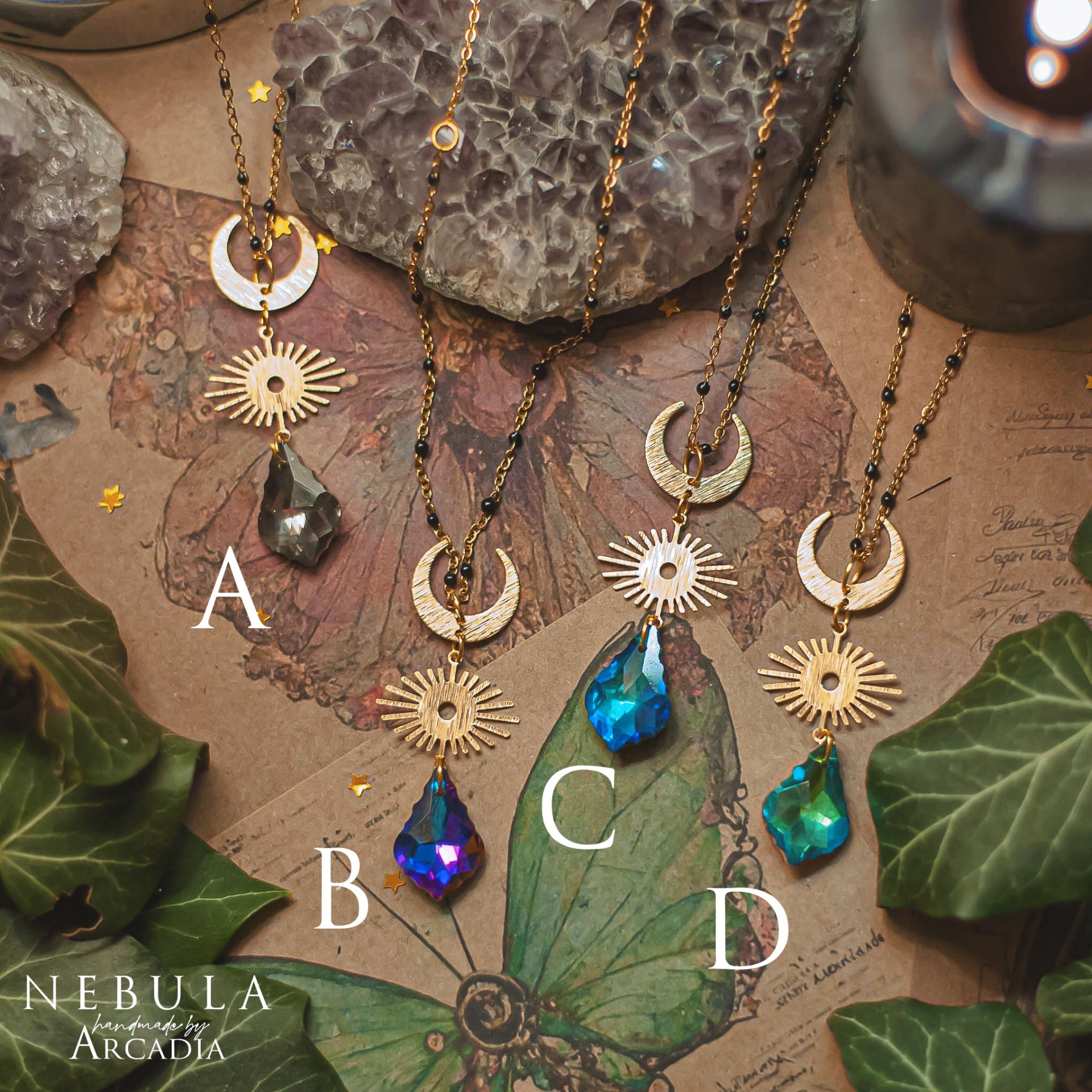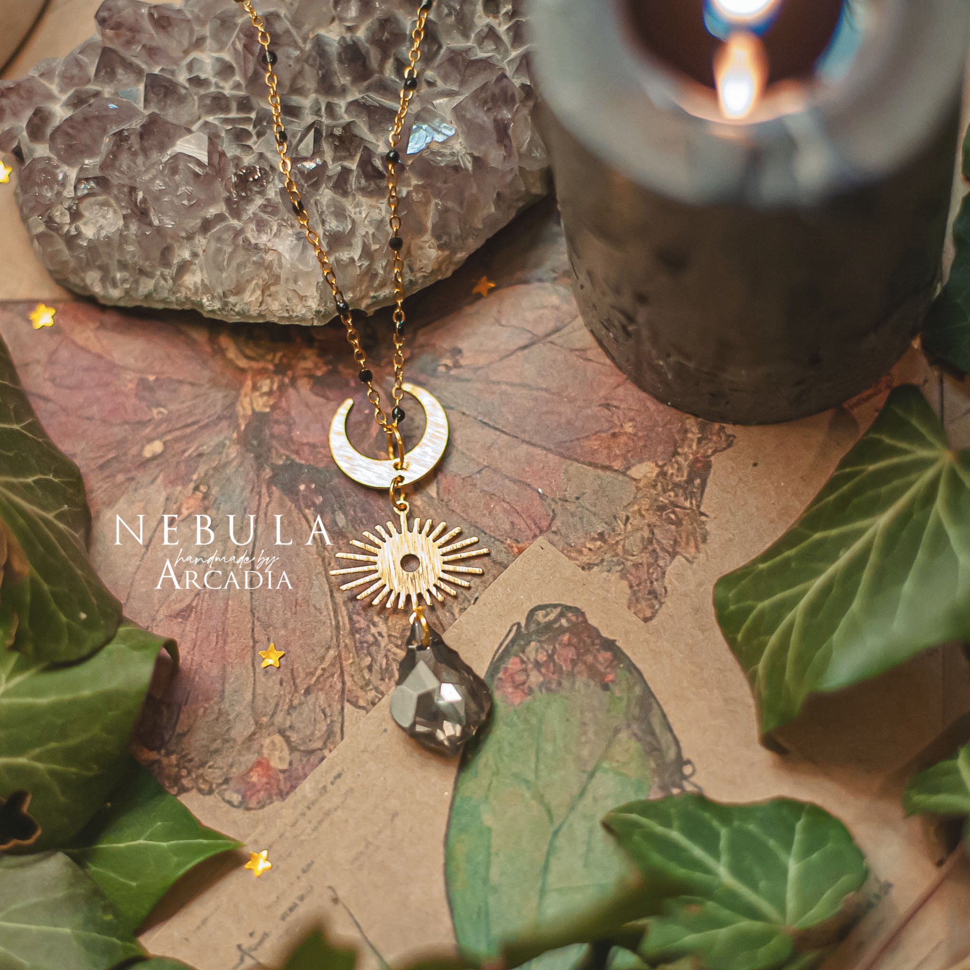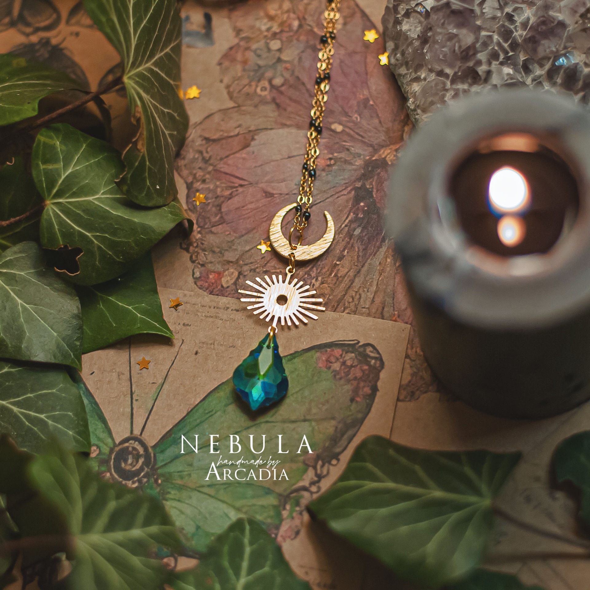 Náhrdelník s mosazným přívěskem s motivem měsíce a vševidoucího oka a skleněnou pokovenou slzou. Vyrobeno rukama a srdcem v alchymistické dílně na severu Čech.