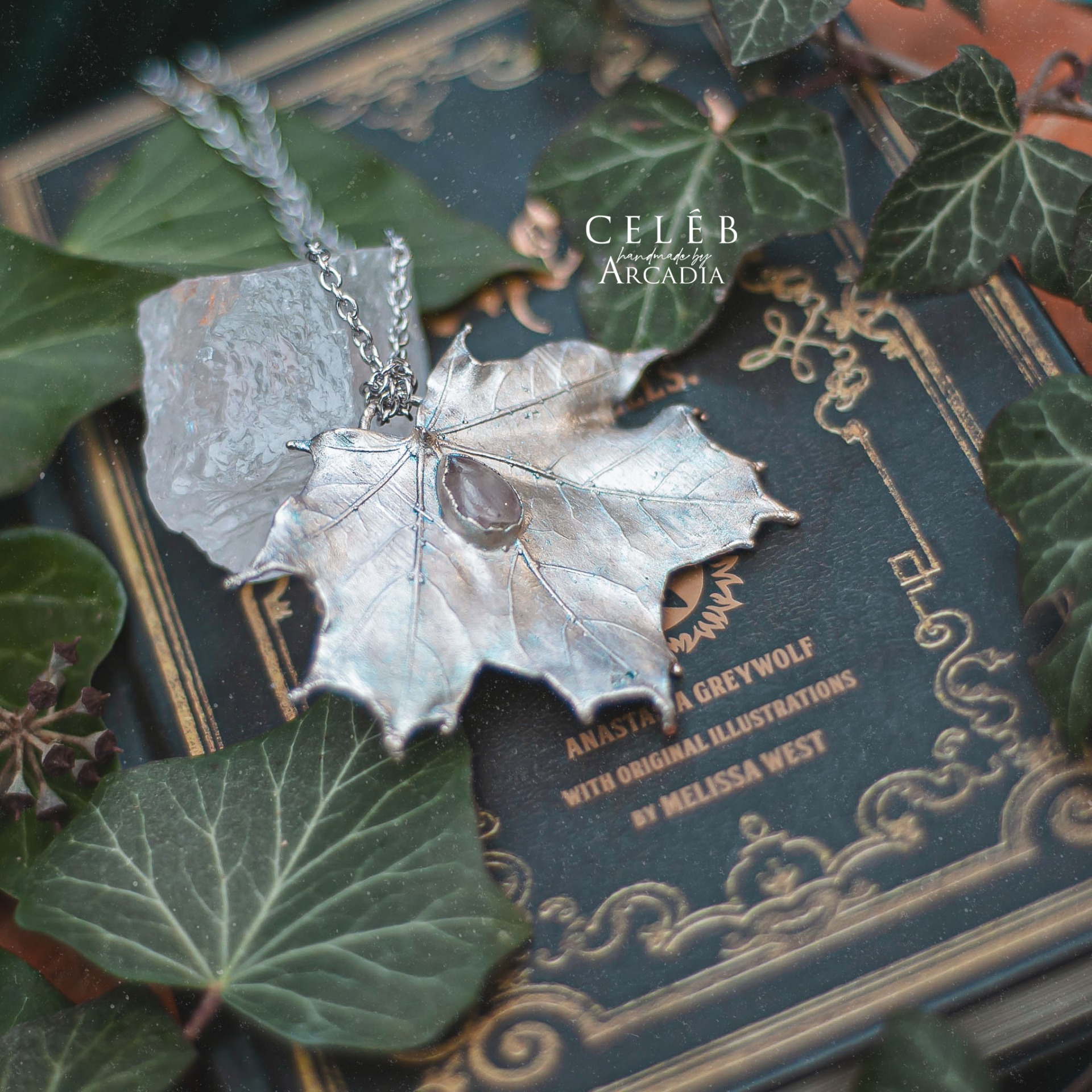 Náhrdelník se skutečným pokoveným lístkem javoru a kabošonem růženínu. Zdobeno jemným namodralým třpytem. Řetízek z nerezové oceli. Vyrobeno rukama a srdcem v alchymistické dílně na severu Čech.