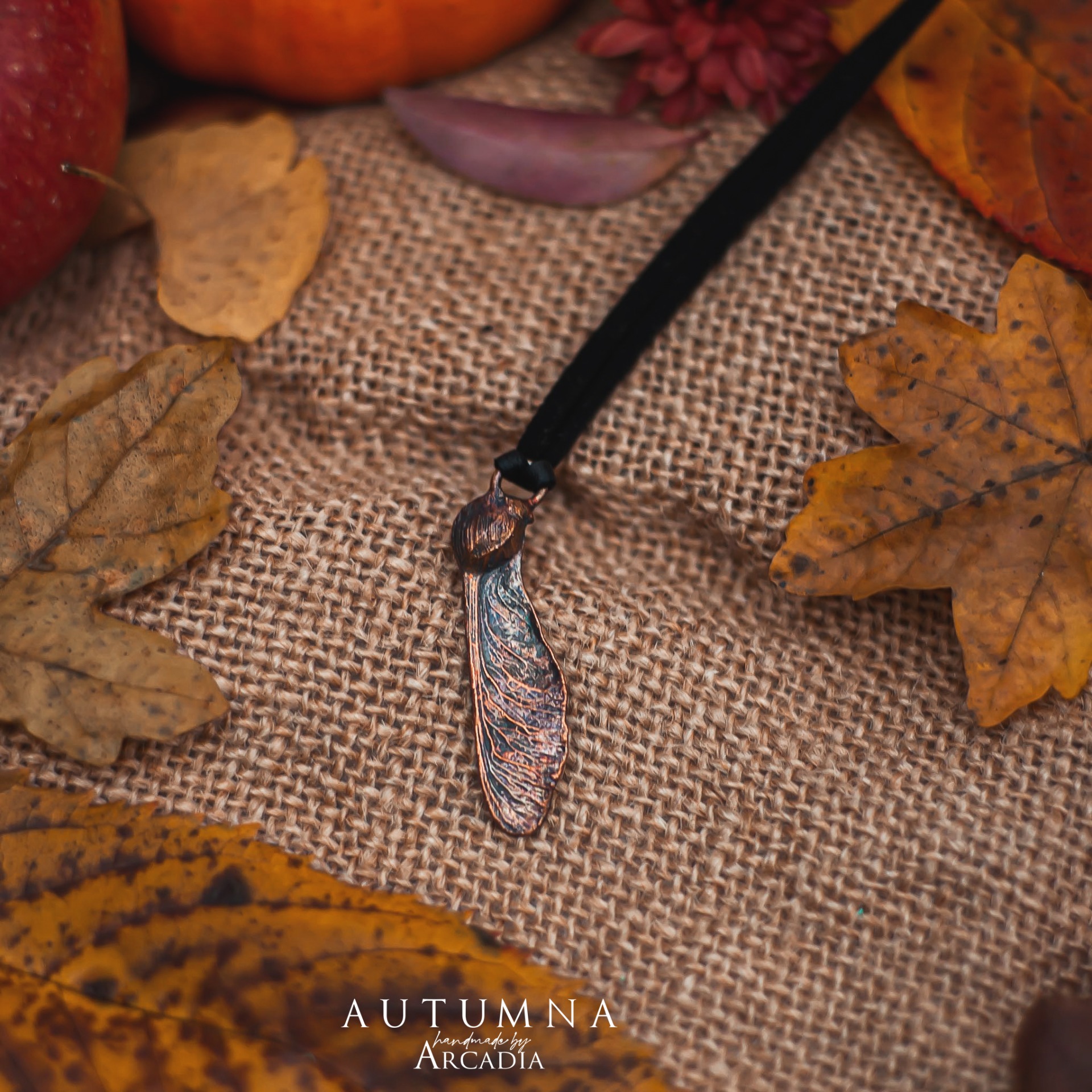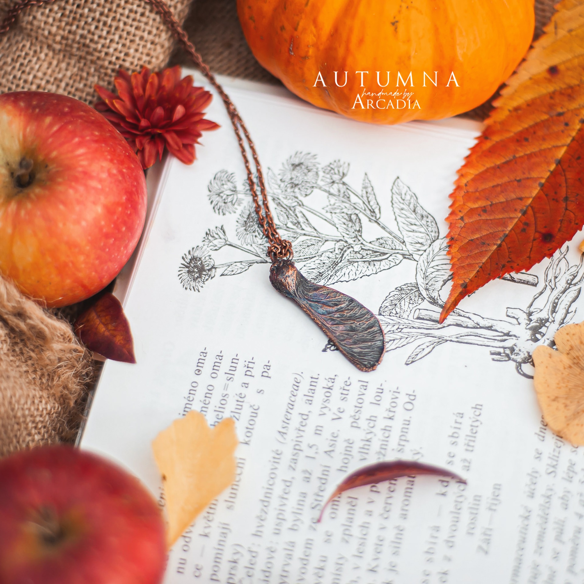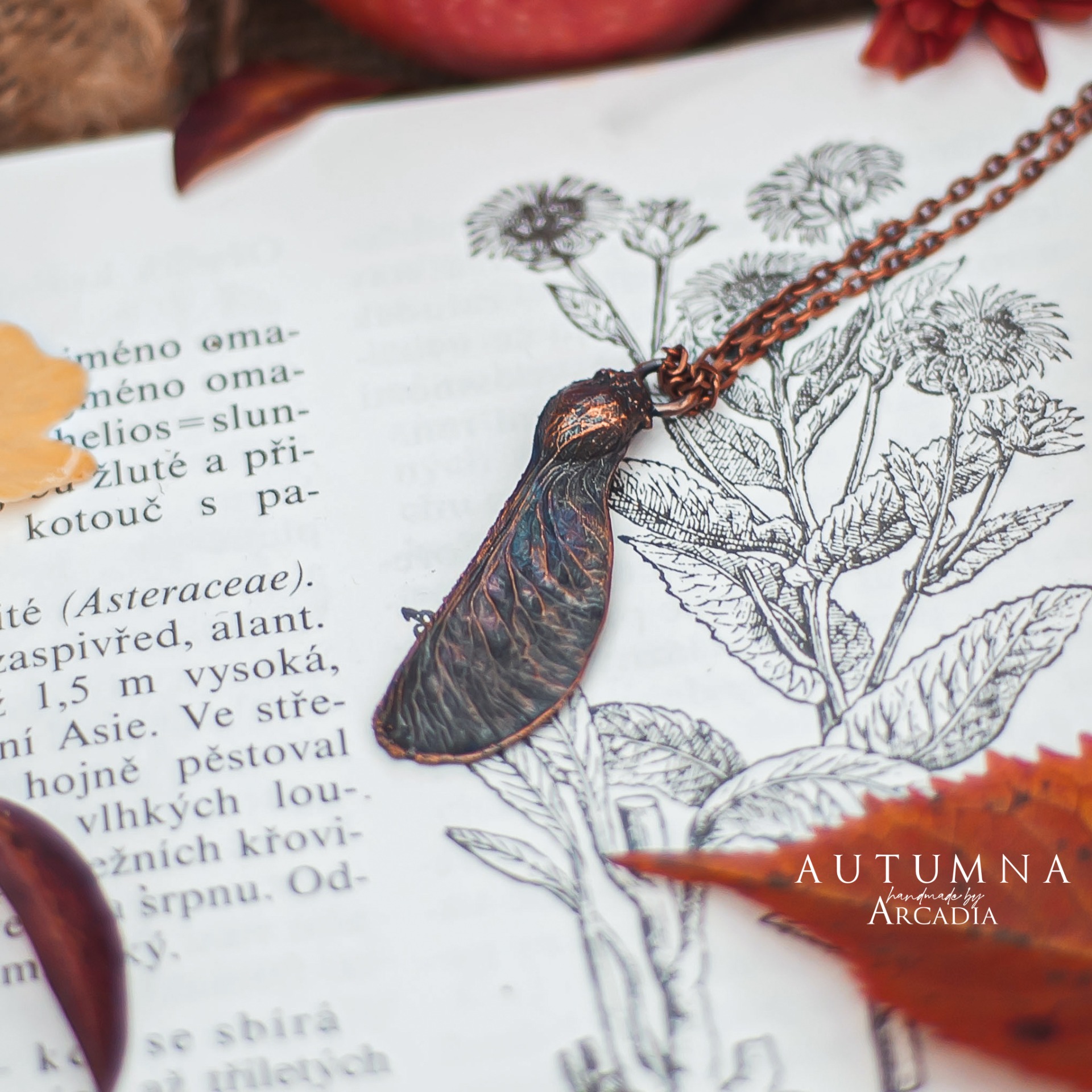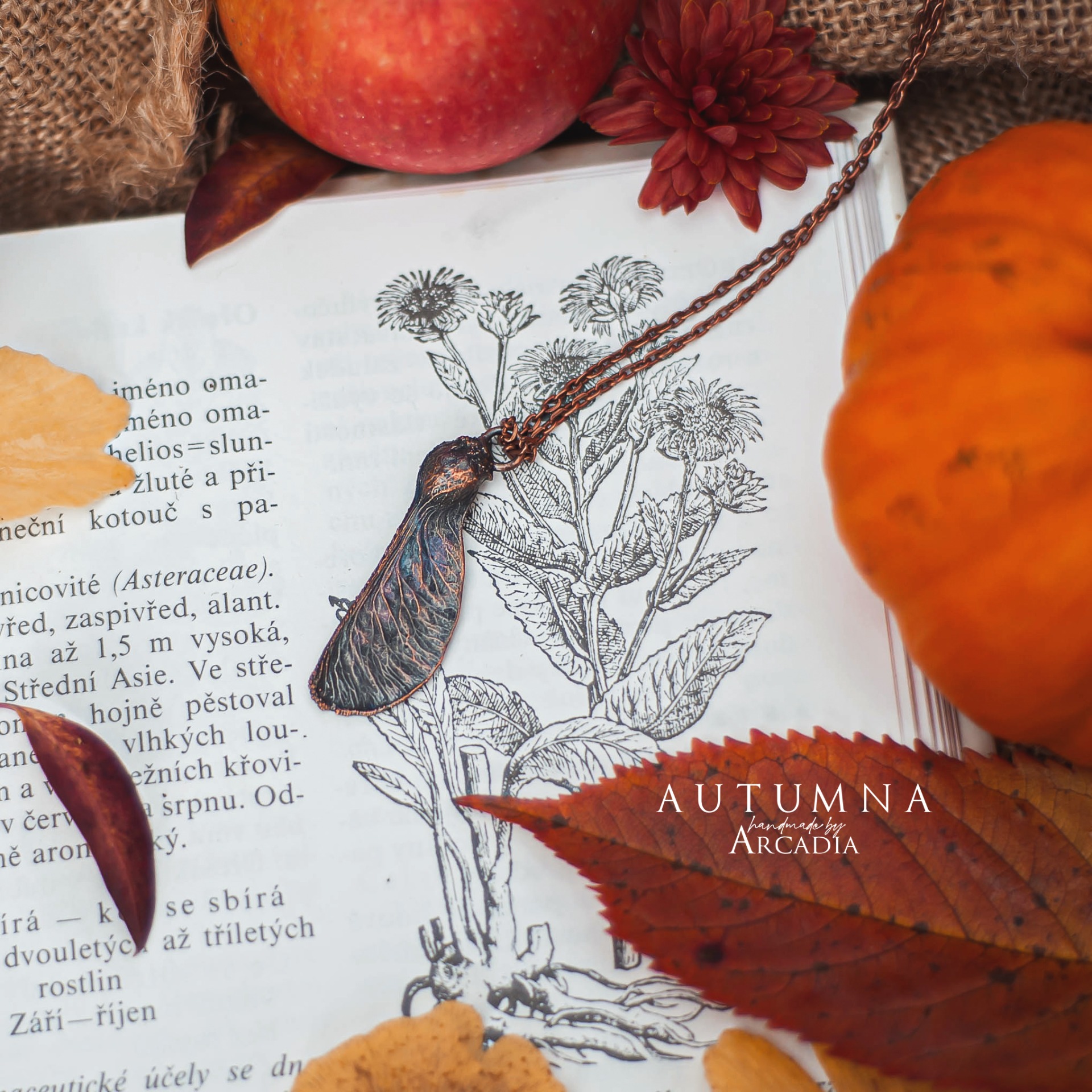 Náhrdelník s přívěskem ze skutečné pokovené javorové nažky ve staroměděné patině. Vyrobeno rukama a srdcem v alchymistické dílně na severu Čech.