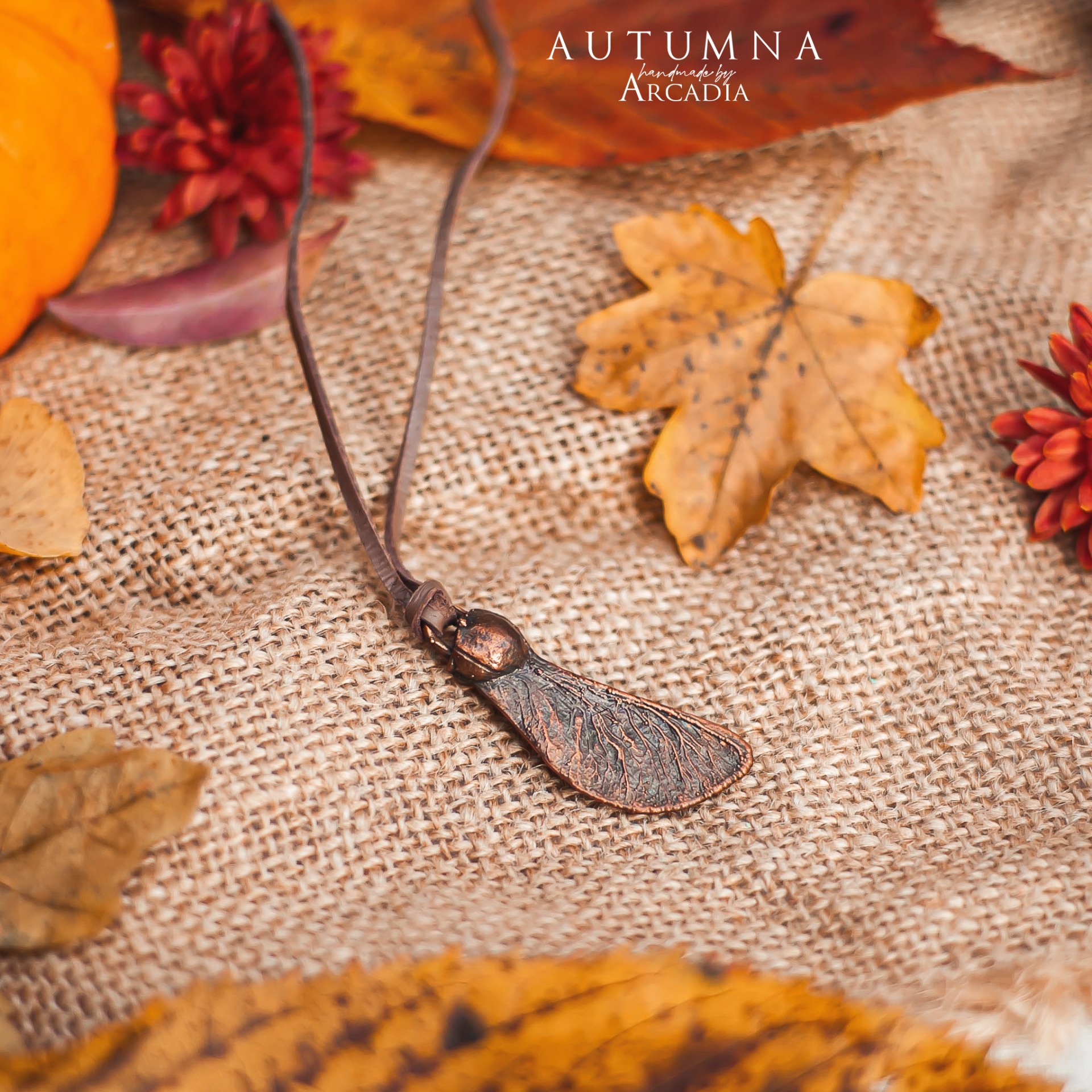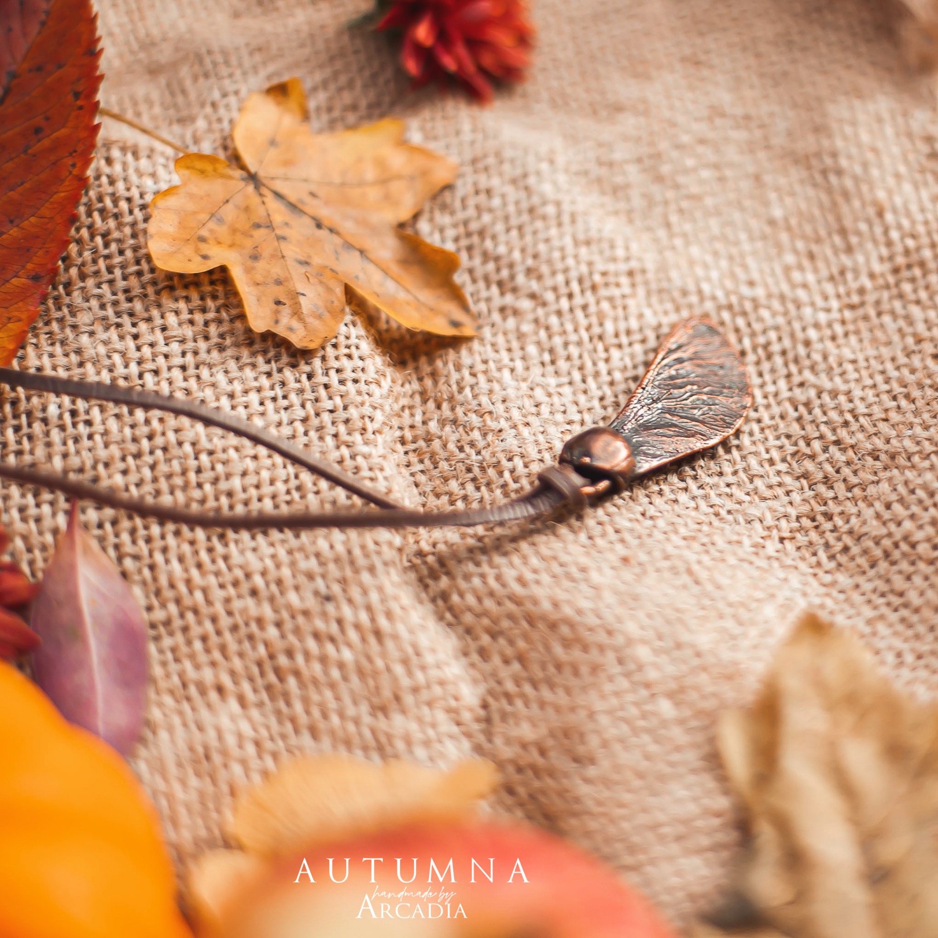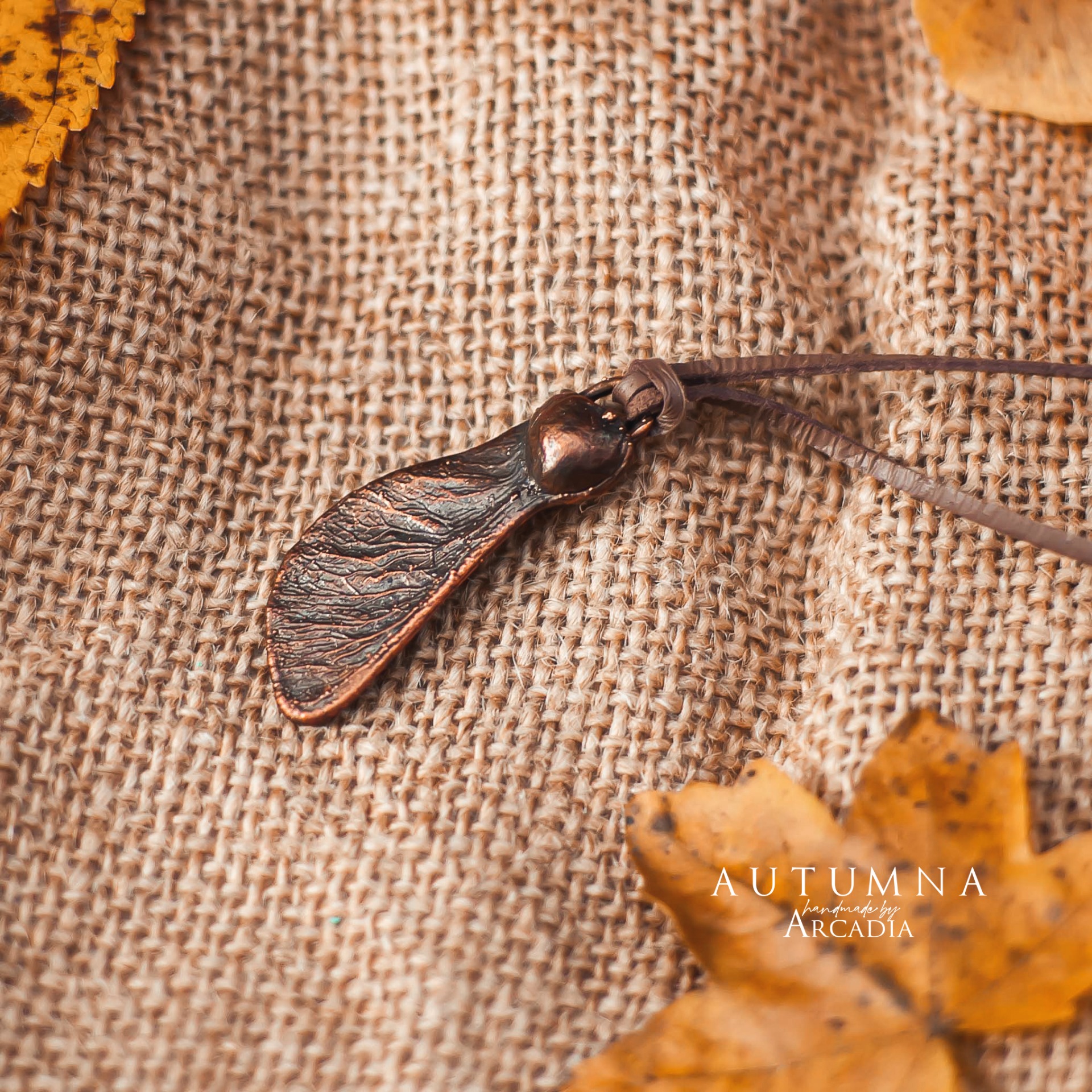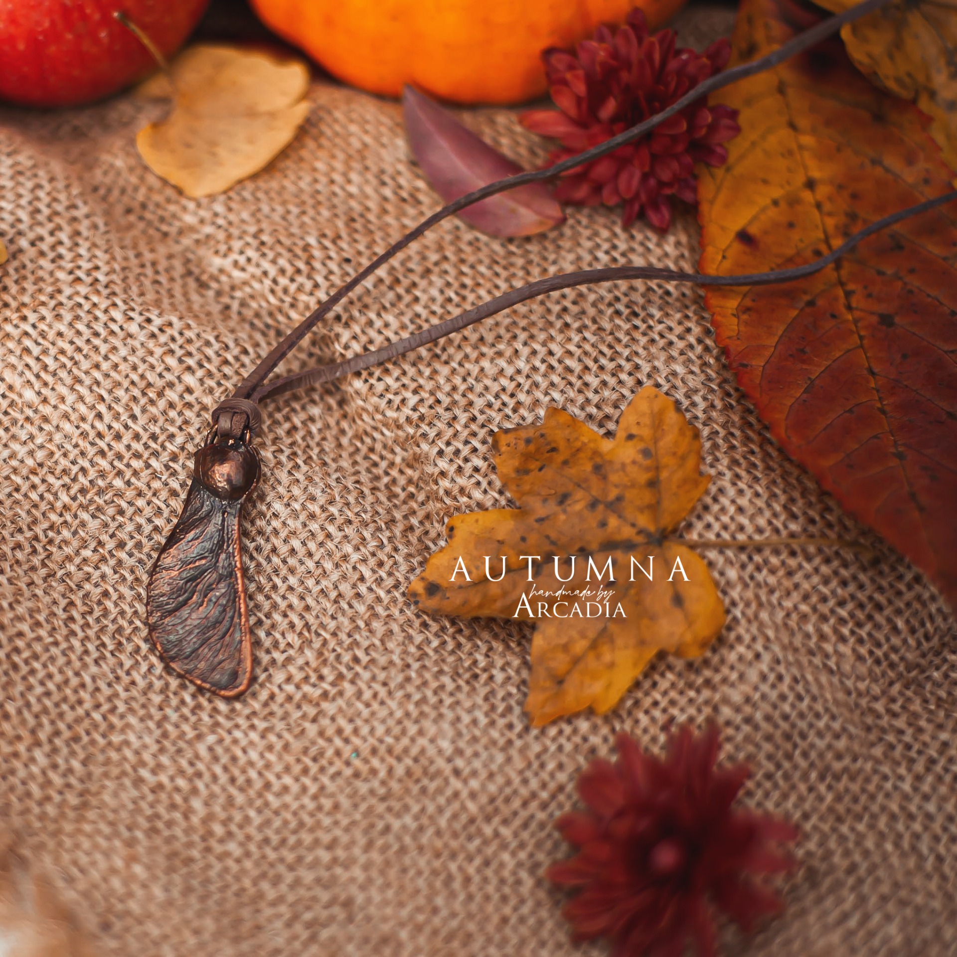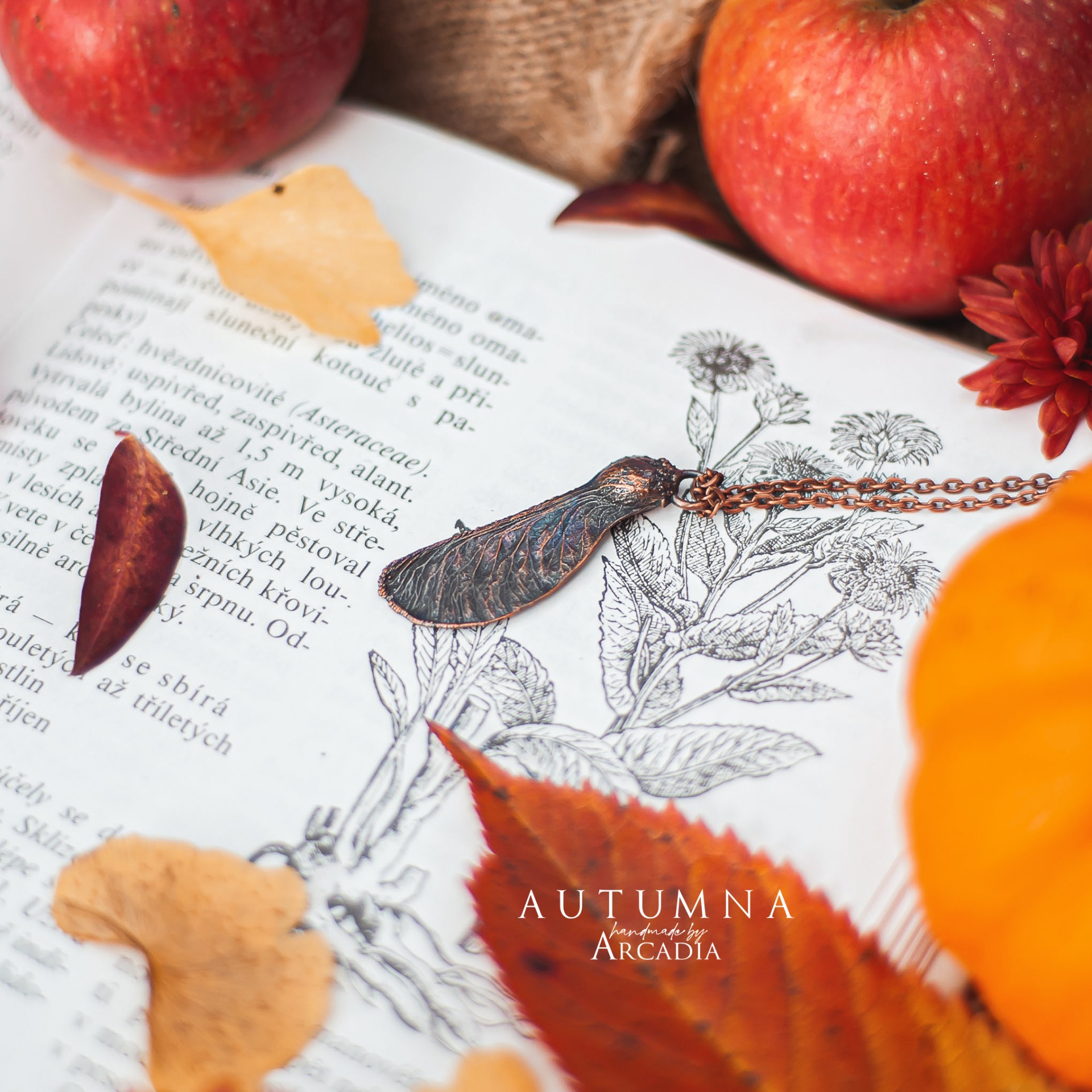 Náhrdelník s přívěskem ze skutečné pokovené javorové nažky ve staroměděné patině. Vyrobeno rukama a srdcem v alchymistické dílně na severu Čech.