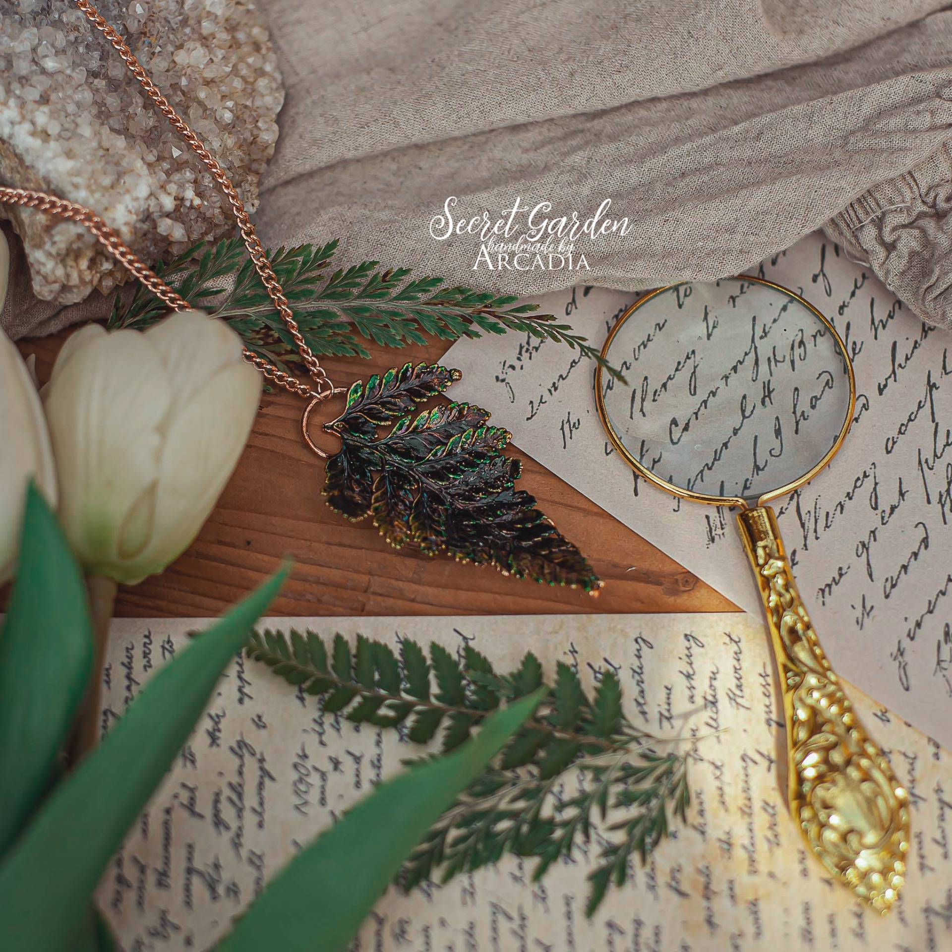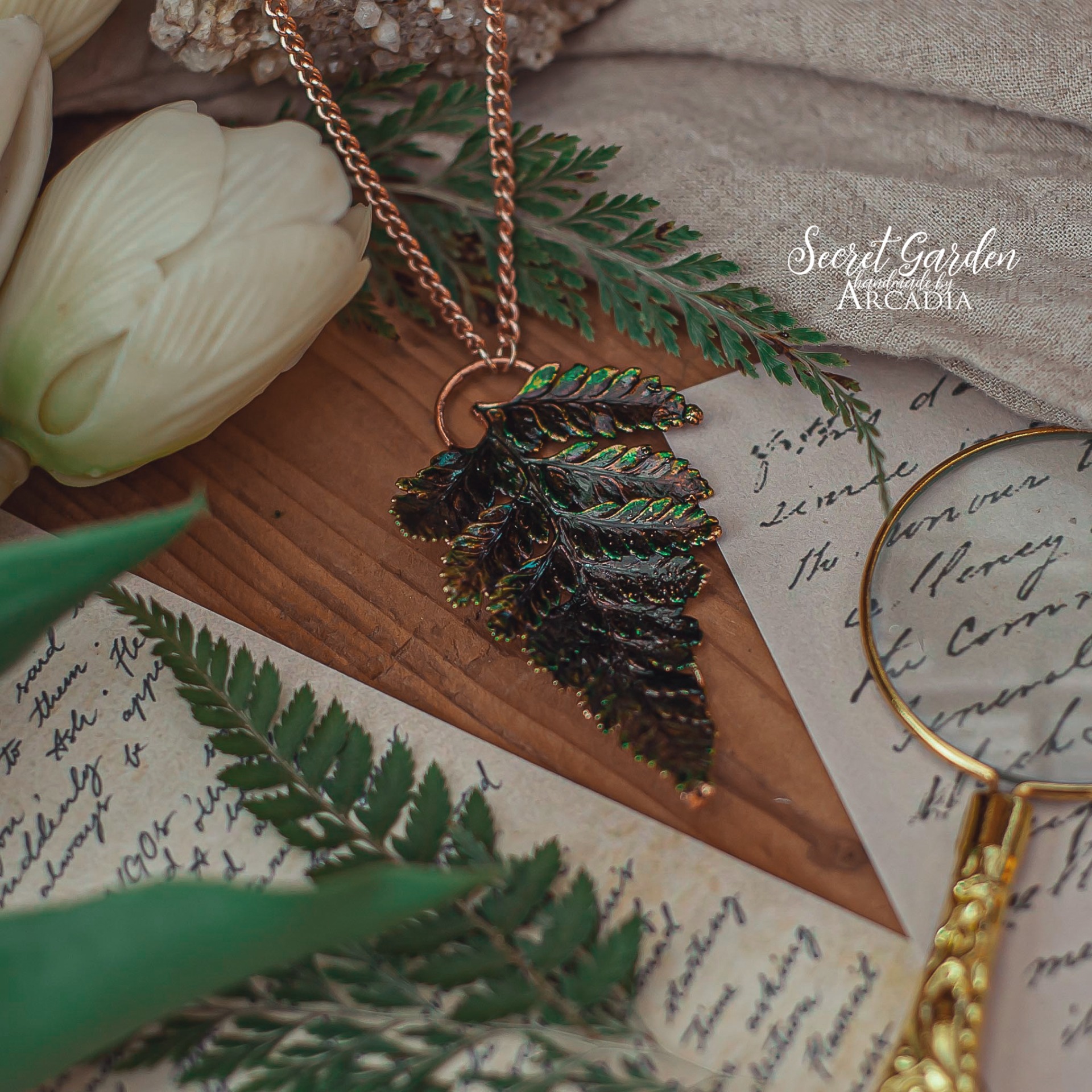 Náhrdelník s přívěskem ze skutečné pokovené kapradiny v olejově zelenkavém provedení. Kratší zdobný rosegold řetízek z nerezové oceli. Vyrobeno rukama a srdcem v alchymistické dílně na severu Čech.