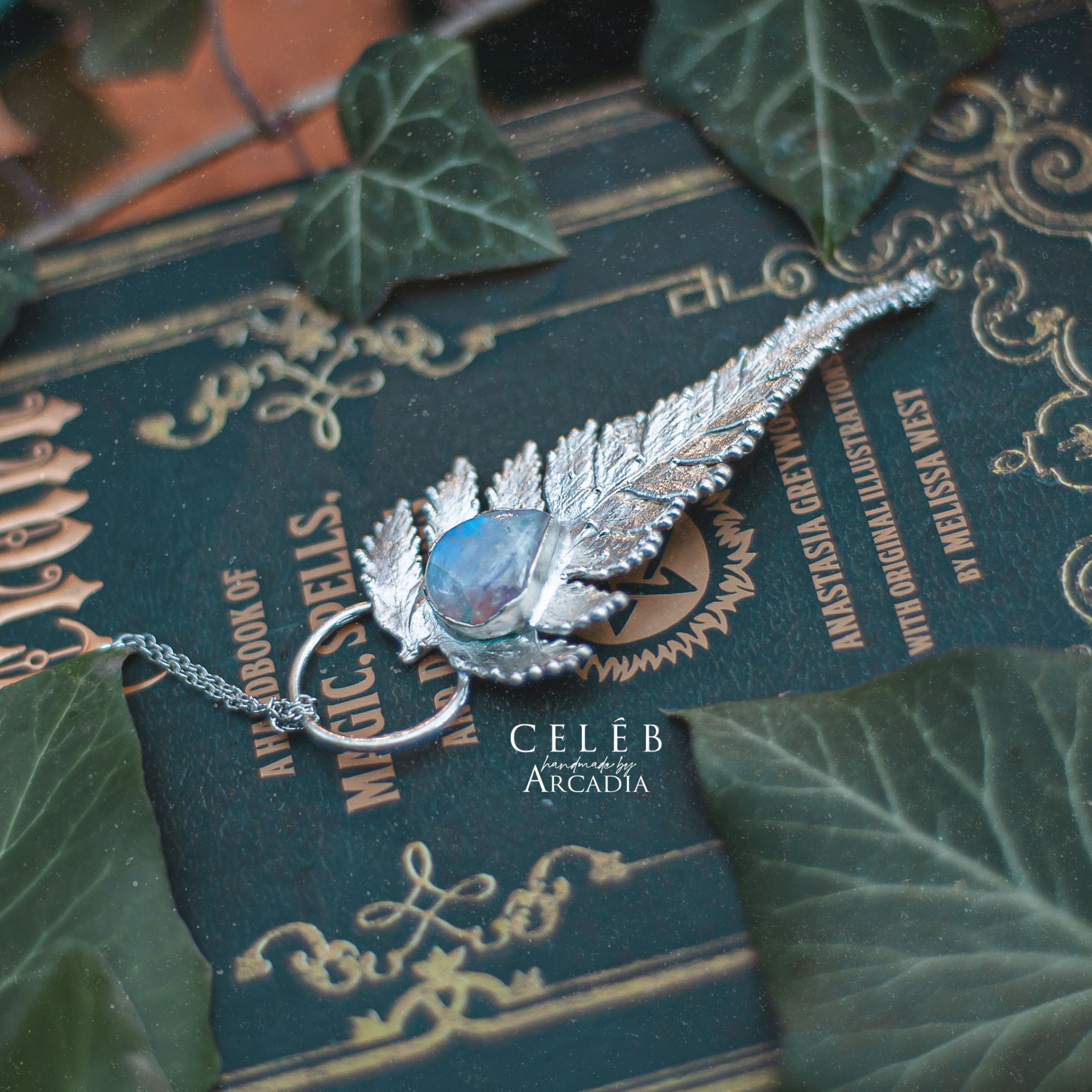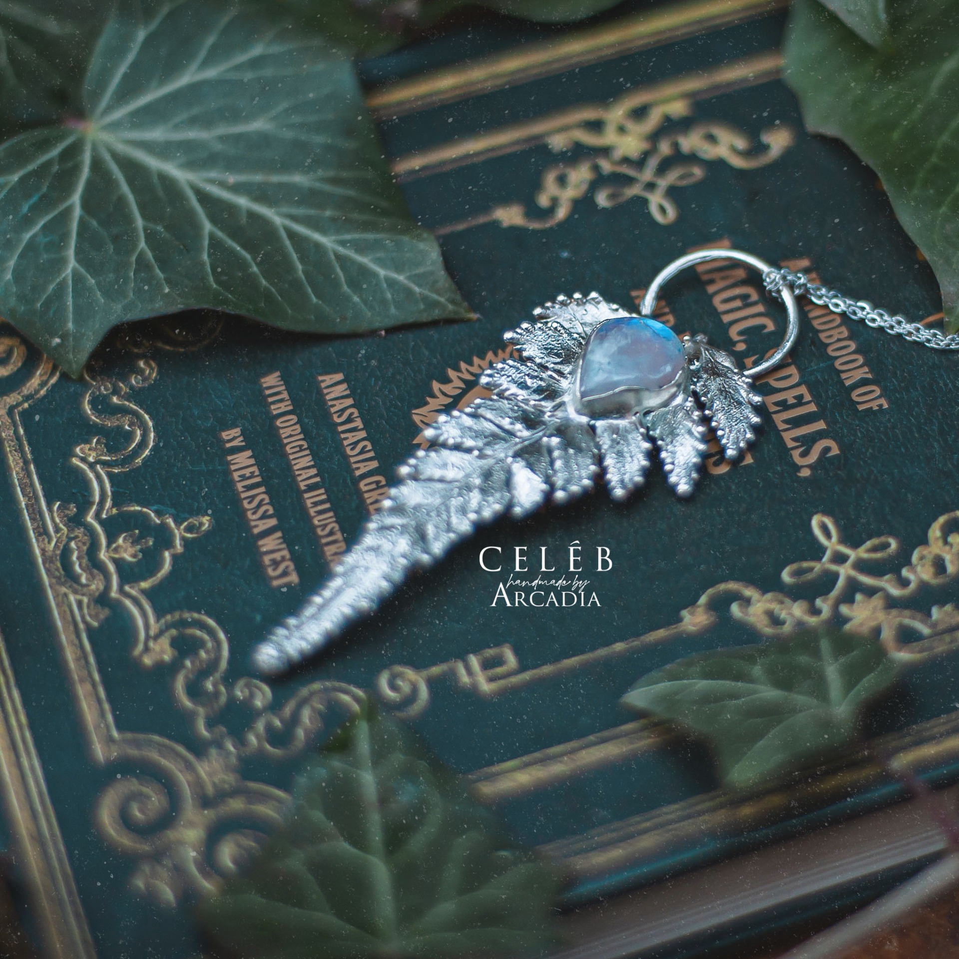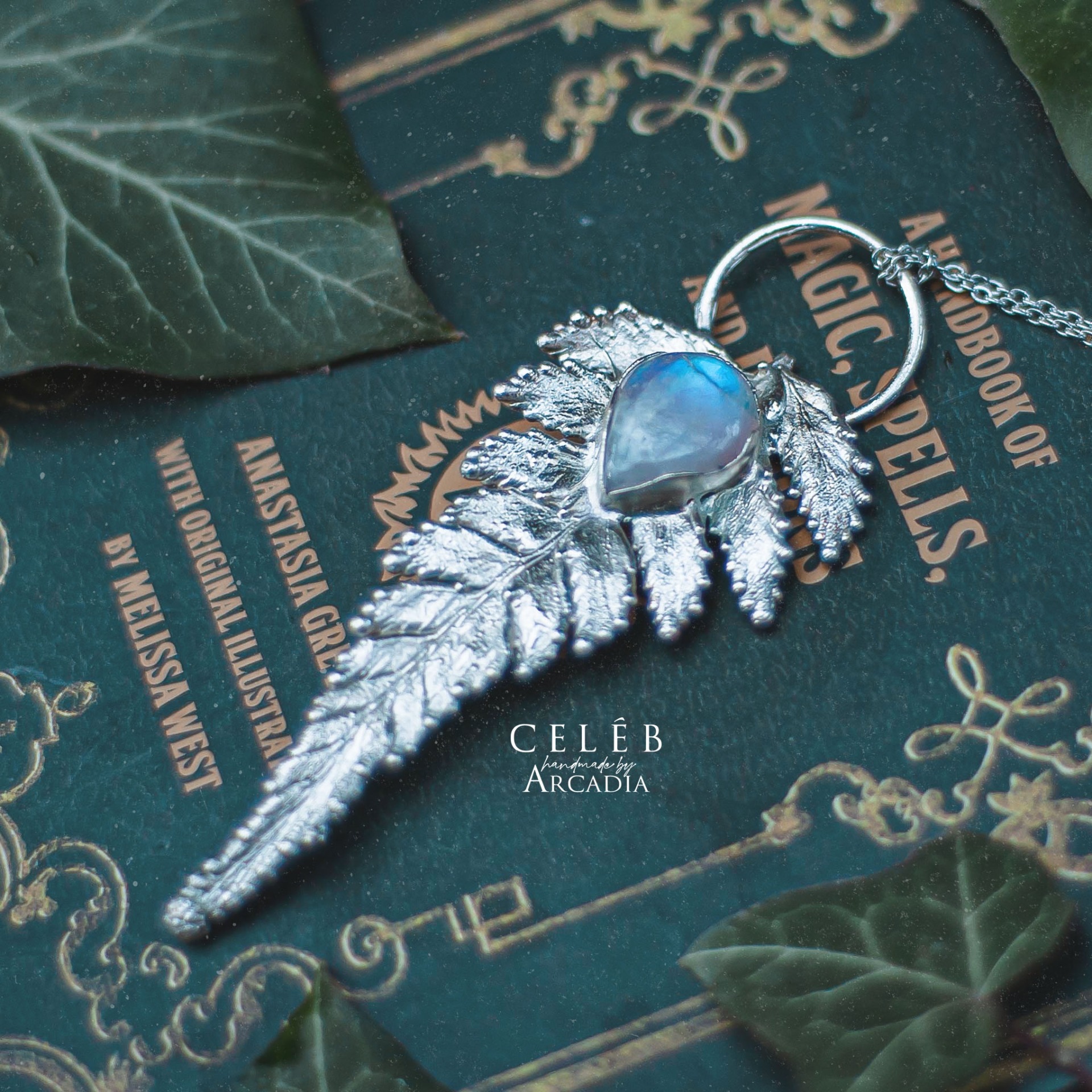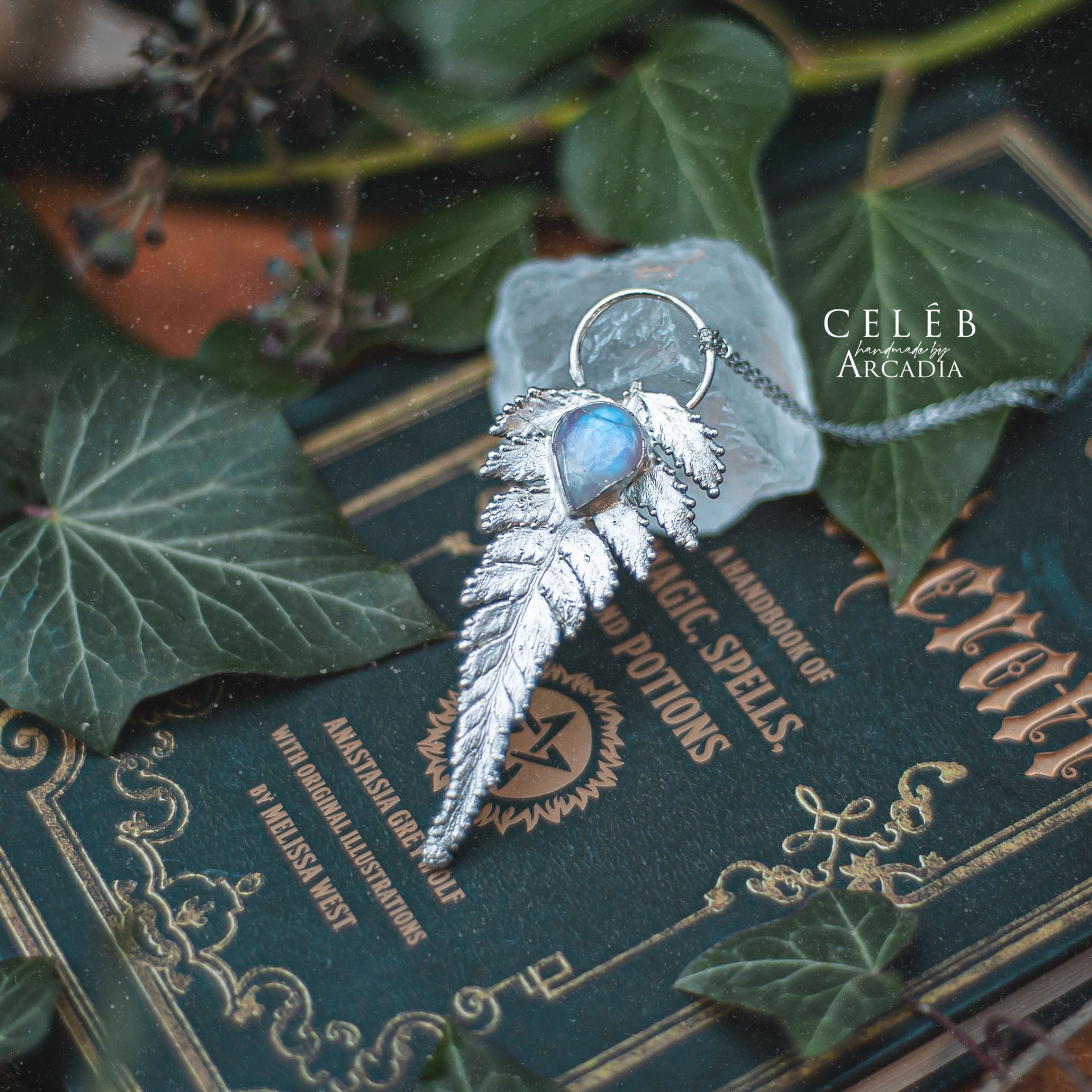 Náhrdelník s přívěskem ze skutečné pokovené kapradiny ozdobené kabošonem měsíčního kamene. Jemný řetízek z nerezové oceli. Vyrobeno rukama a srdcem v alchymistické dílně na severu Čech.